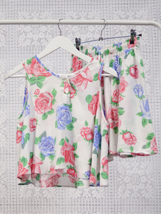 1980s St Michael white, red and blue rose floral print vest and shorts twin set