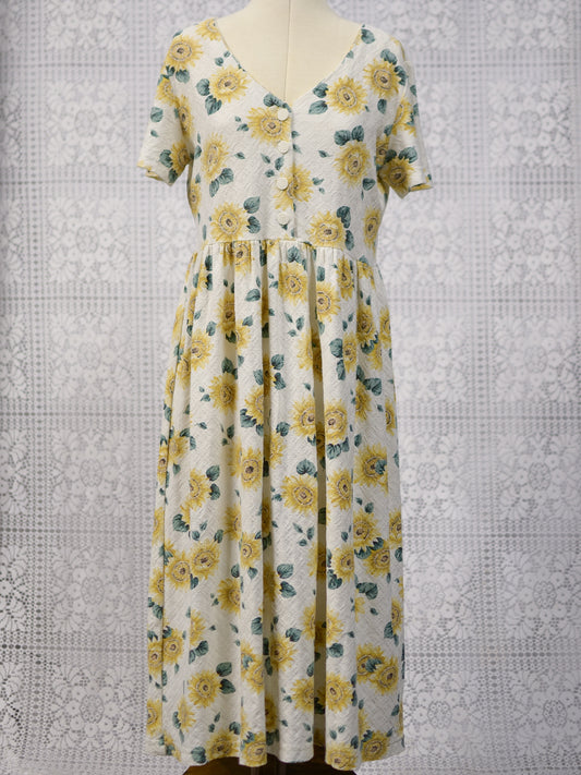 1990s cream and yellow sunflower print short sleeve lace maxi dress