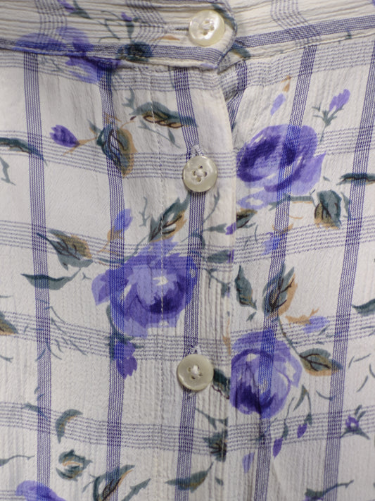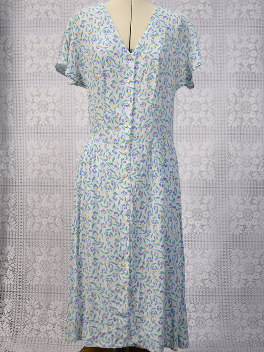 1990s St Michael white, blue and green floral pattern button through short sleeve midi dress