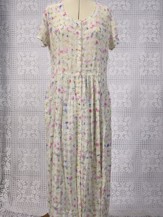 Y2K St Michael cream and pink gingham floral button through short sleeve maxi dress