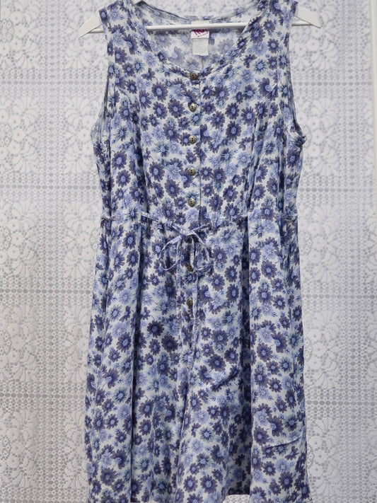 1990s white and blue daisy print sleeveless tie waist playsuit