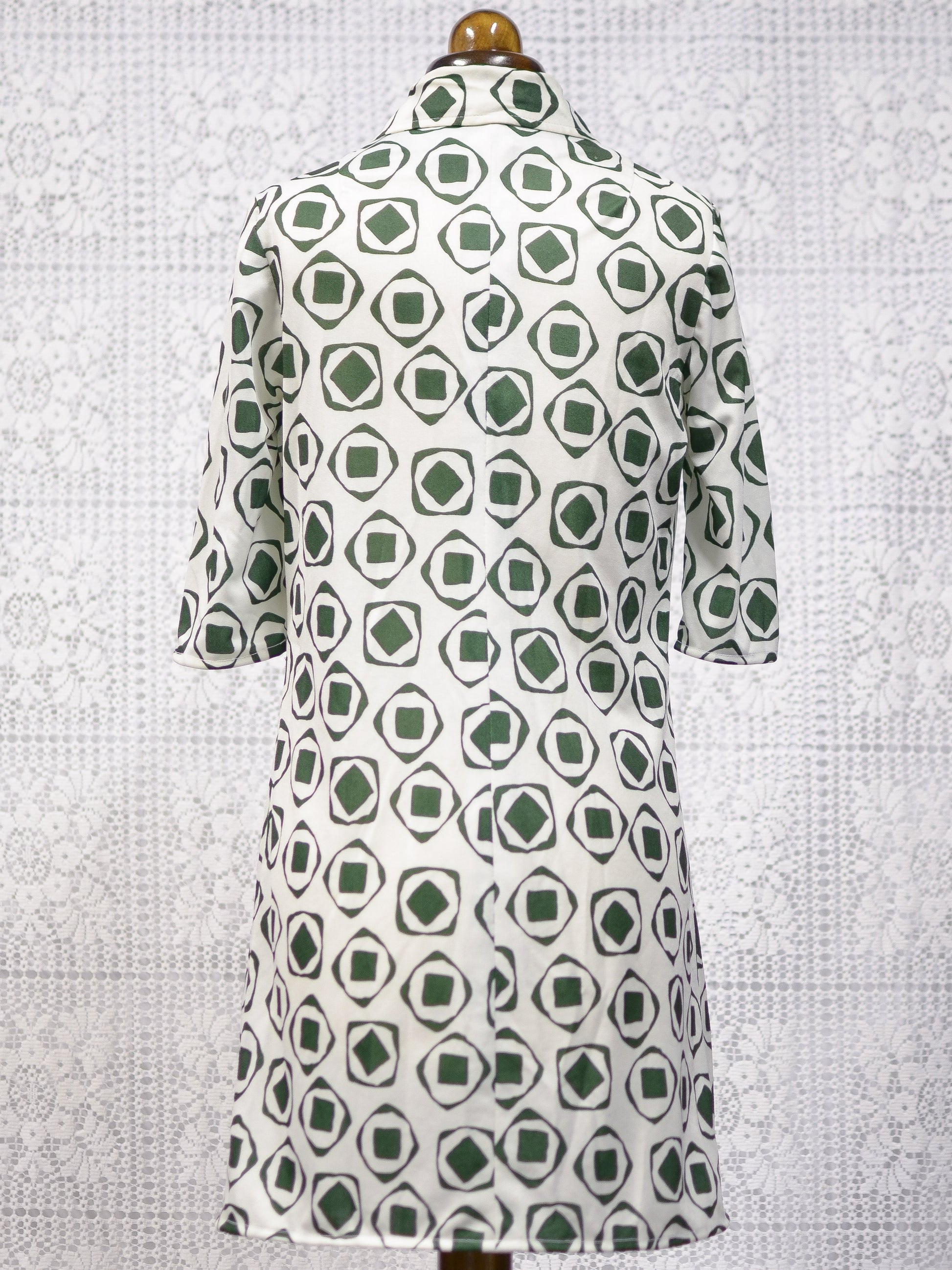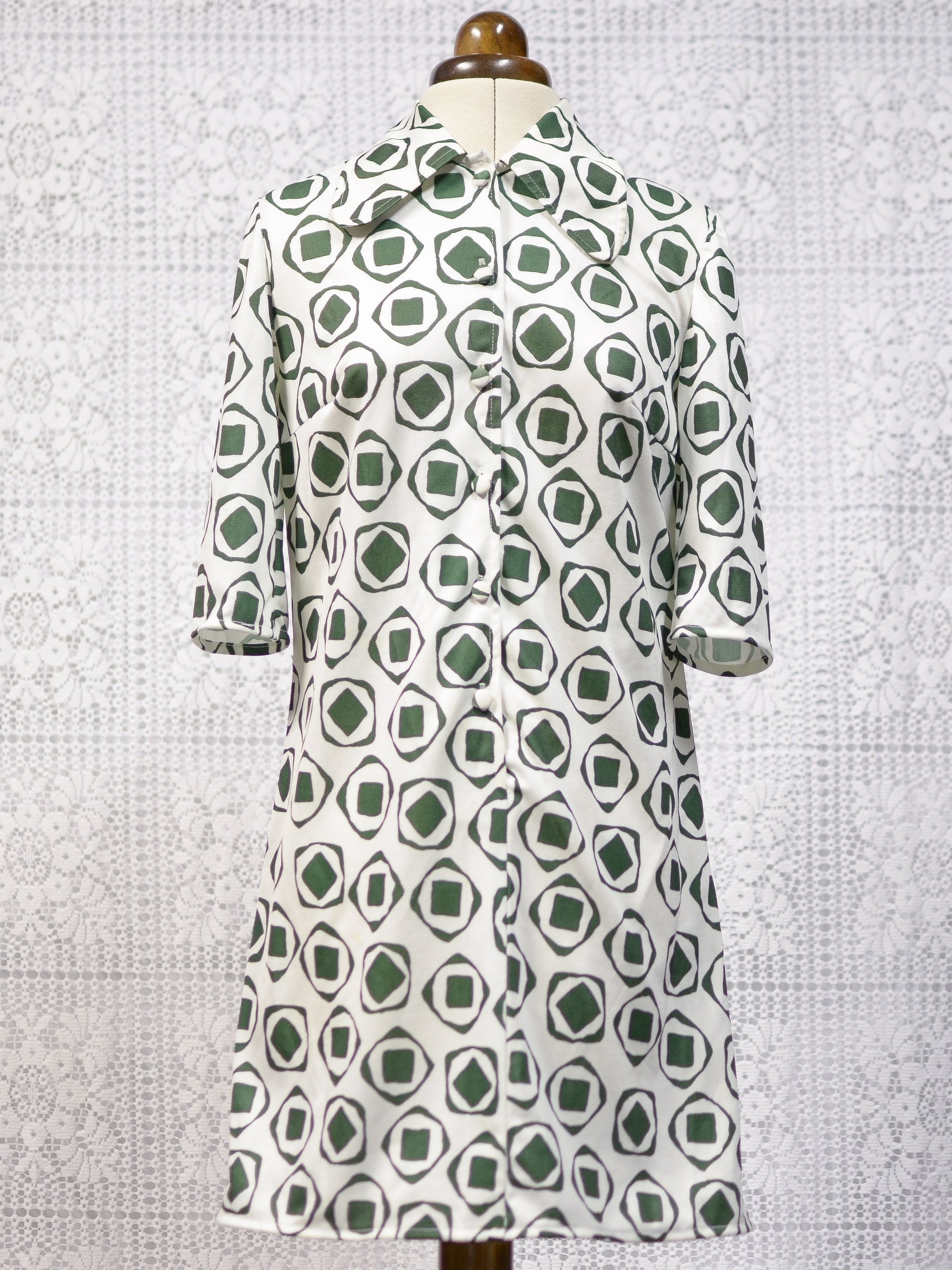 A brilliant 1960s mod-style collared mini dress from British brand St Michael, featuring a green abstract pattern (circles in triangles) on a white background. It also has 3/4 length sleeves.