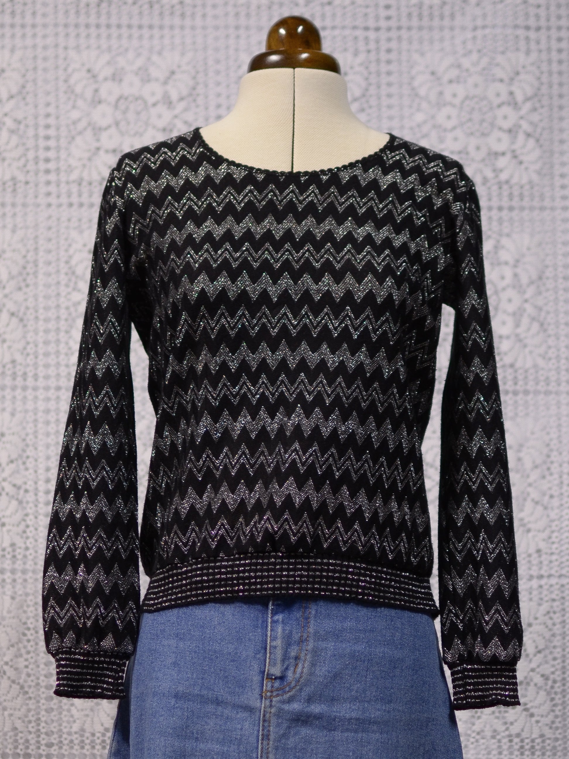 1970s black and silver zig zag lightweight fitted scoop neck jumper