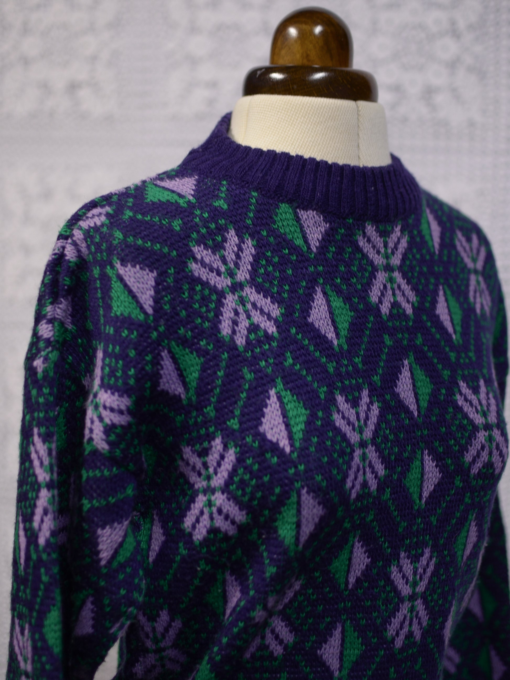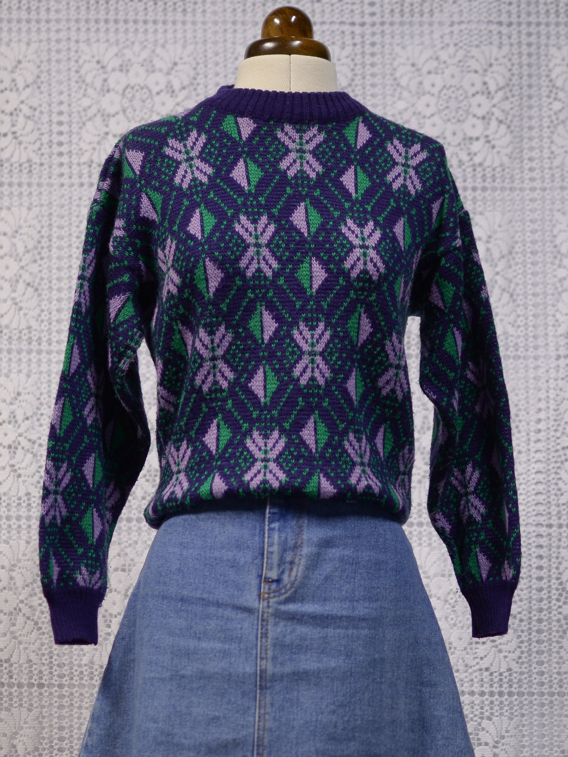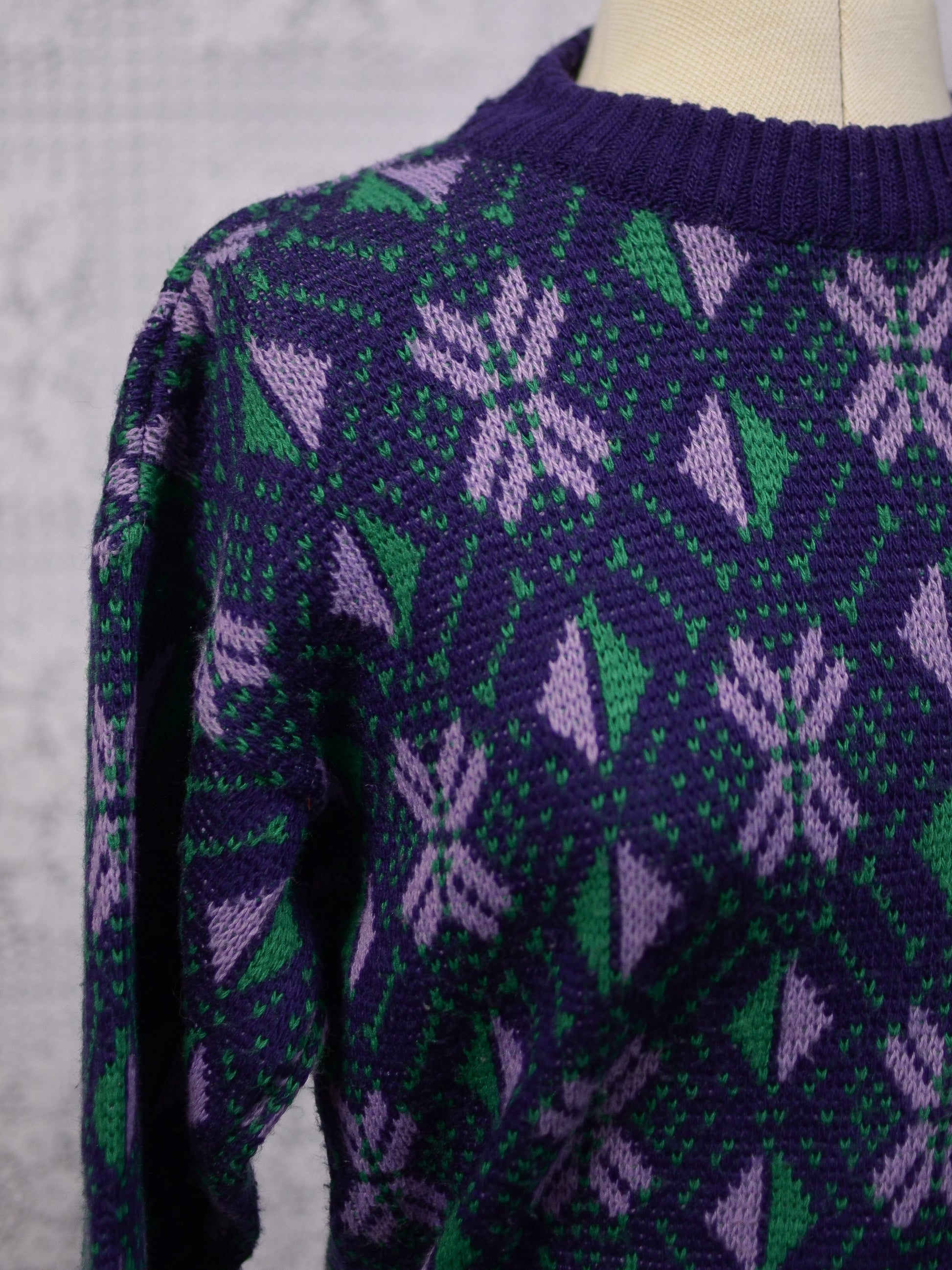 1970s blue, purple and green nordic style snowflake festive jumper