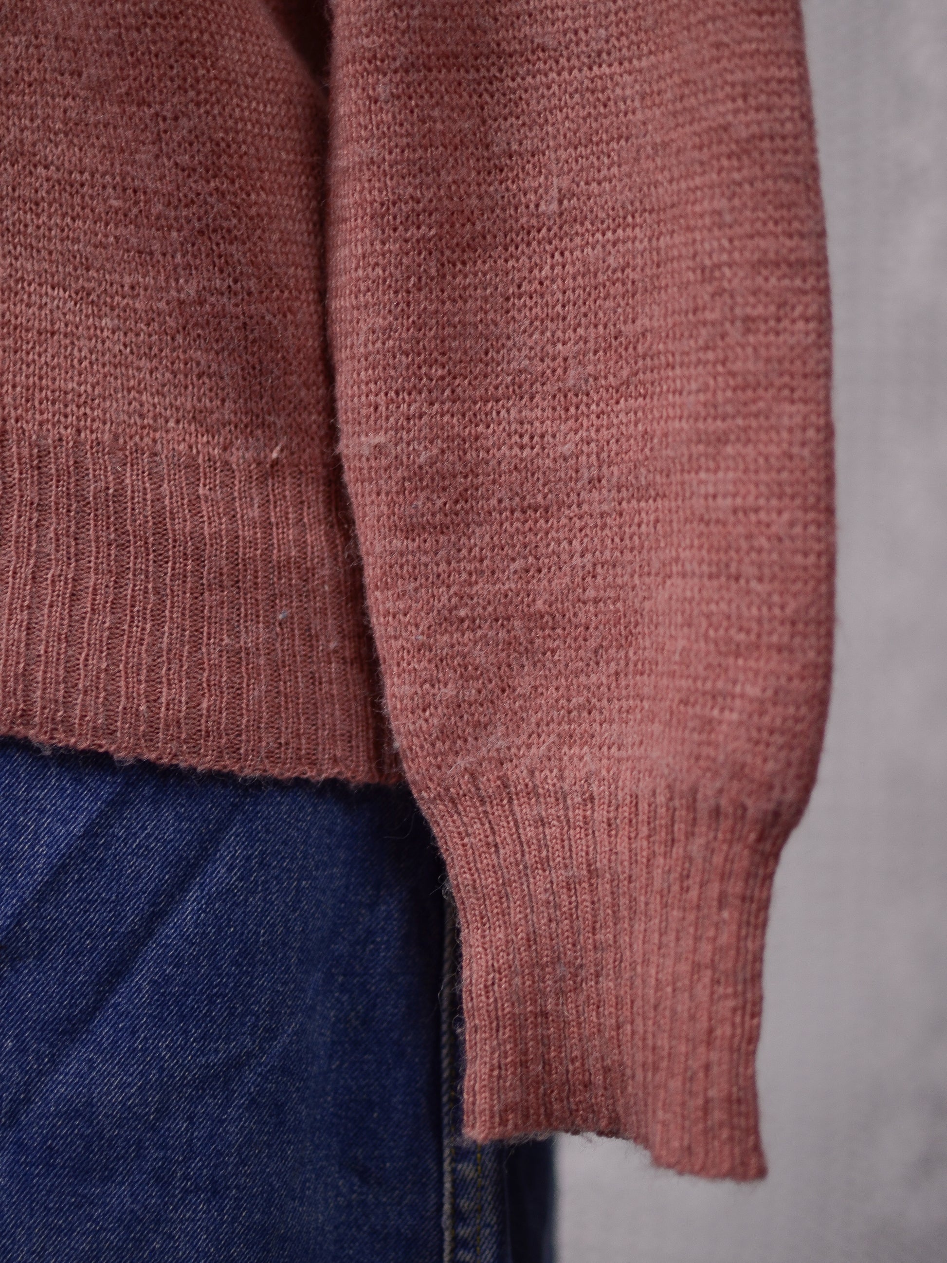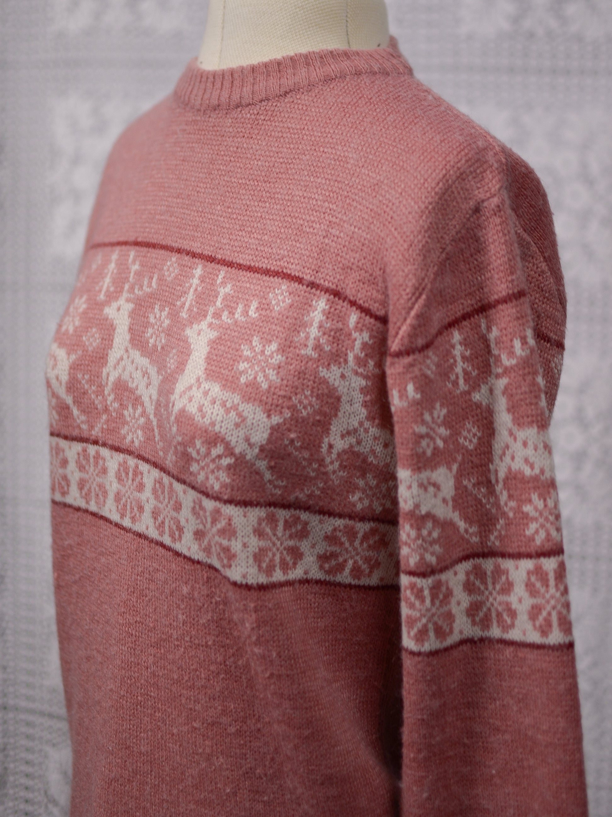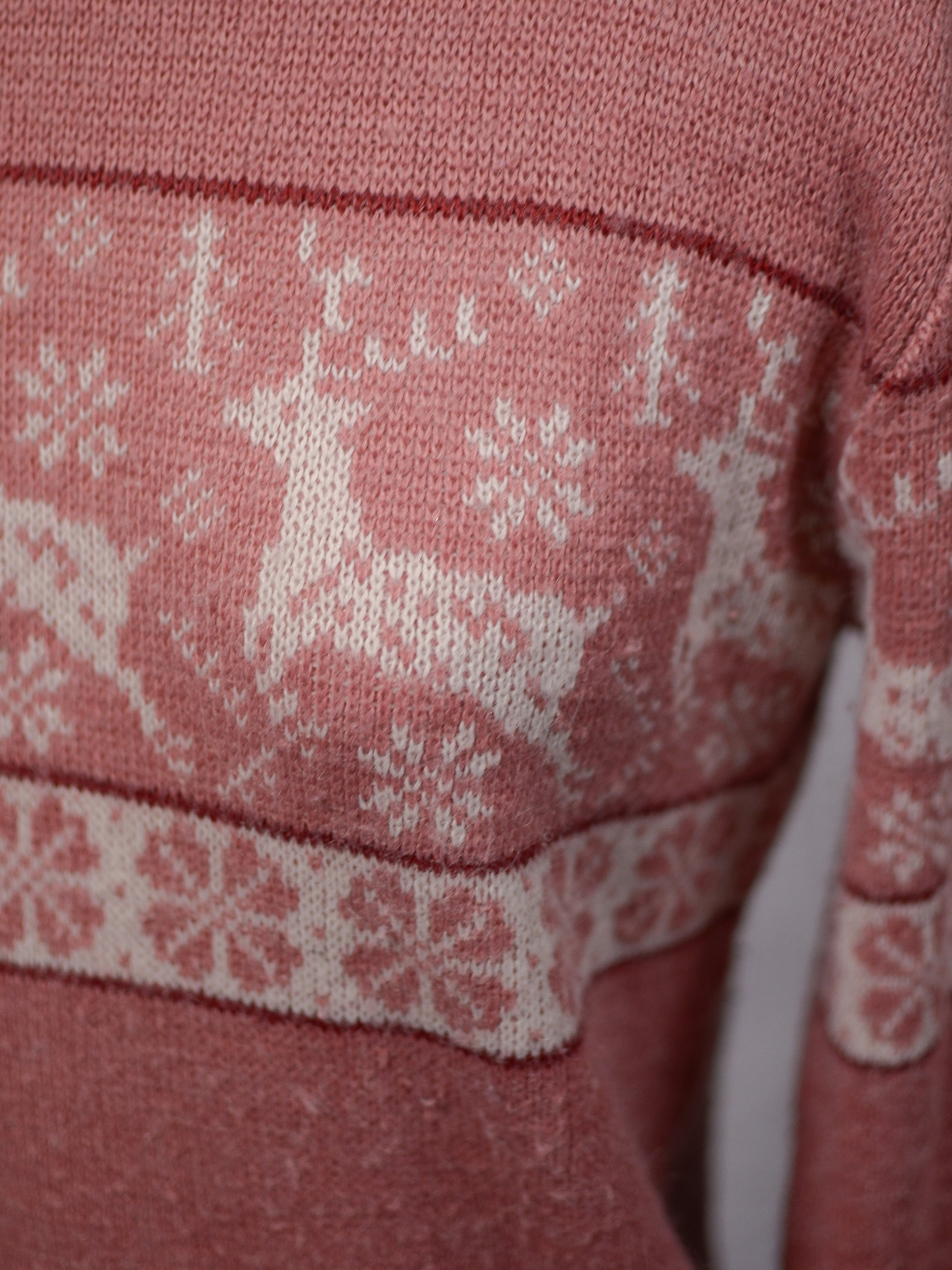 If you're looking for a festive jumper in non-Christmas colours, look no further! This gorgeous 1970s vintage piece from heritage British brand St Michael (Marks & Spencer) has a distinctly festive feel but in a light dusky pink with a white leaping reindeer and snowflake pattern.