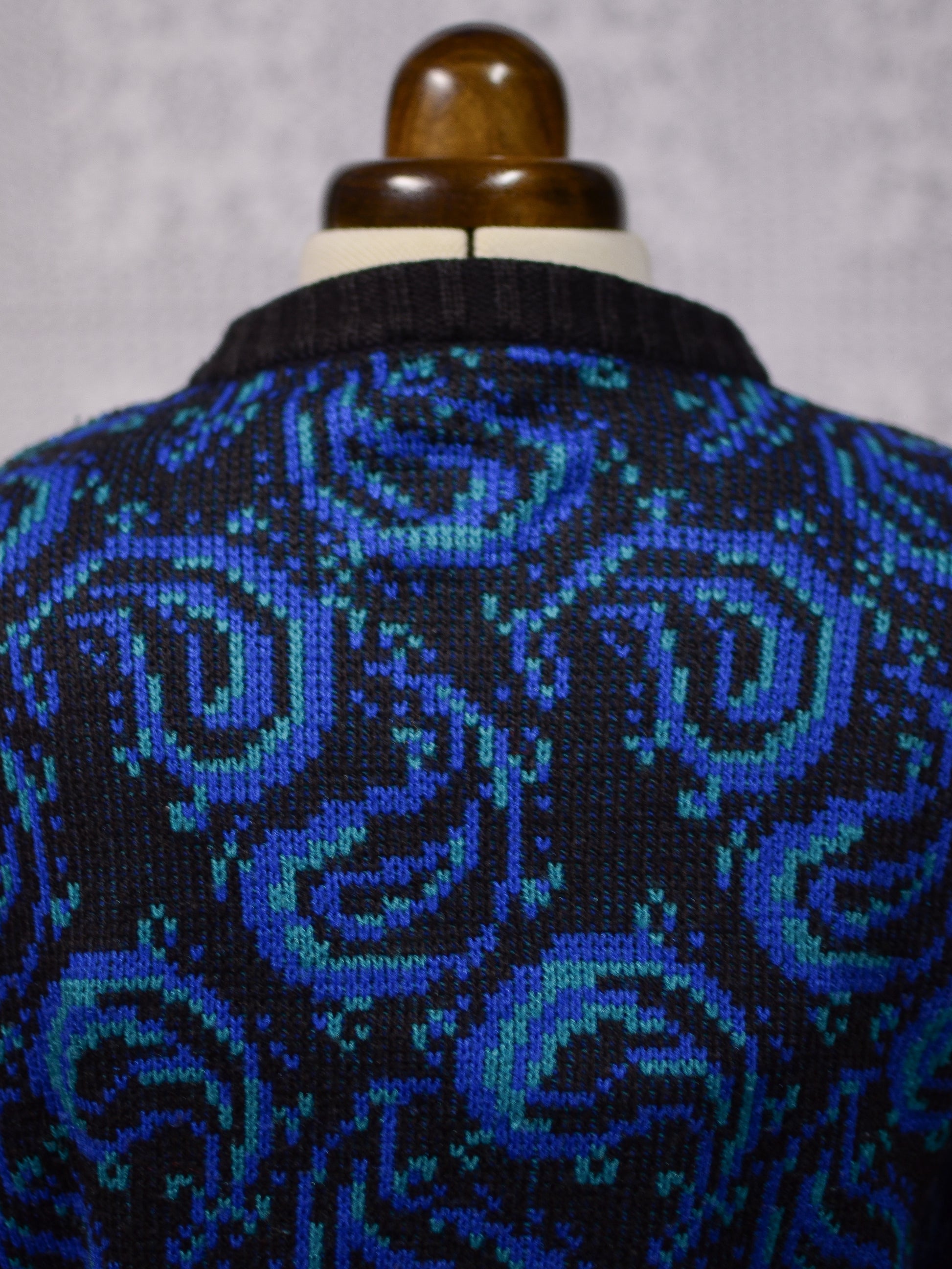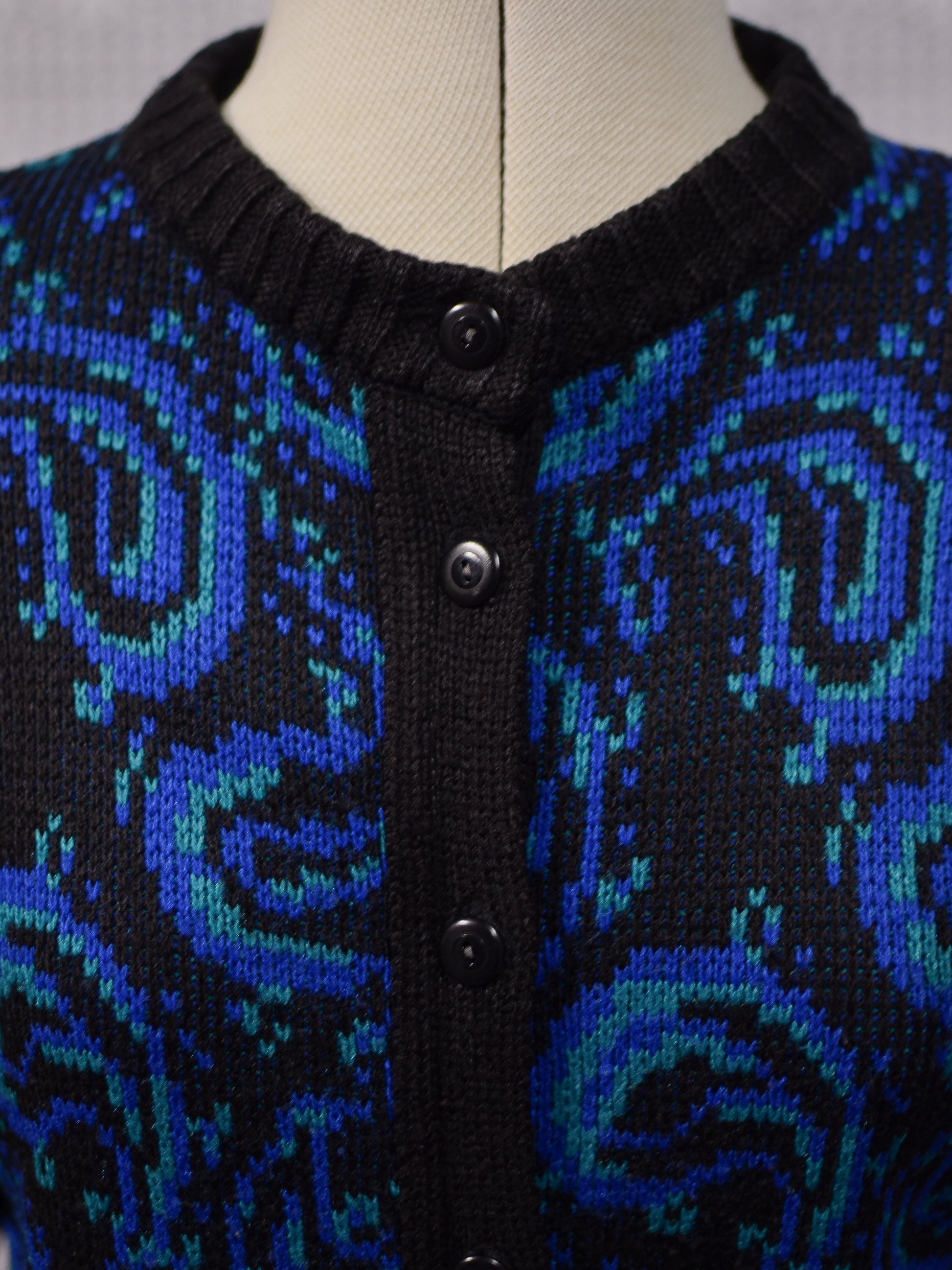 1980s St Michael black, blue and green paisley pattern button-through crew neck cardigan