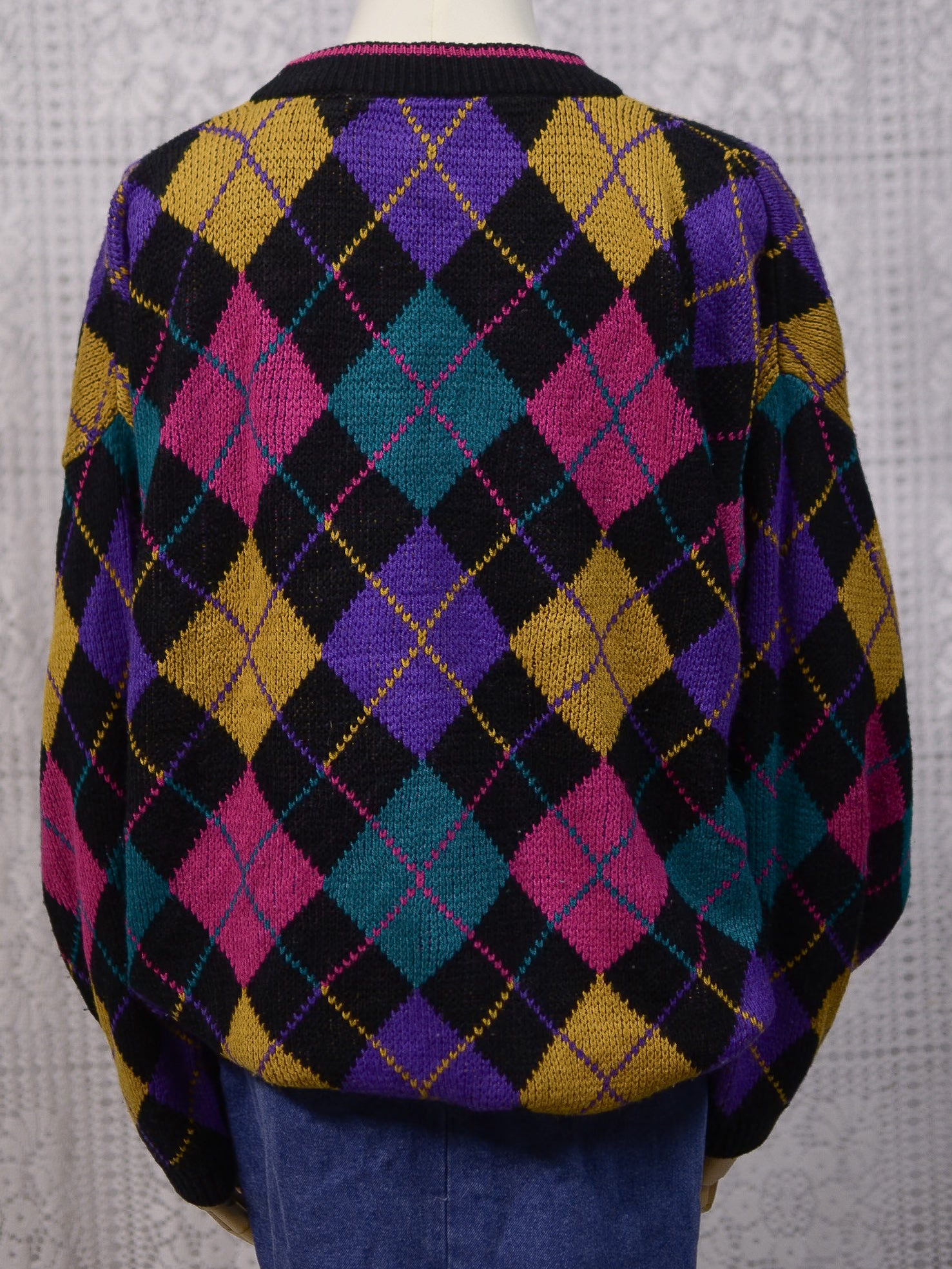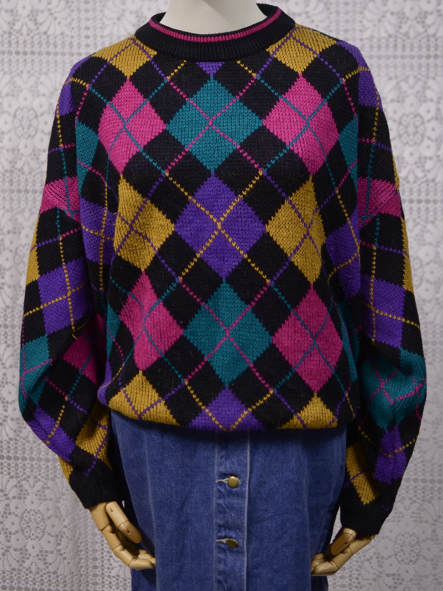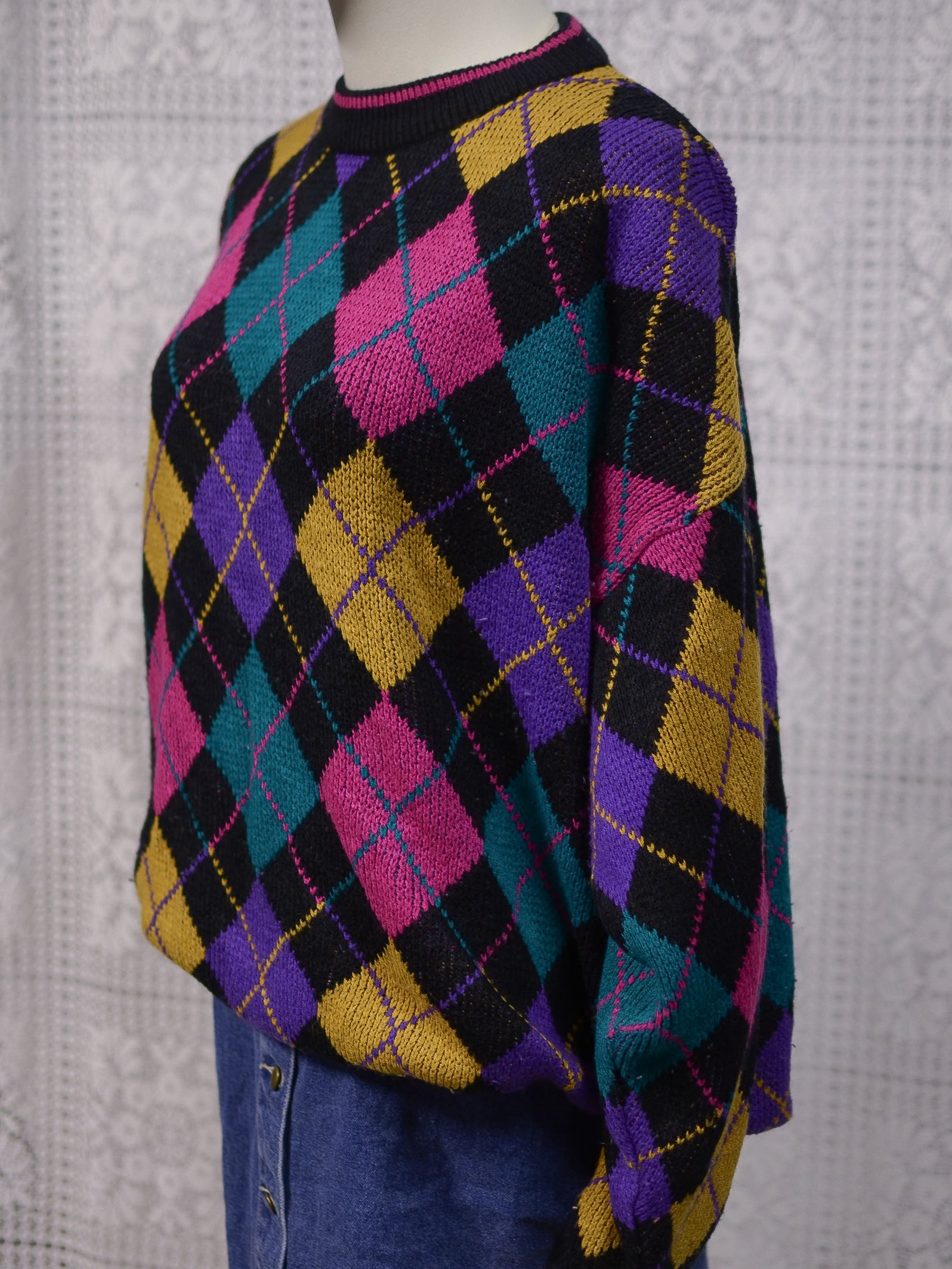 1980s black, pink, yellow, purple and turquoise green argyle pattern jumper