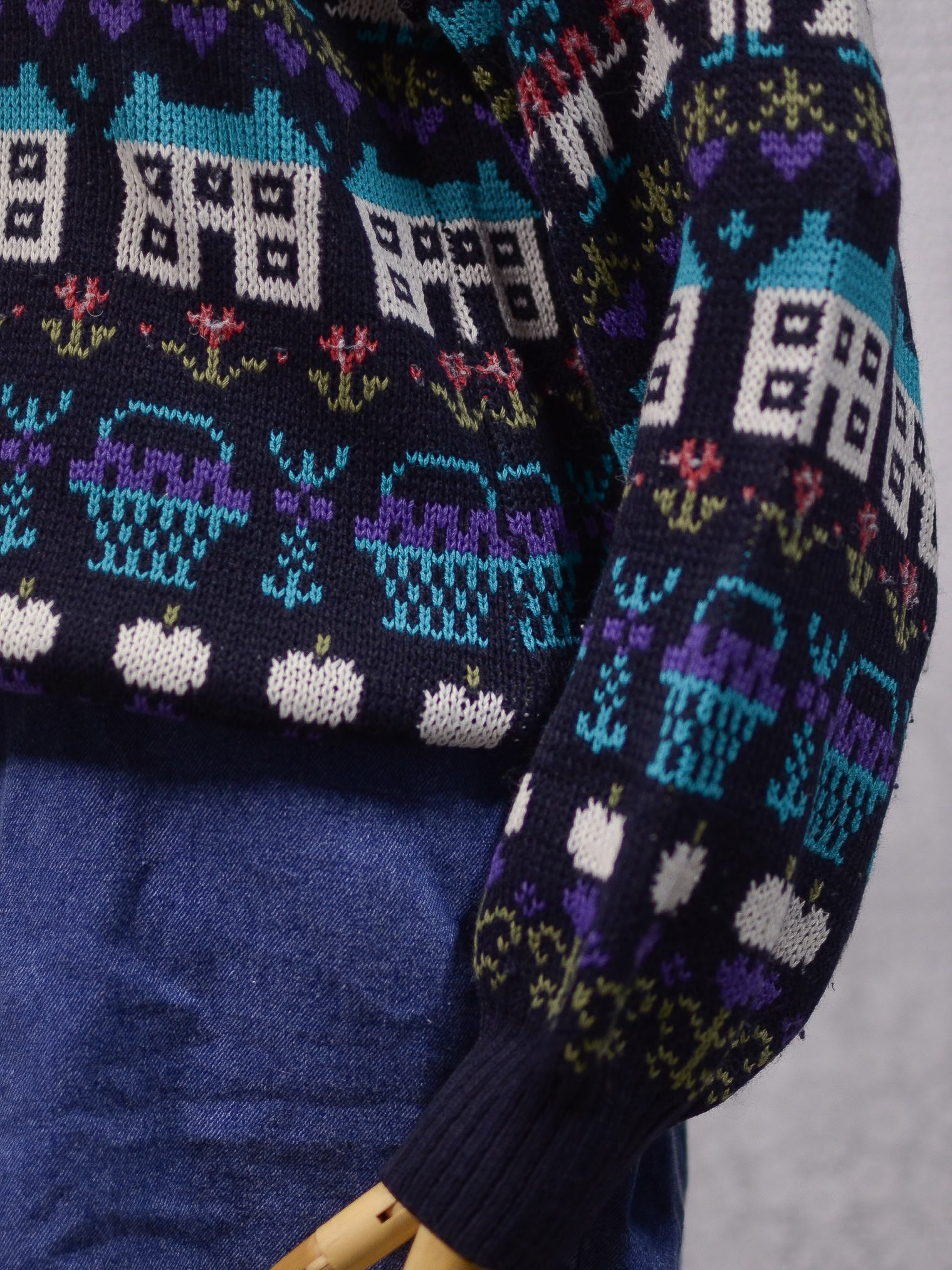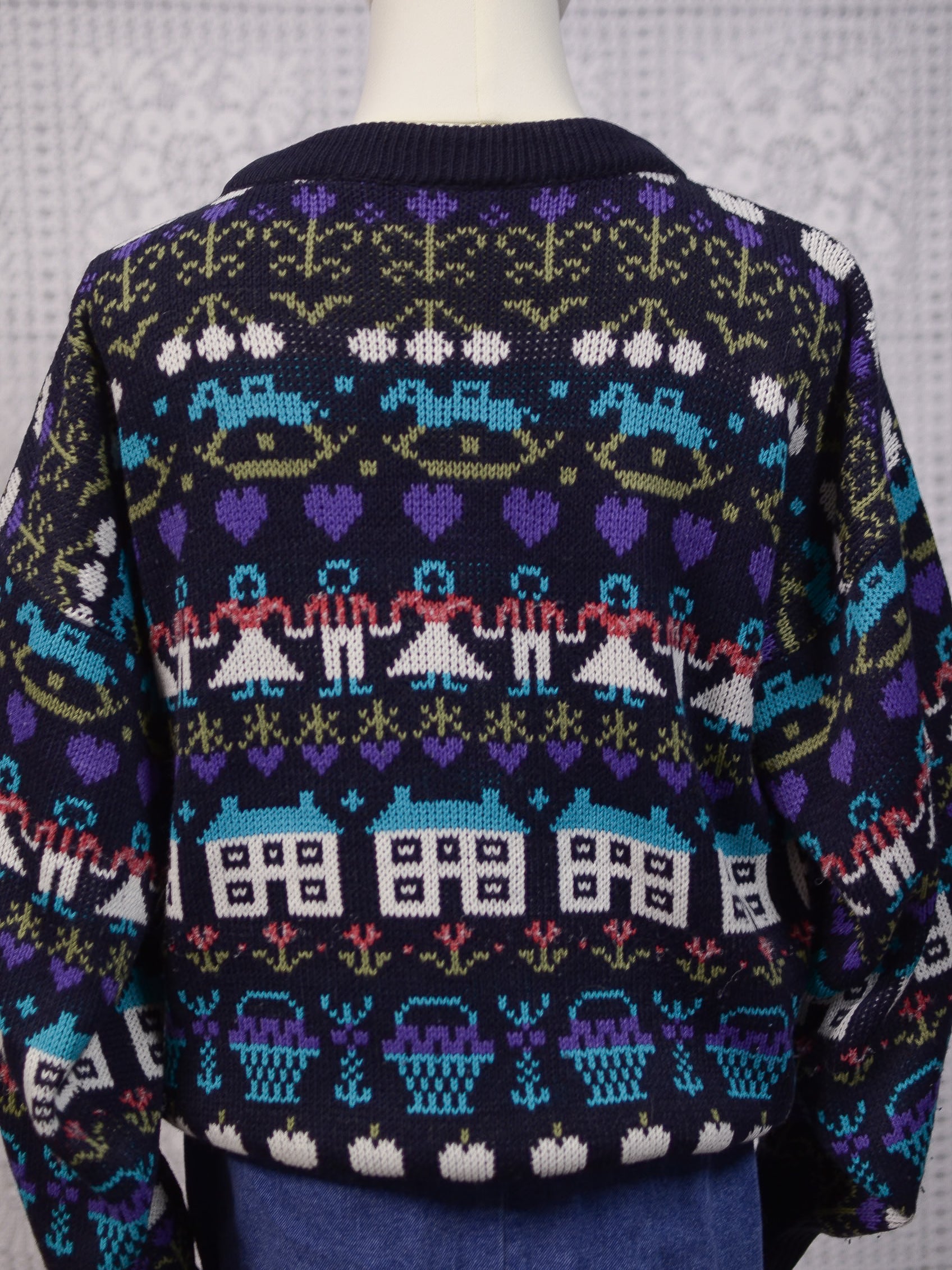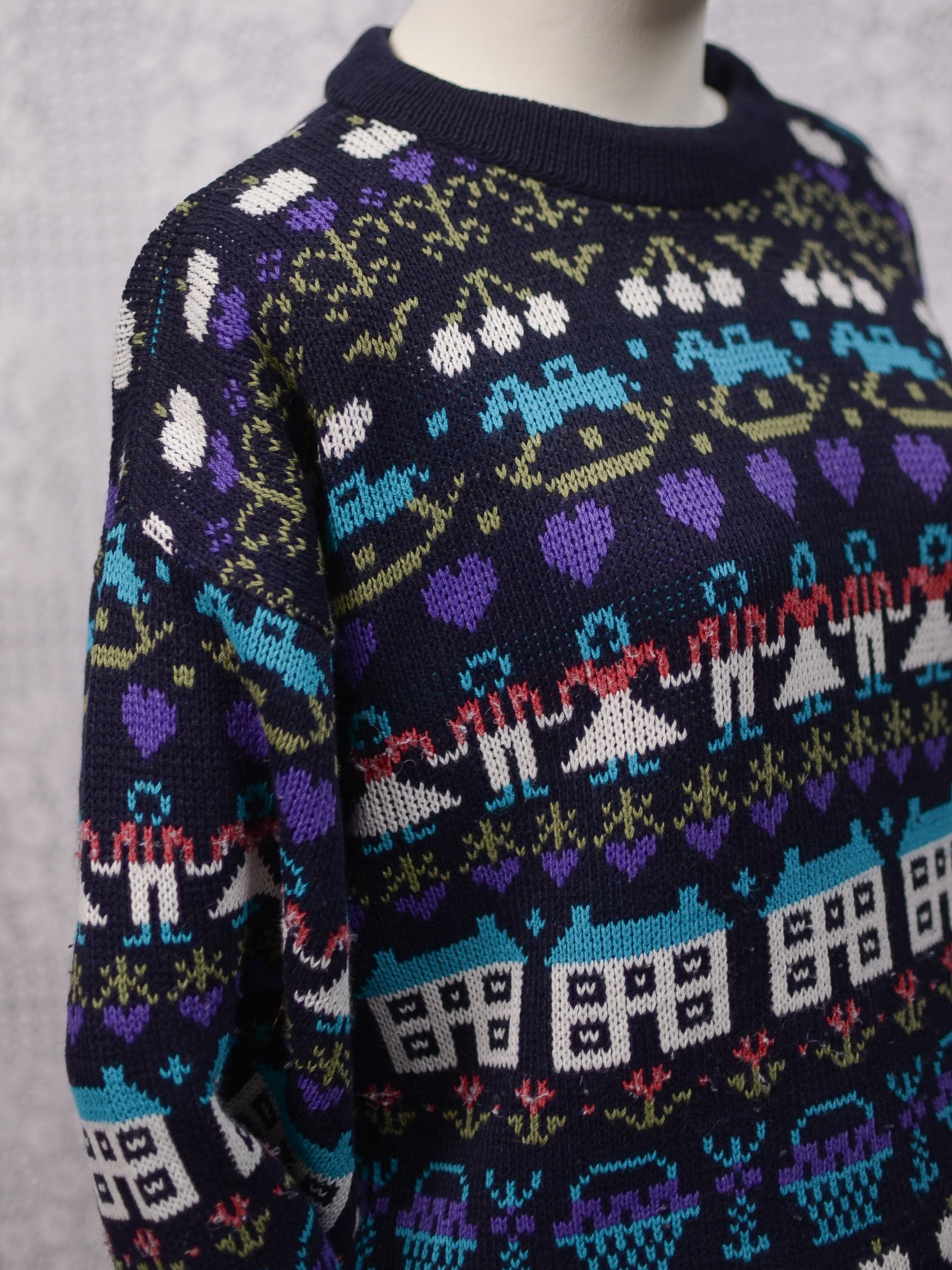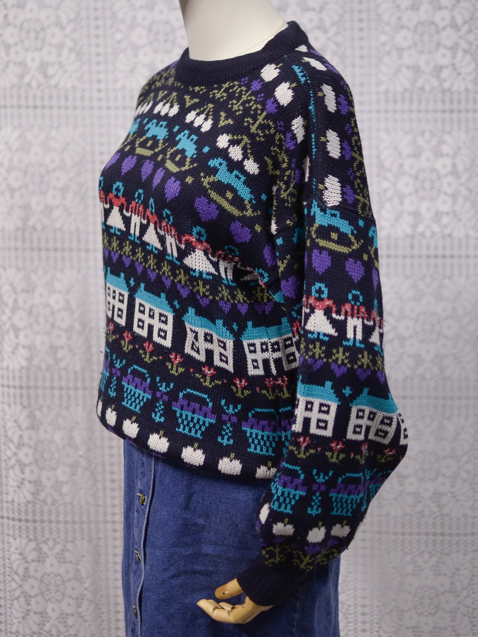1980s navy blue, purple and blue novelty folk pattern jumper