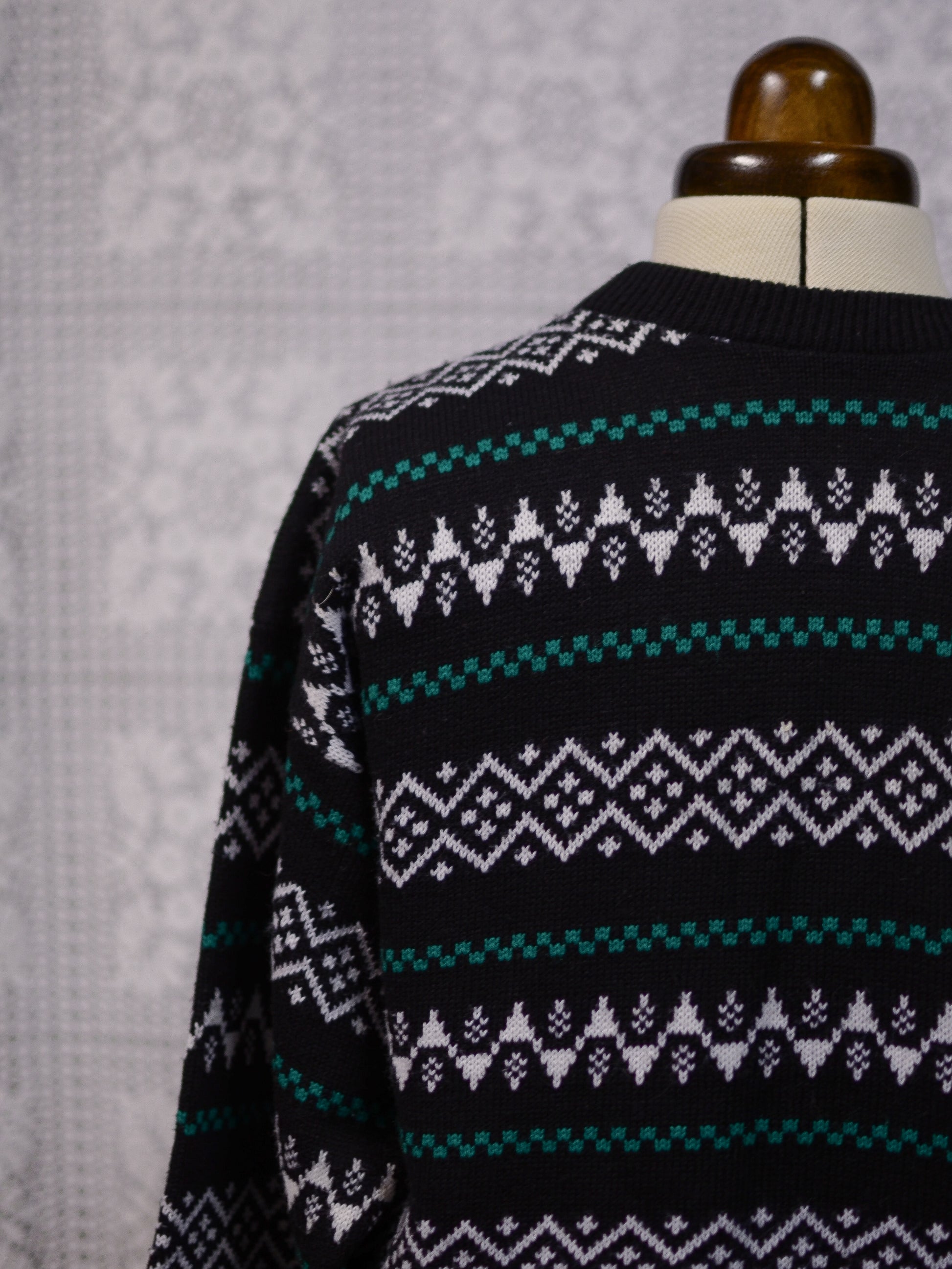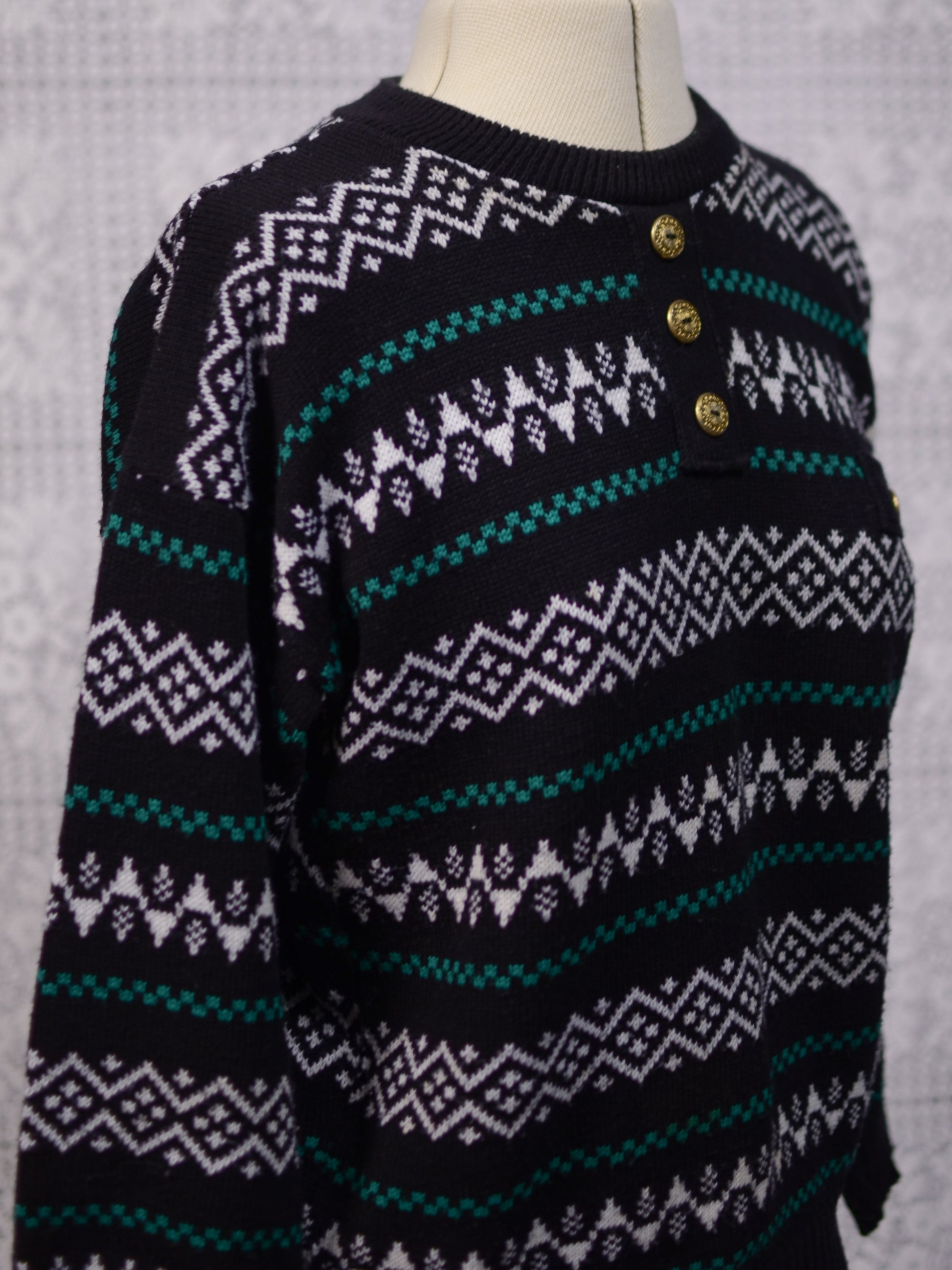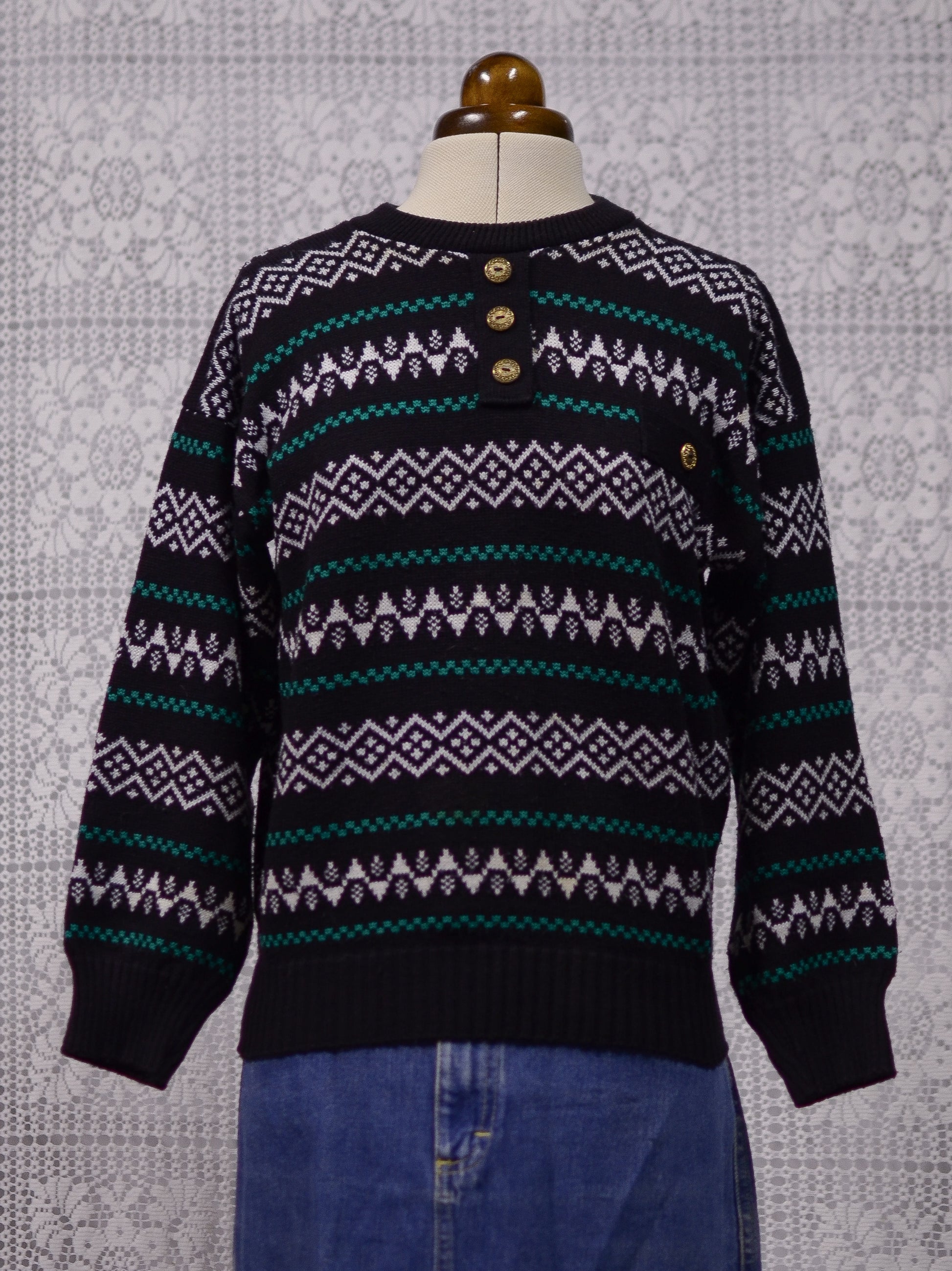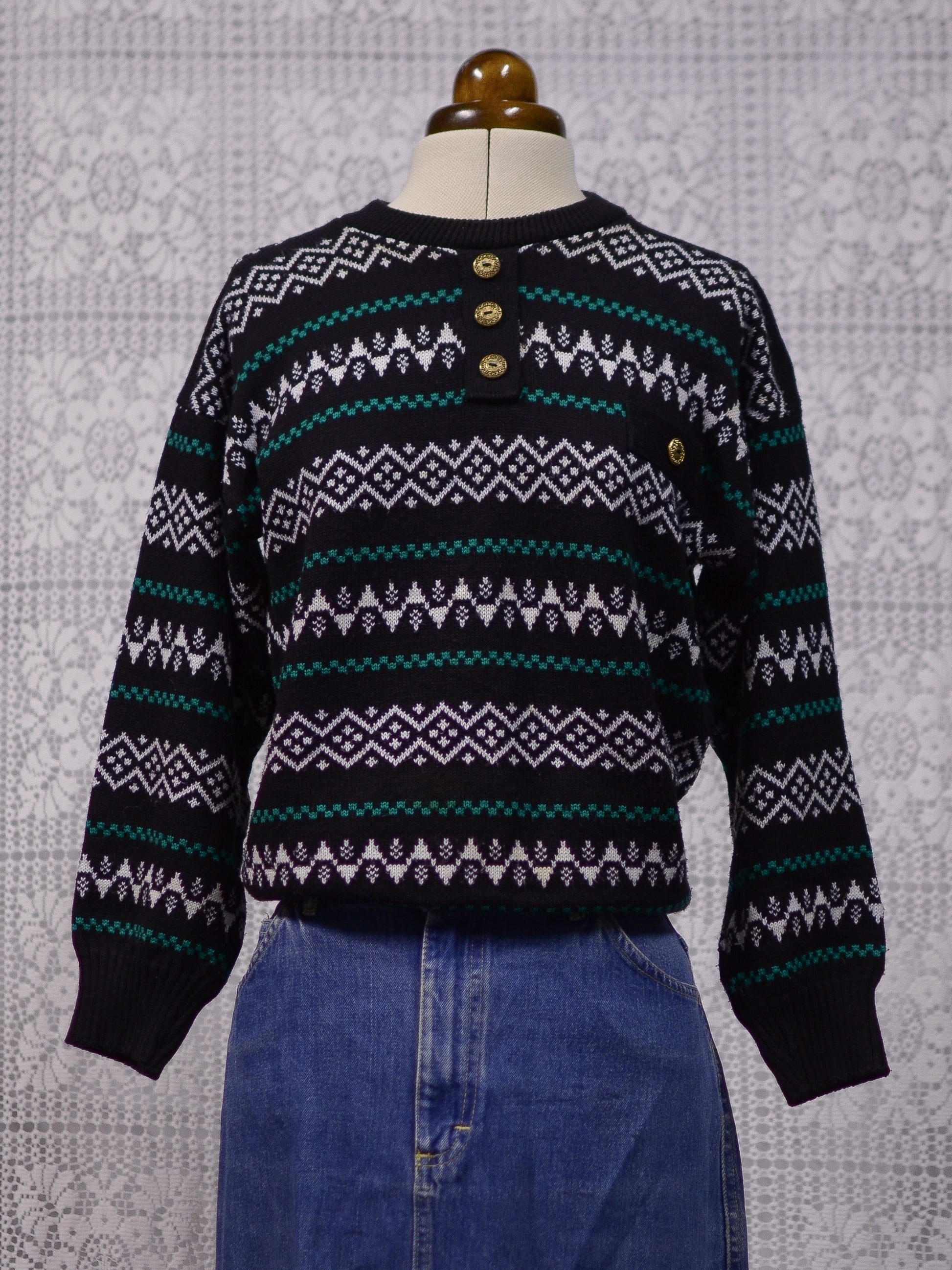 A cute, simple geometric pattern jumper in black, white and green, with pocket and brass button details.