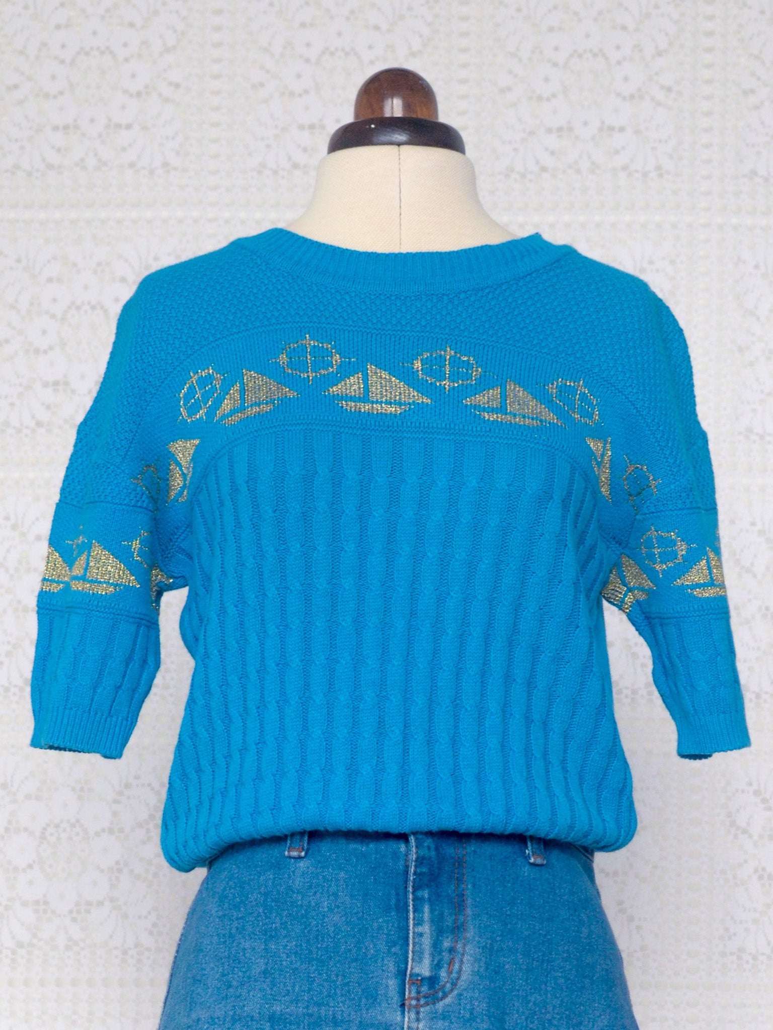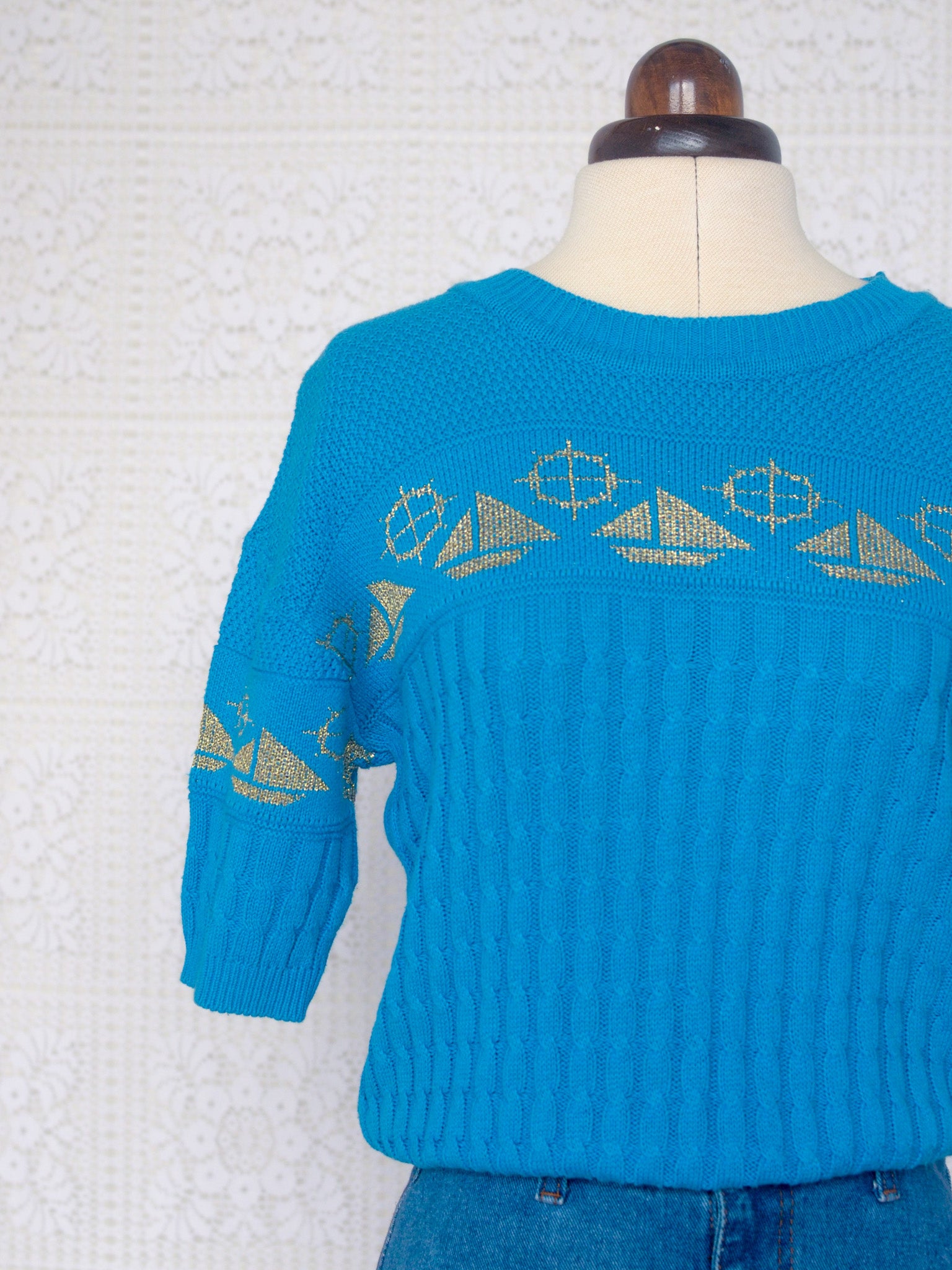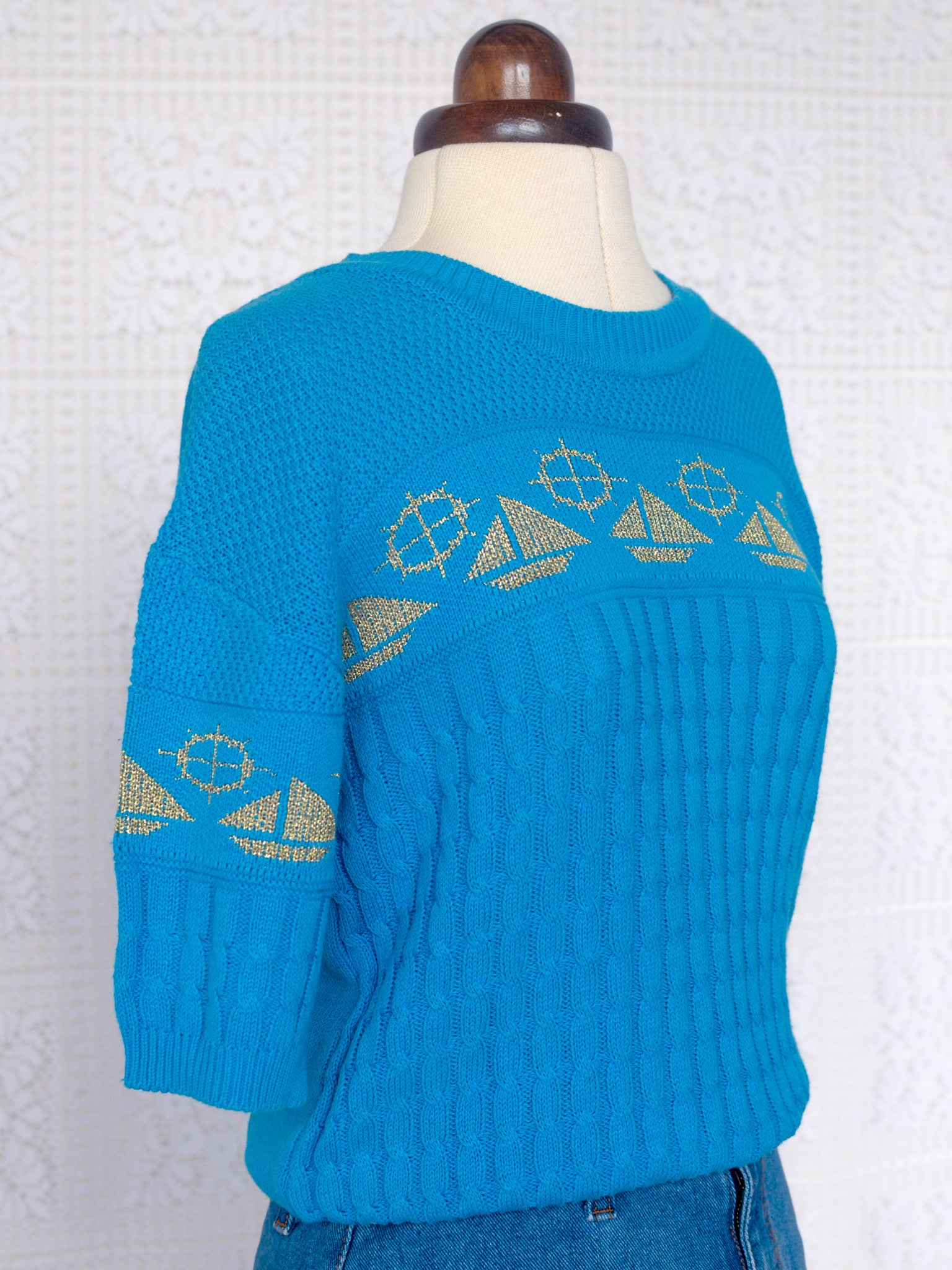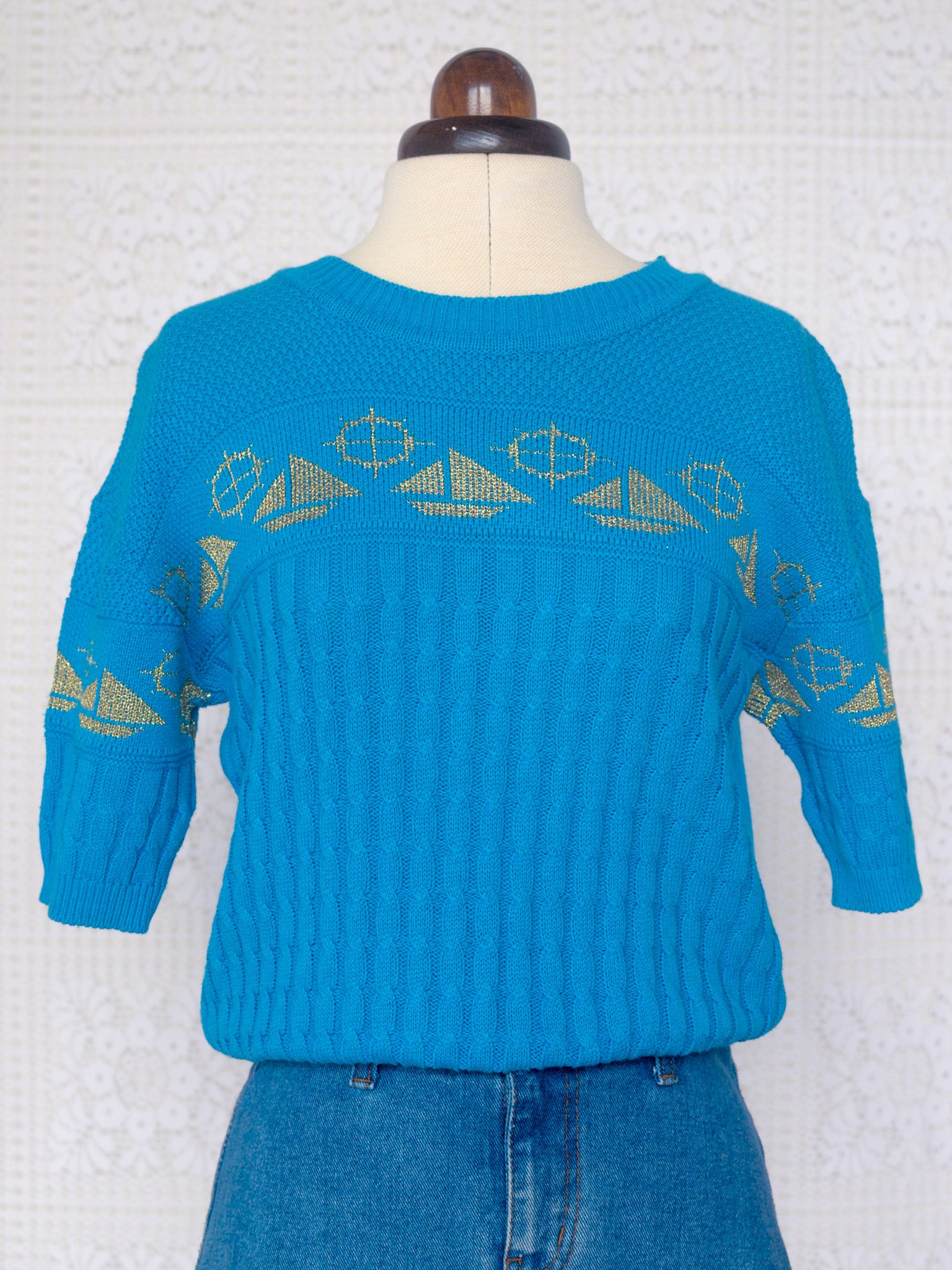 1980s blue and gold nautical boat pattern short sleeve jumper