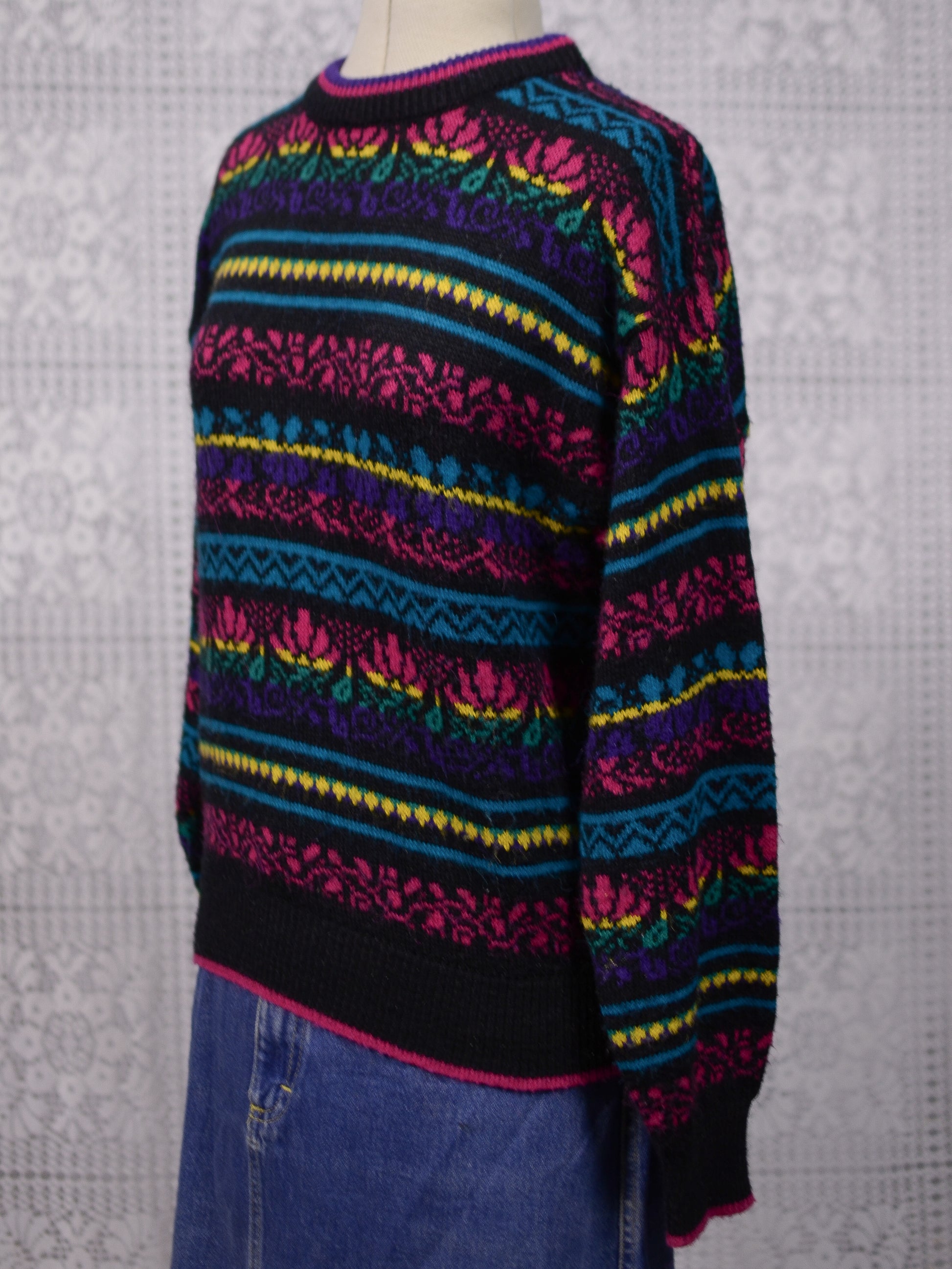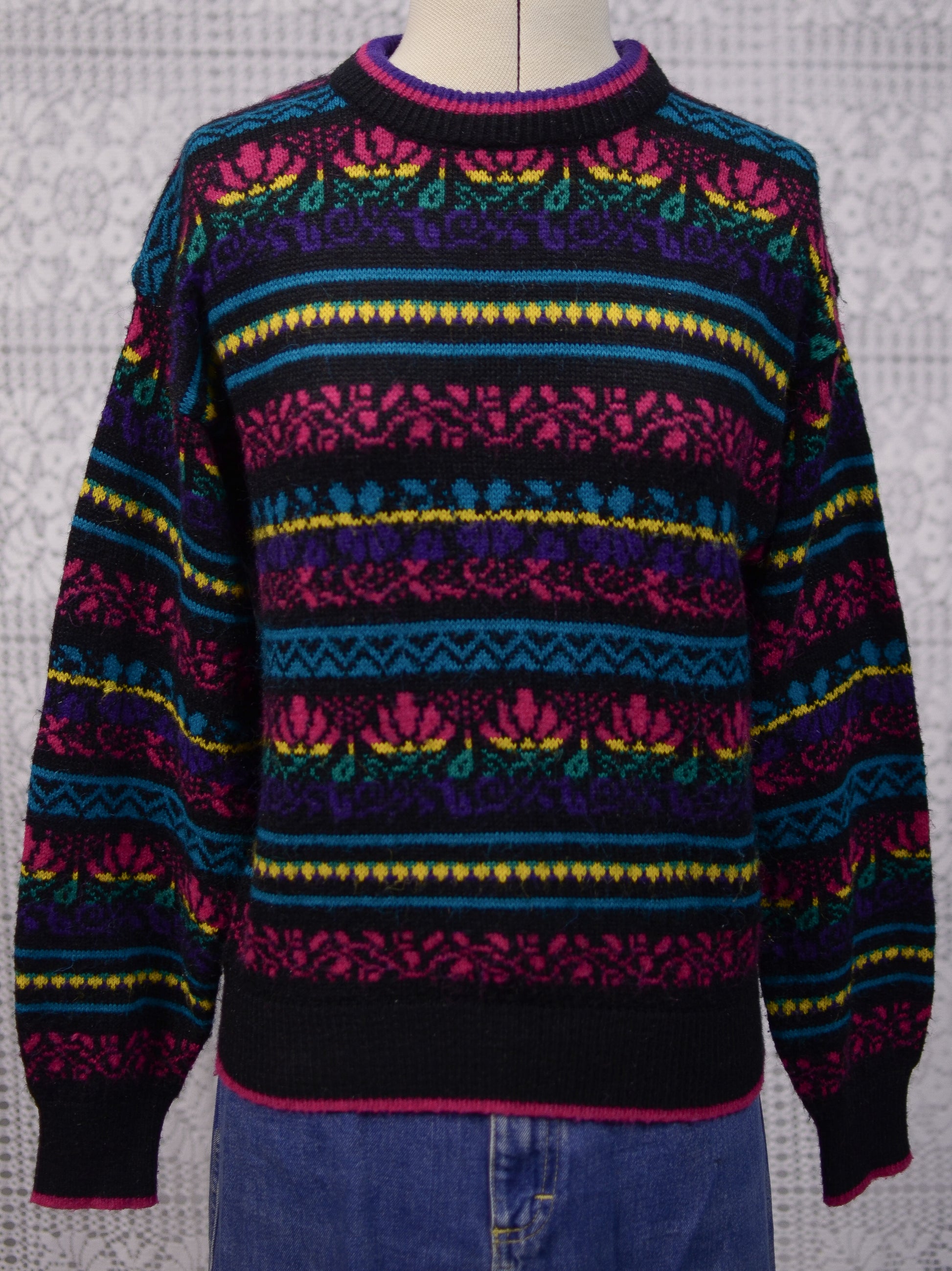 1980s C&A black, pink, yellow, purple and blue colourful floral stripe jumper