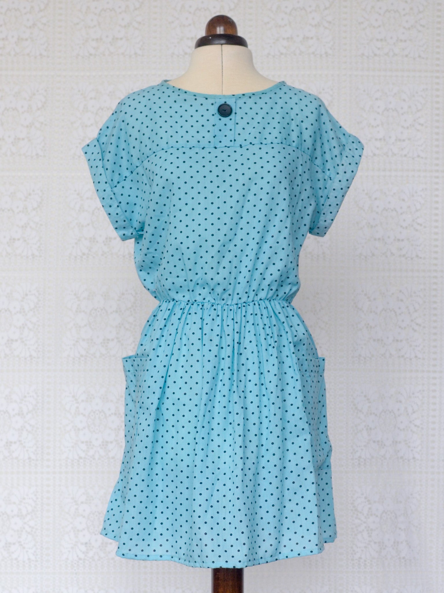 A great little 1980s dress in a lovely light blue polkadot fabric with deep pockets to both sides. Elasticated at the waist and really comfy to wear.