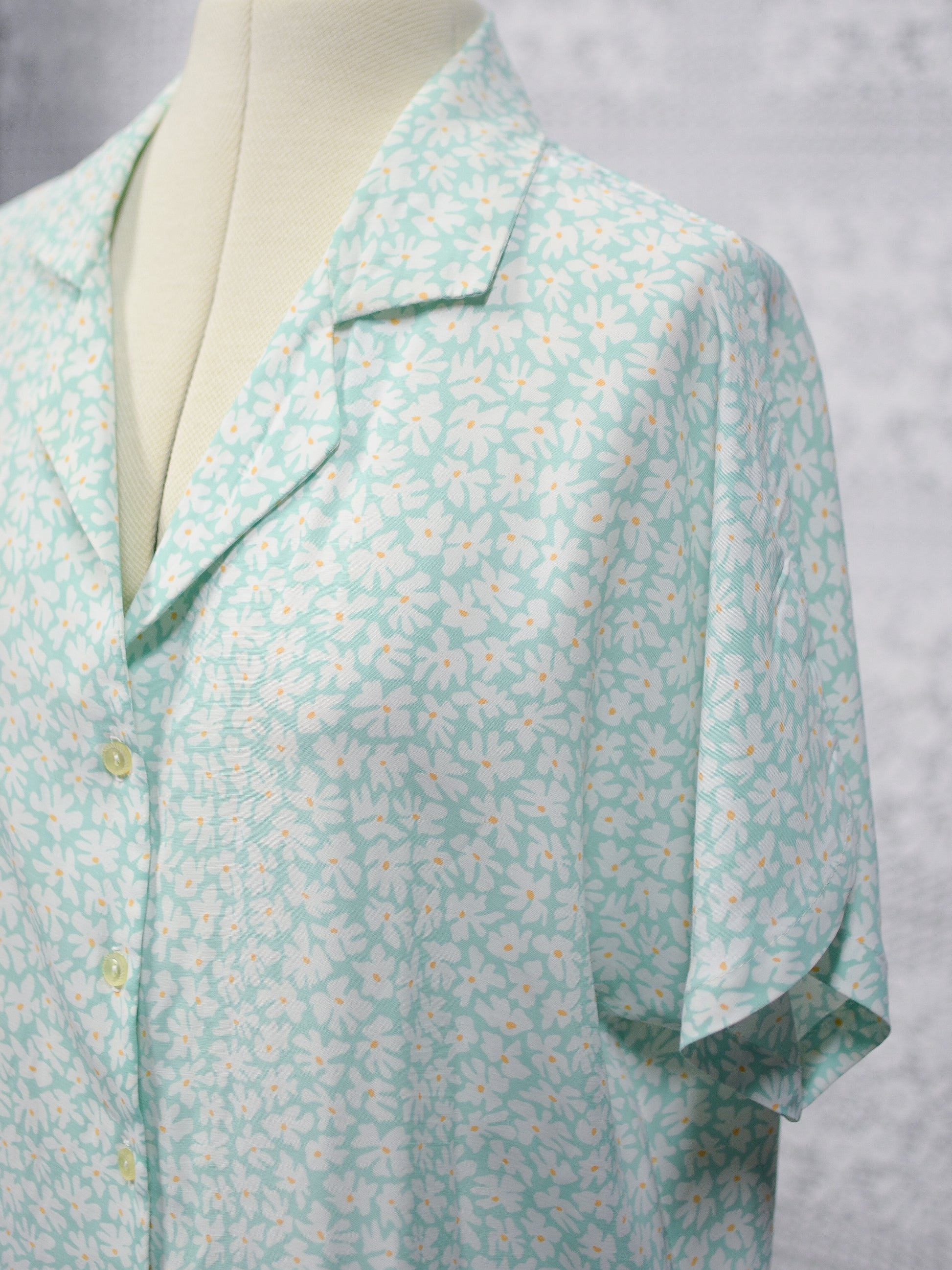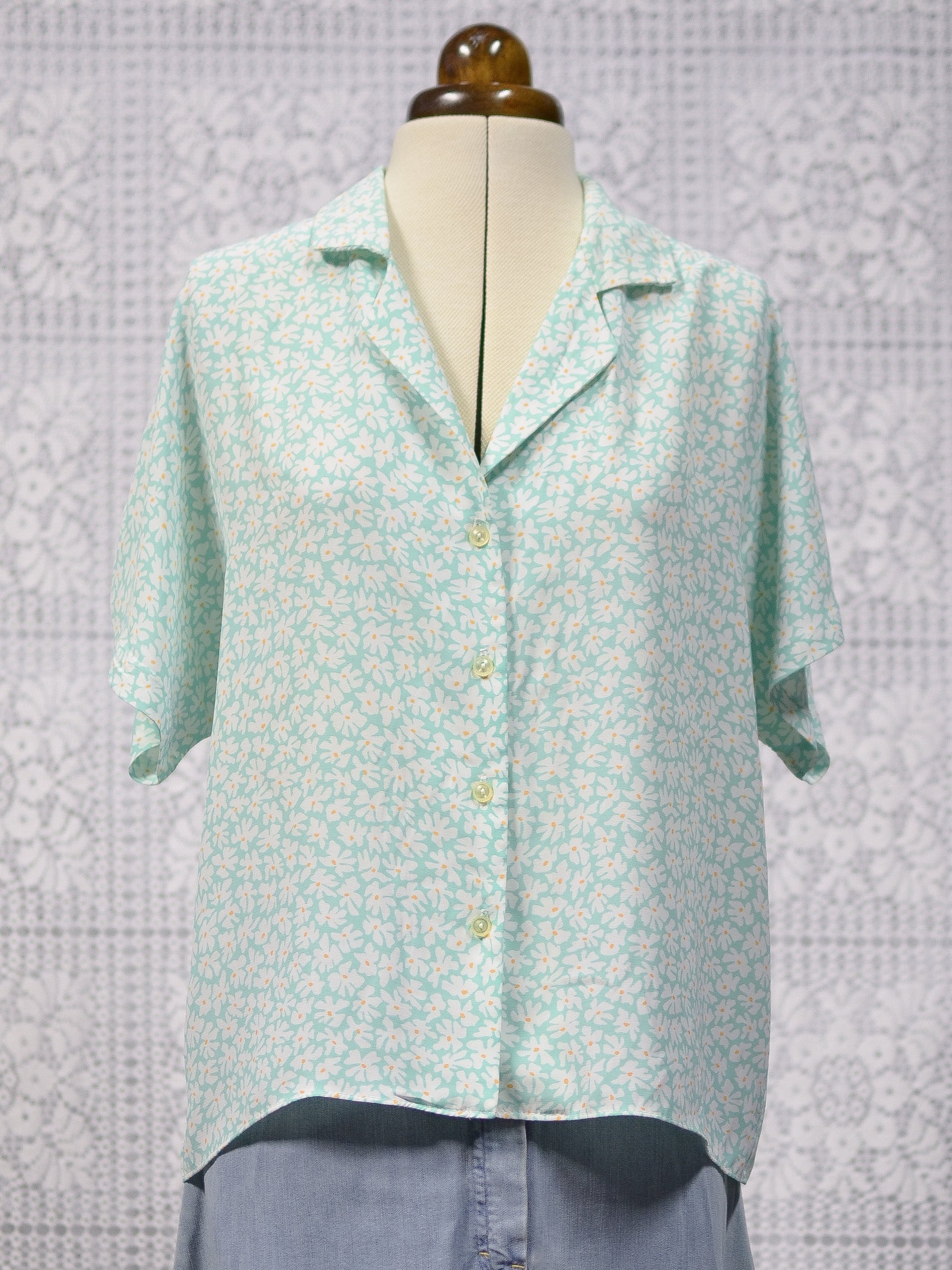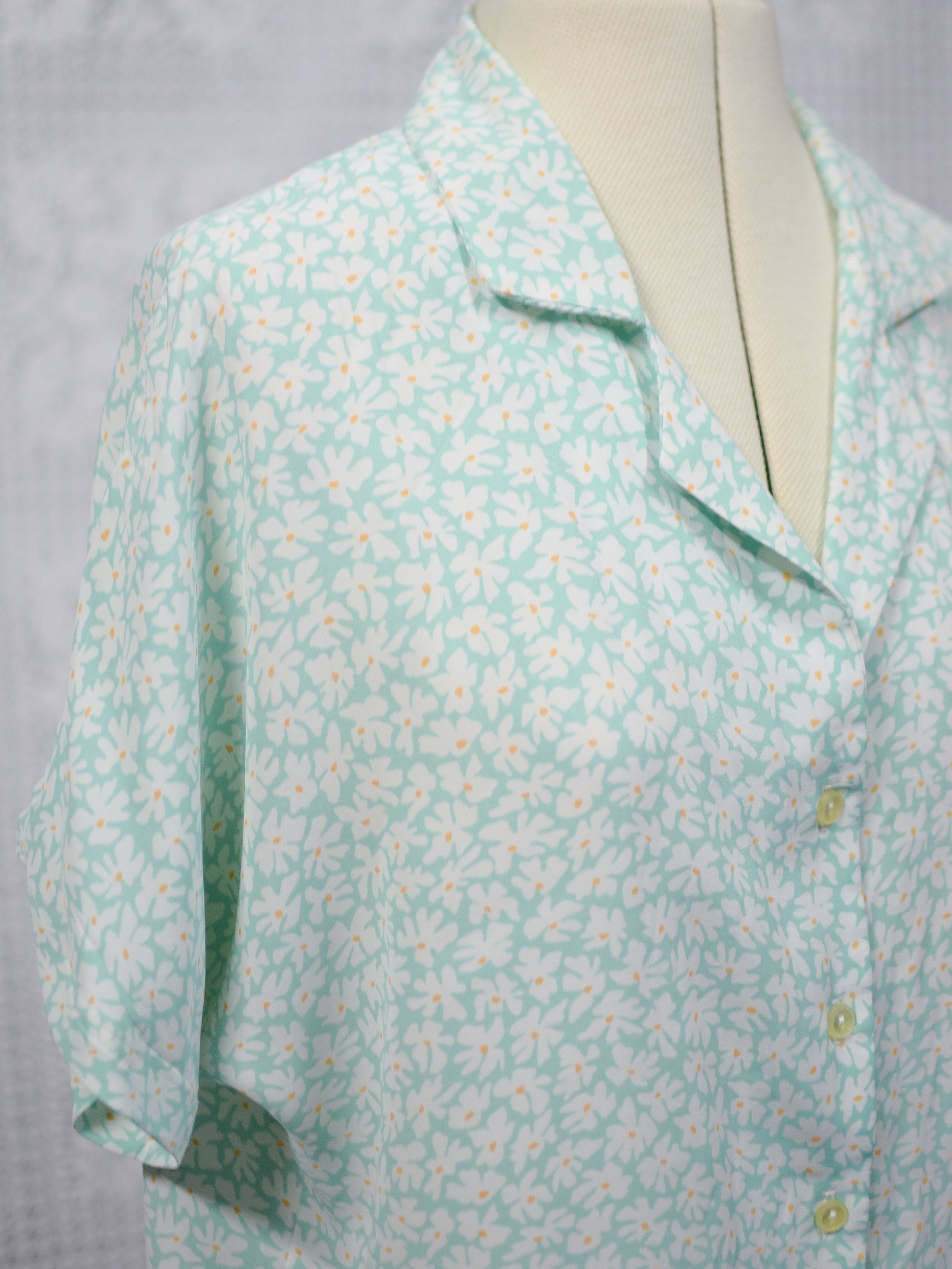1980s C&A mint green and white daisy print cropped short sleeve blouse