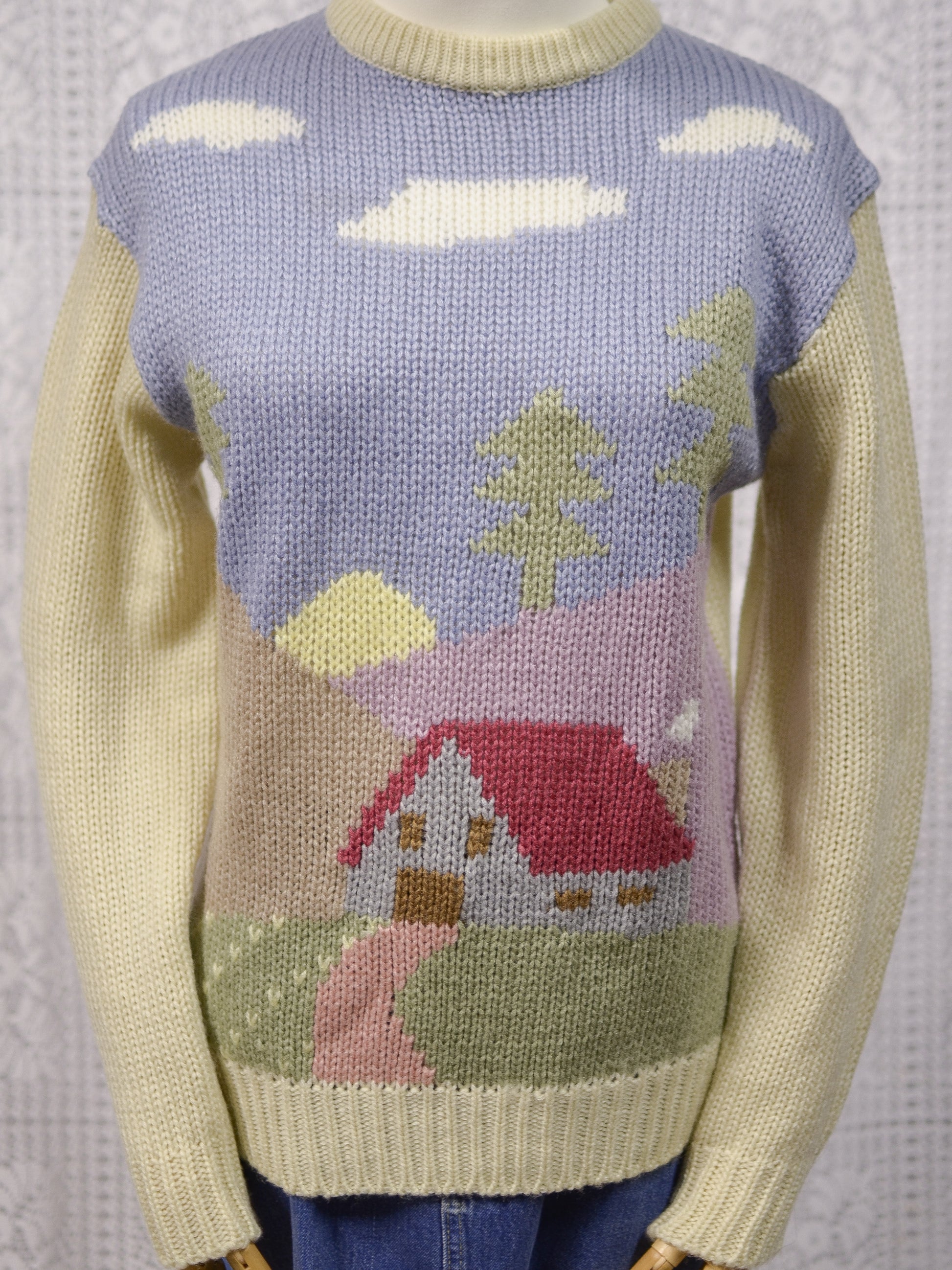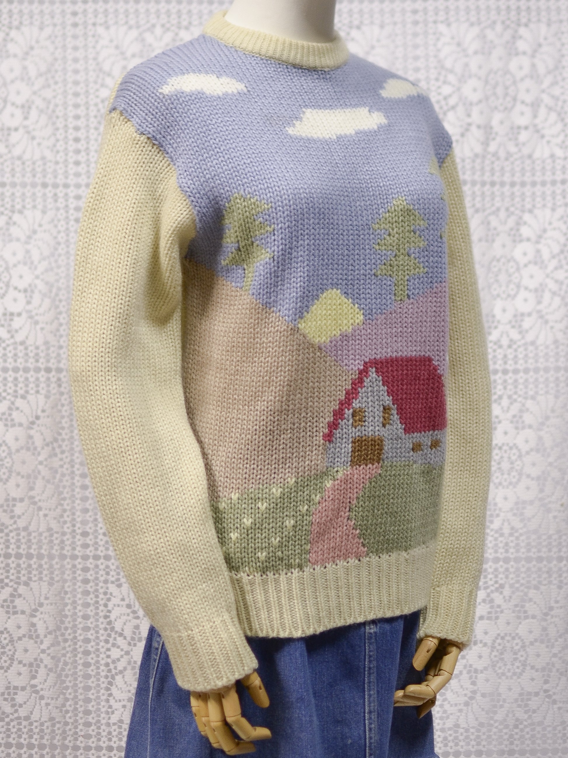 1980s Chelsea Girl cream and pastel cottage pattern jumper