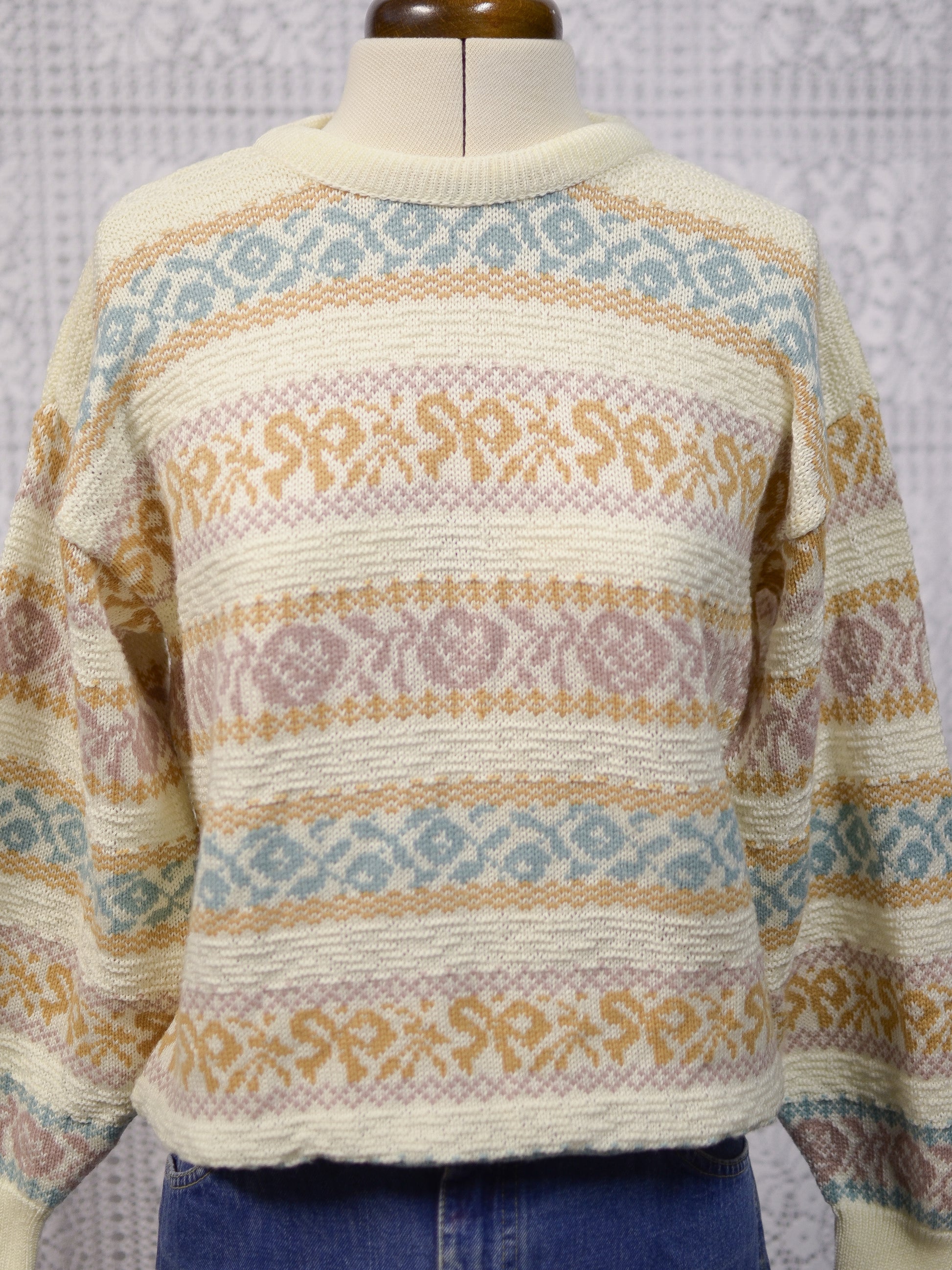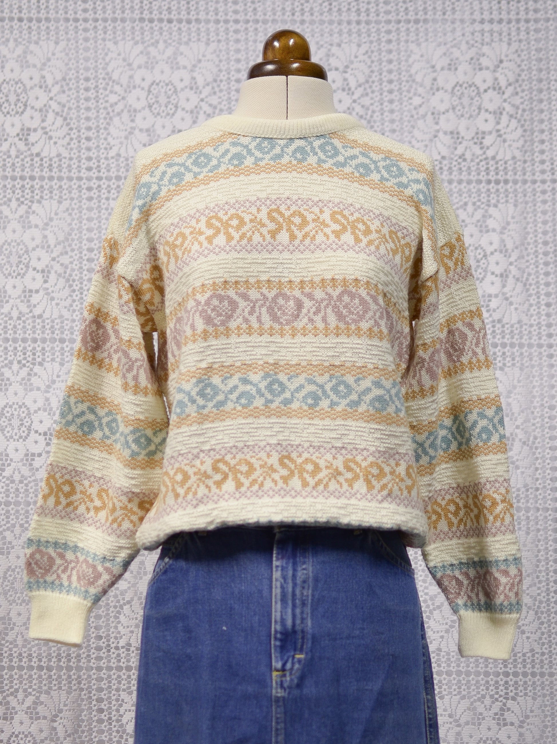 1980s cream and pastel colour floral and bow pattern stripe jumper
