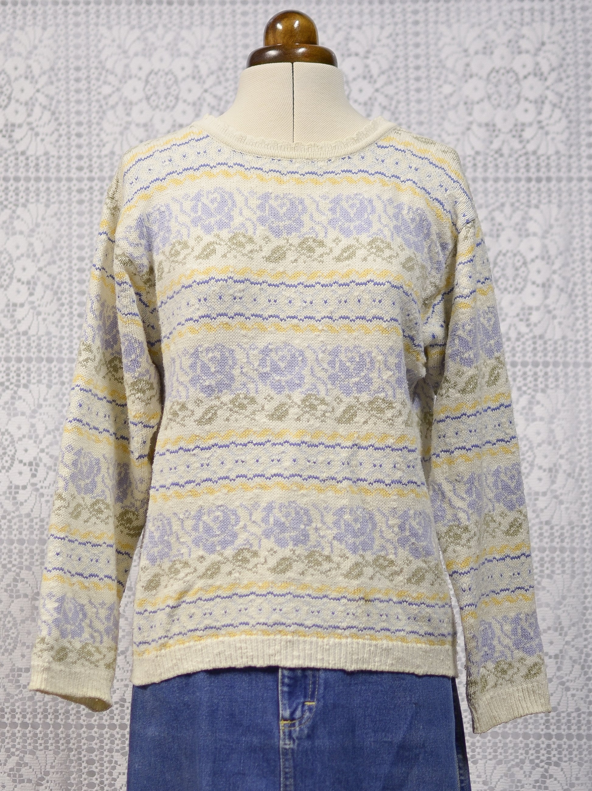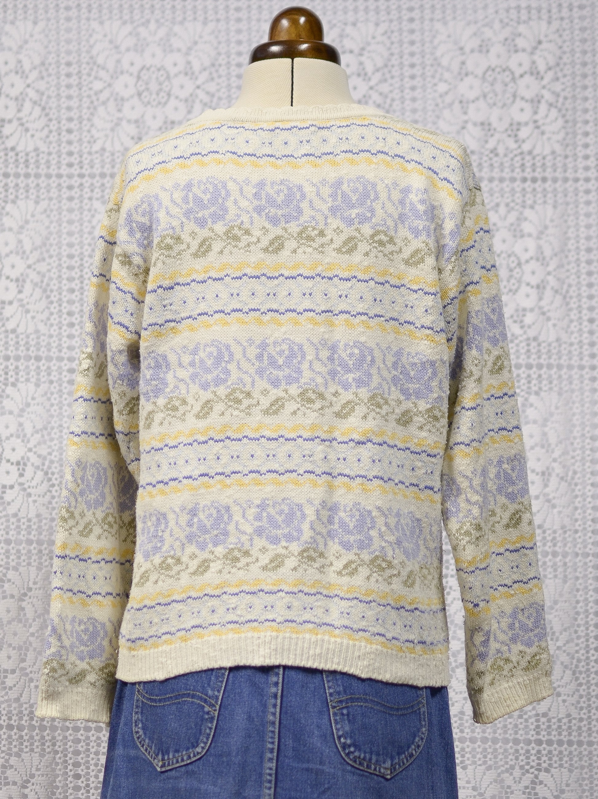 1980s Dorothy Perkins cream, pale blue and yellow rose floral pattern jumper