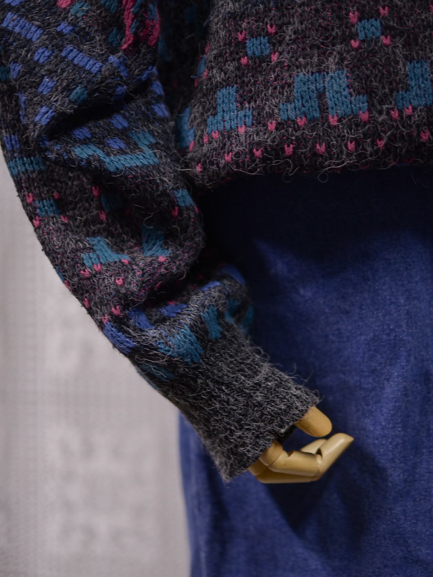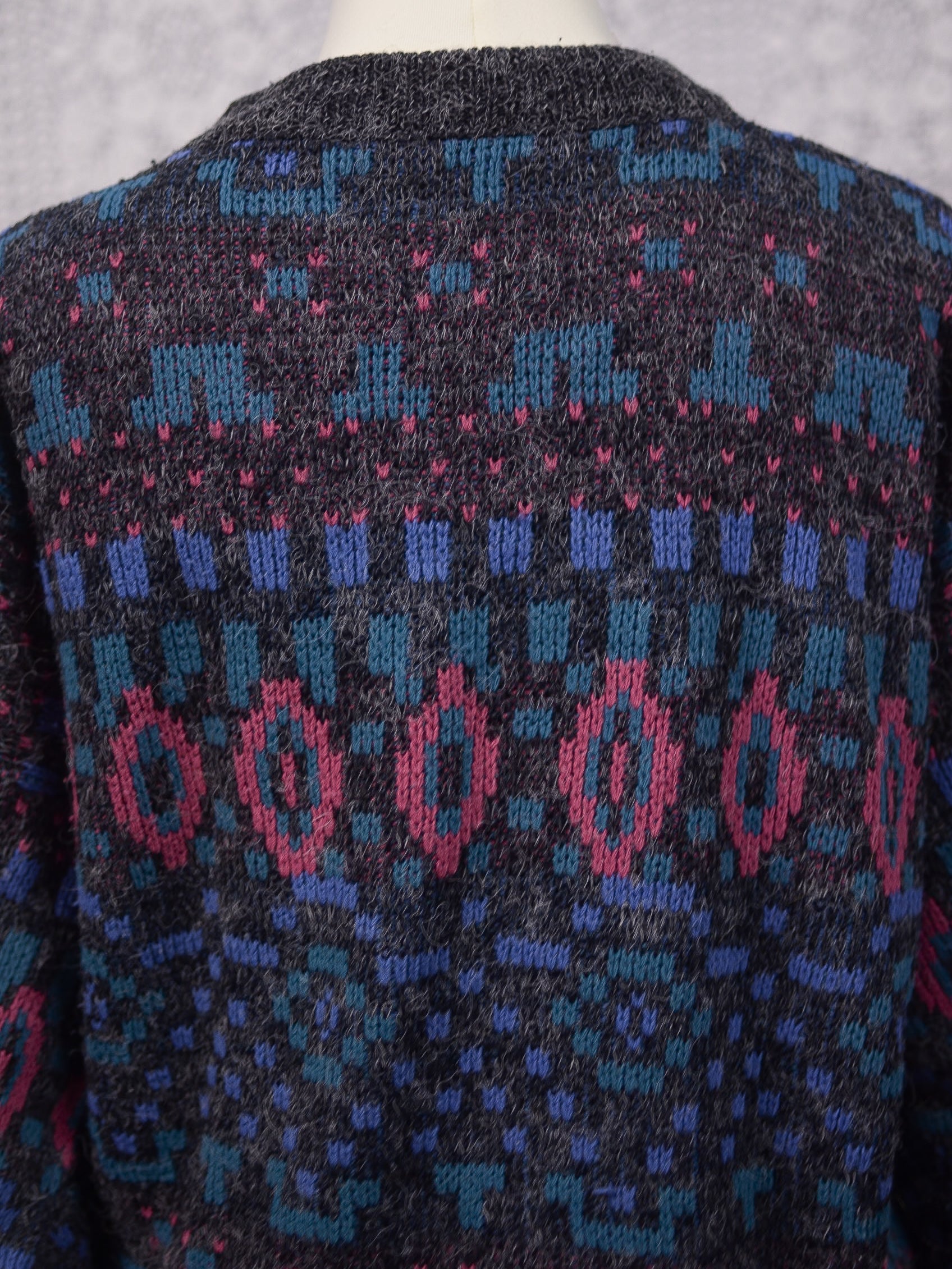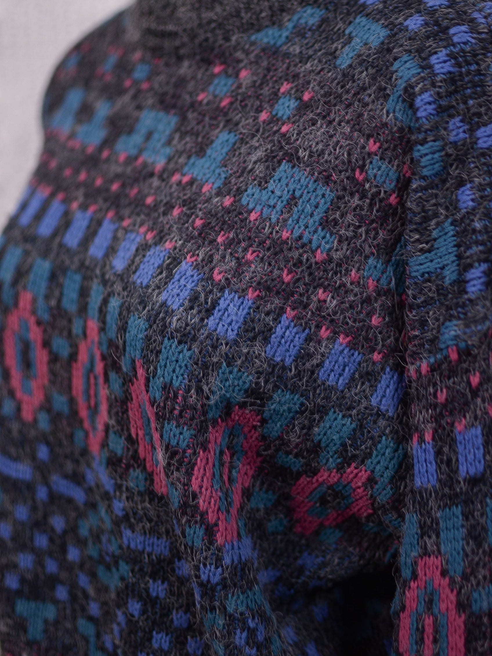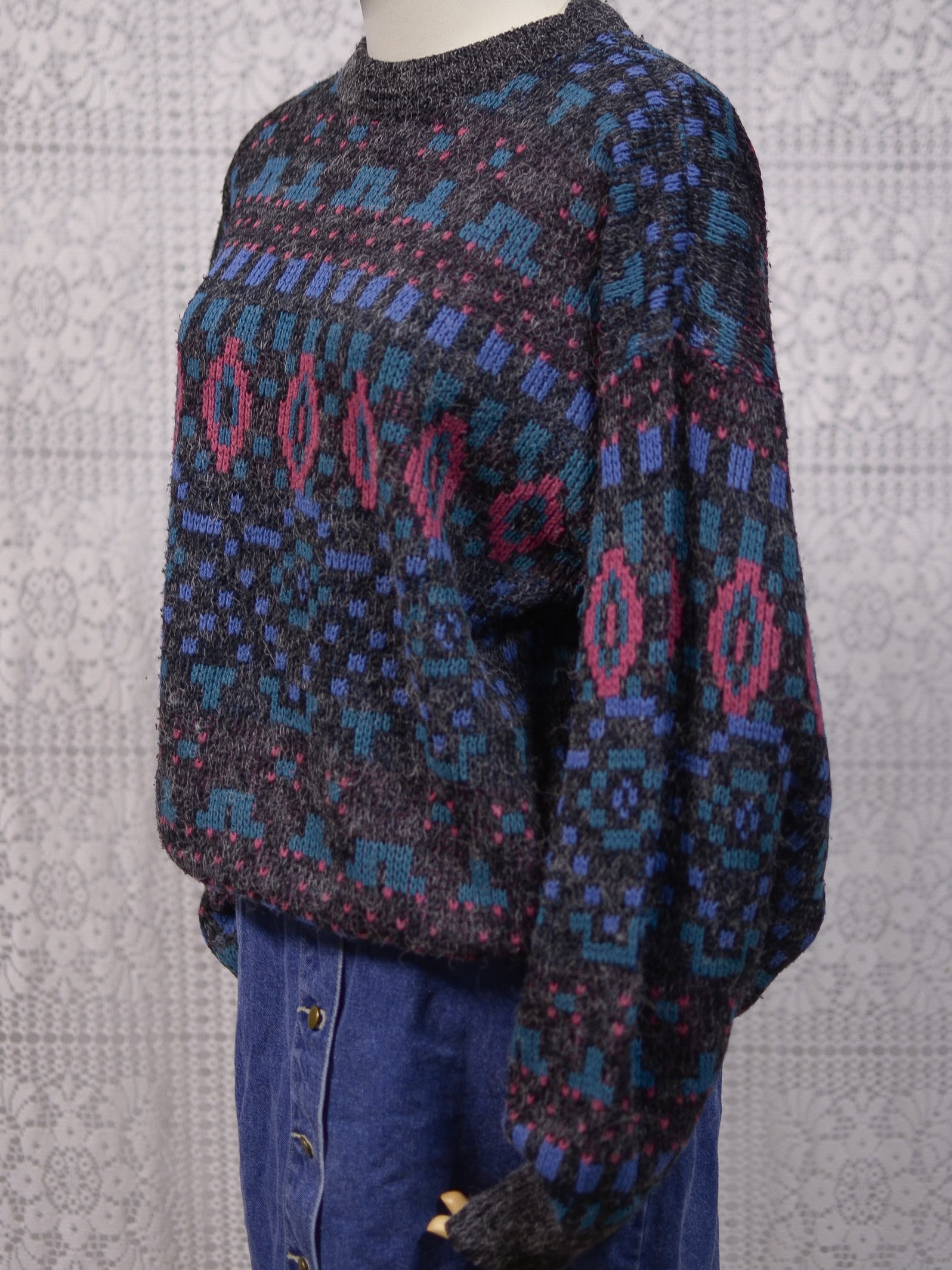 1980s grey, pink, purple and green geometric pattern slouchy jumper