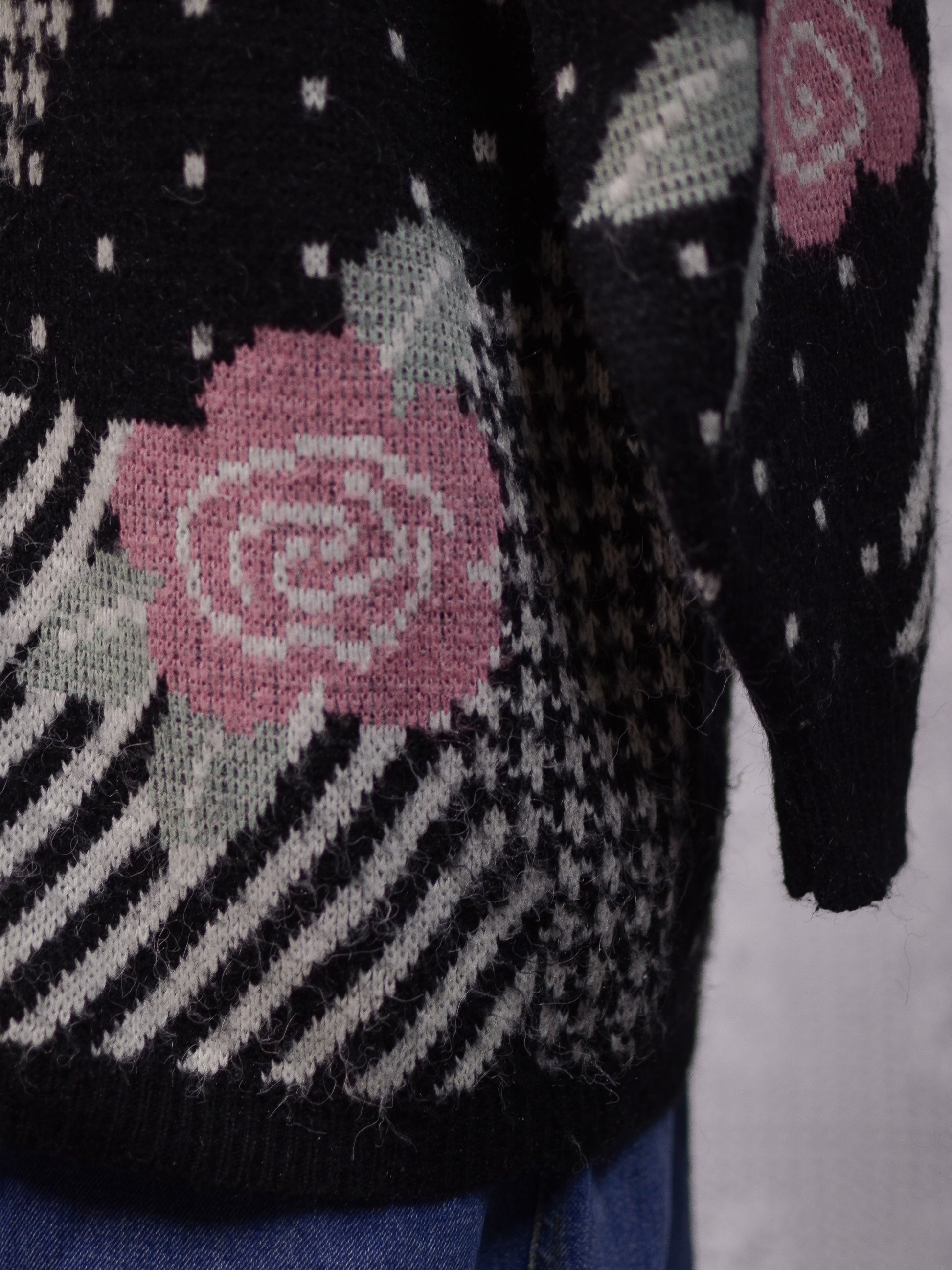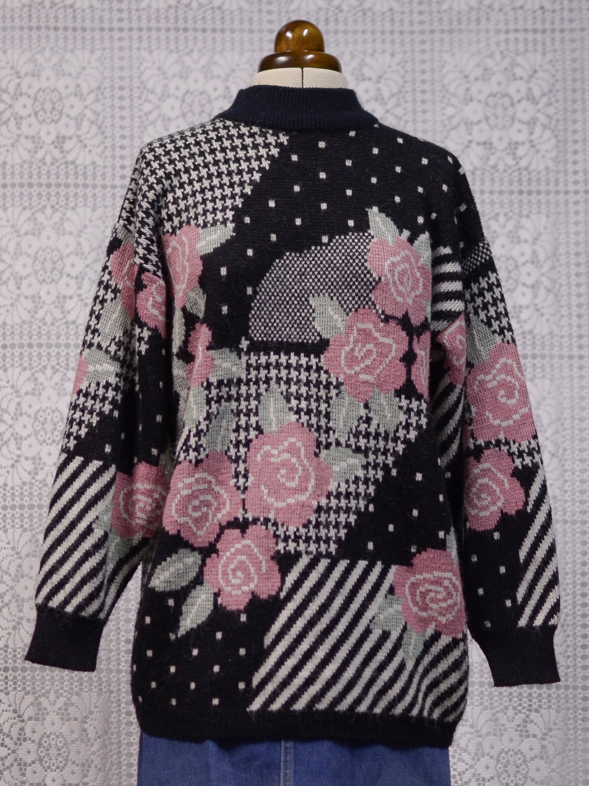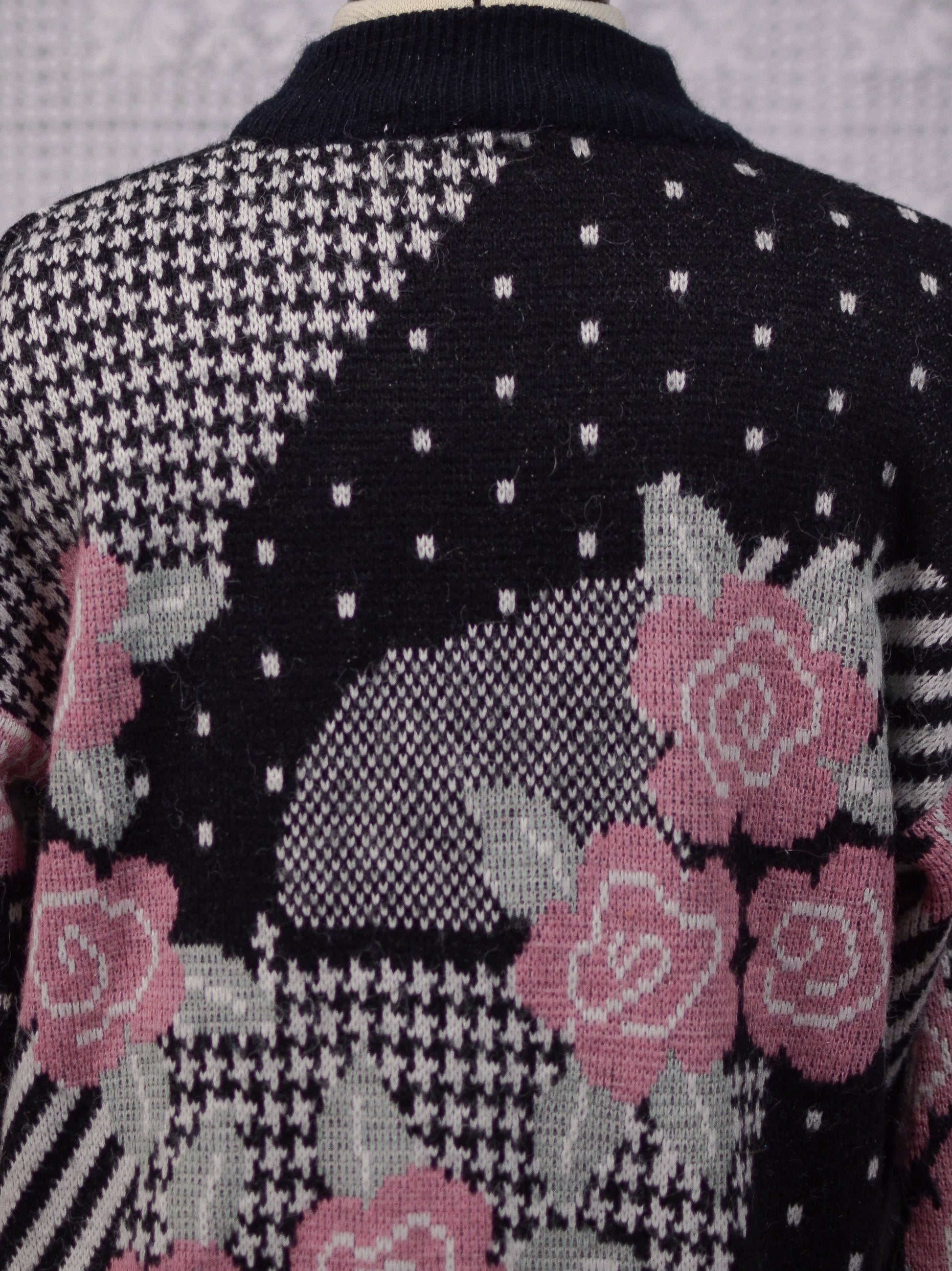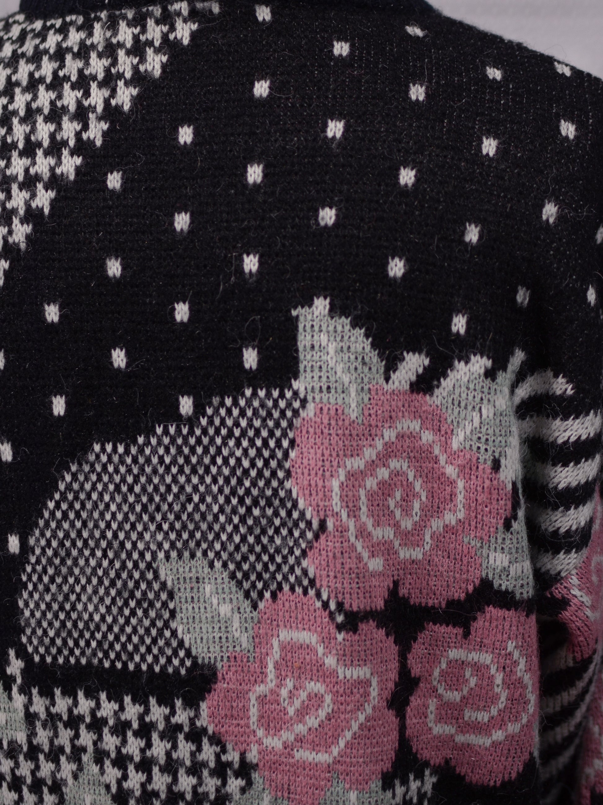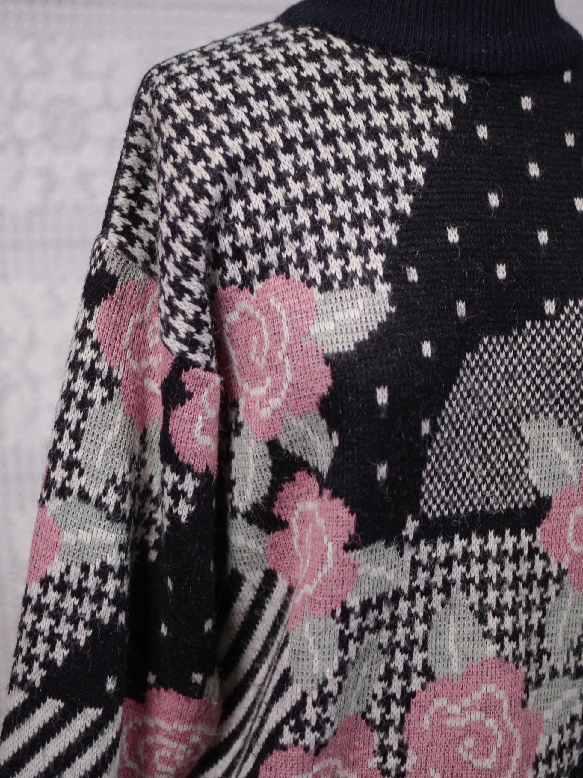 1980s Honey black, white and rose pink floral, polkadot and houndstooth long jumper
