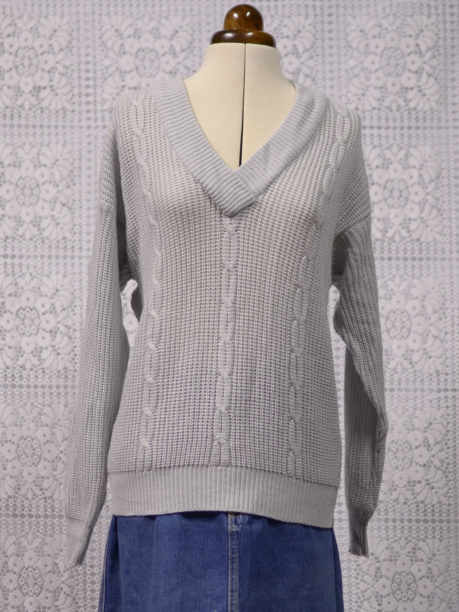 A brilliant 1980s light grey v-neck jumper from C&A with a mix of rib and cable knit. The v-neck is wide and stretches so it can be worn off the shoulder.