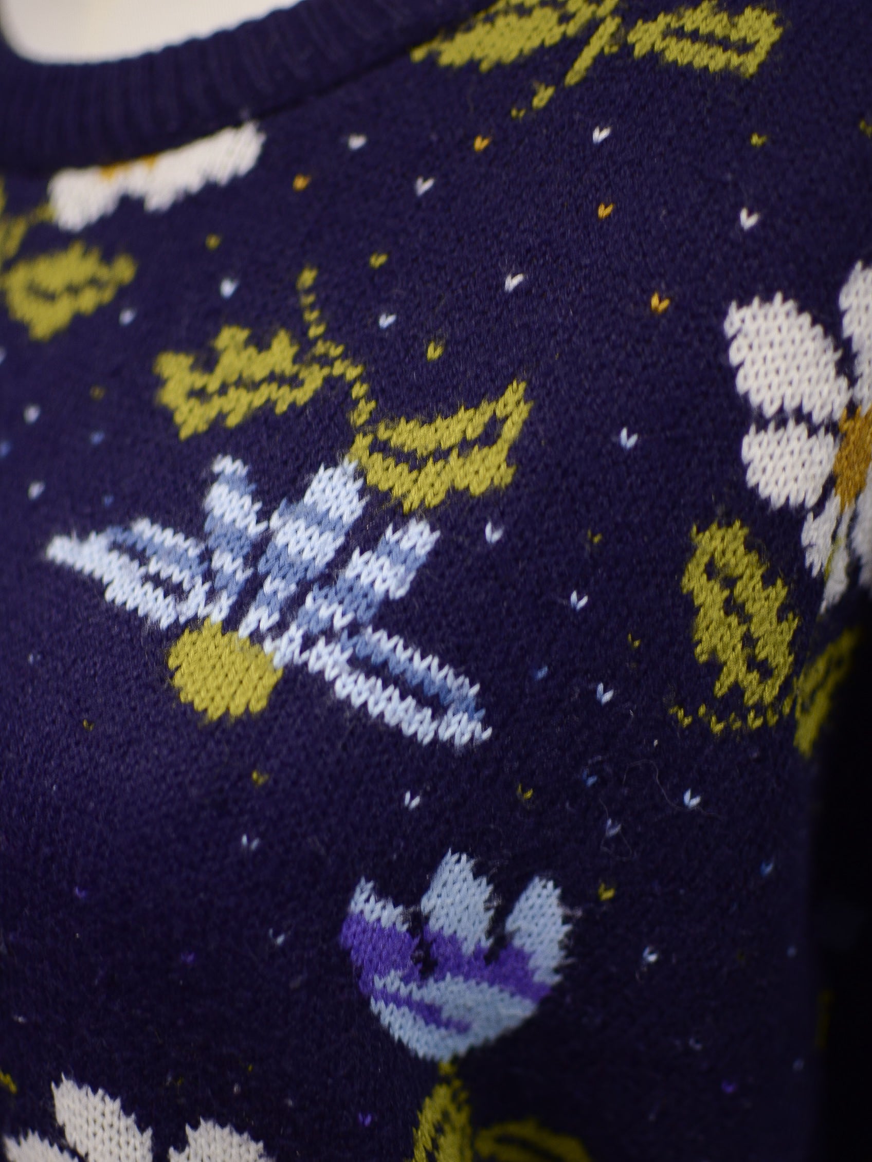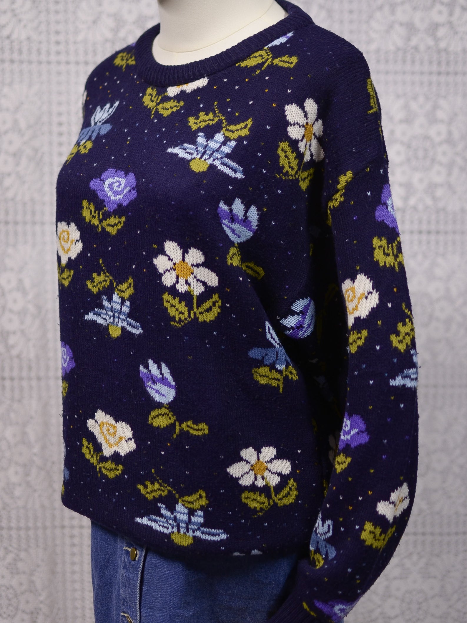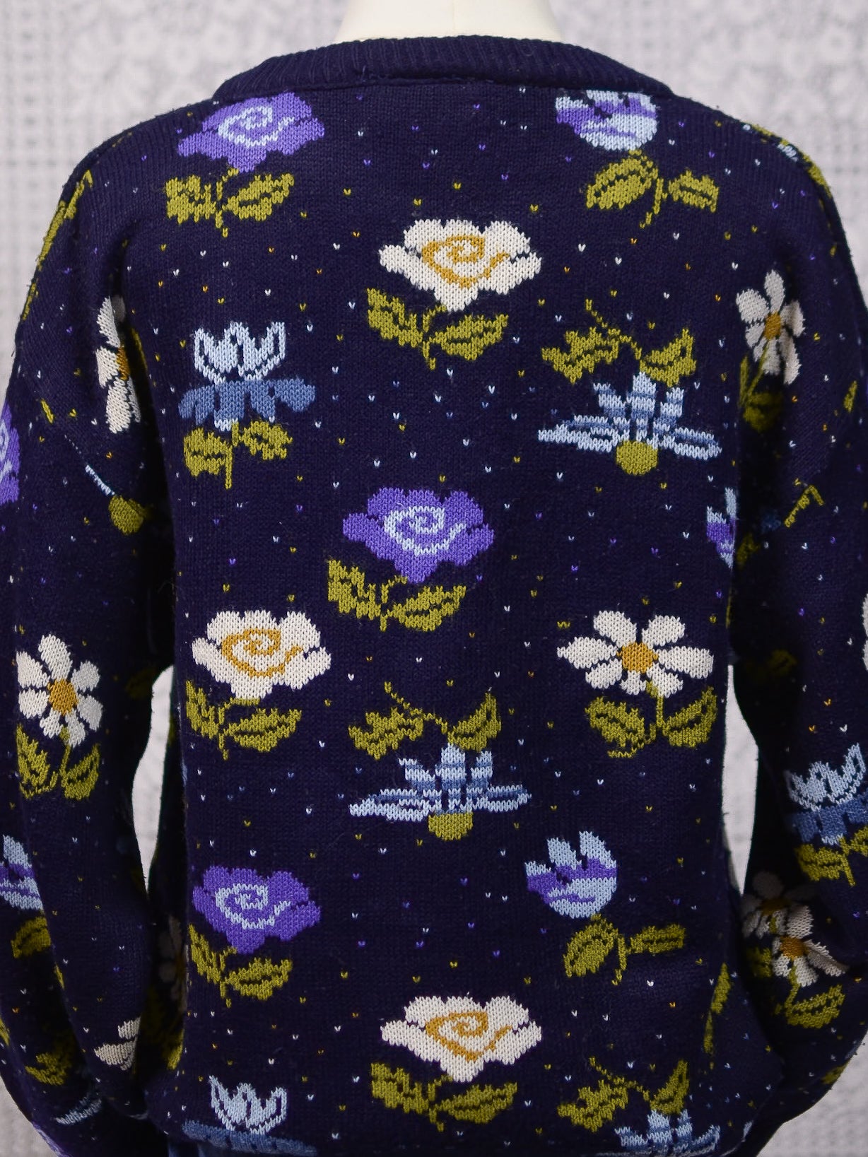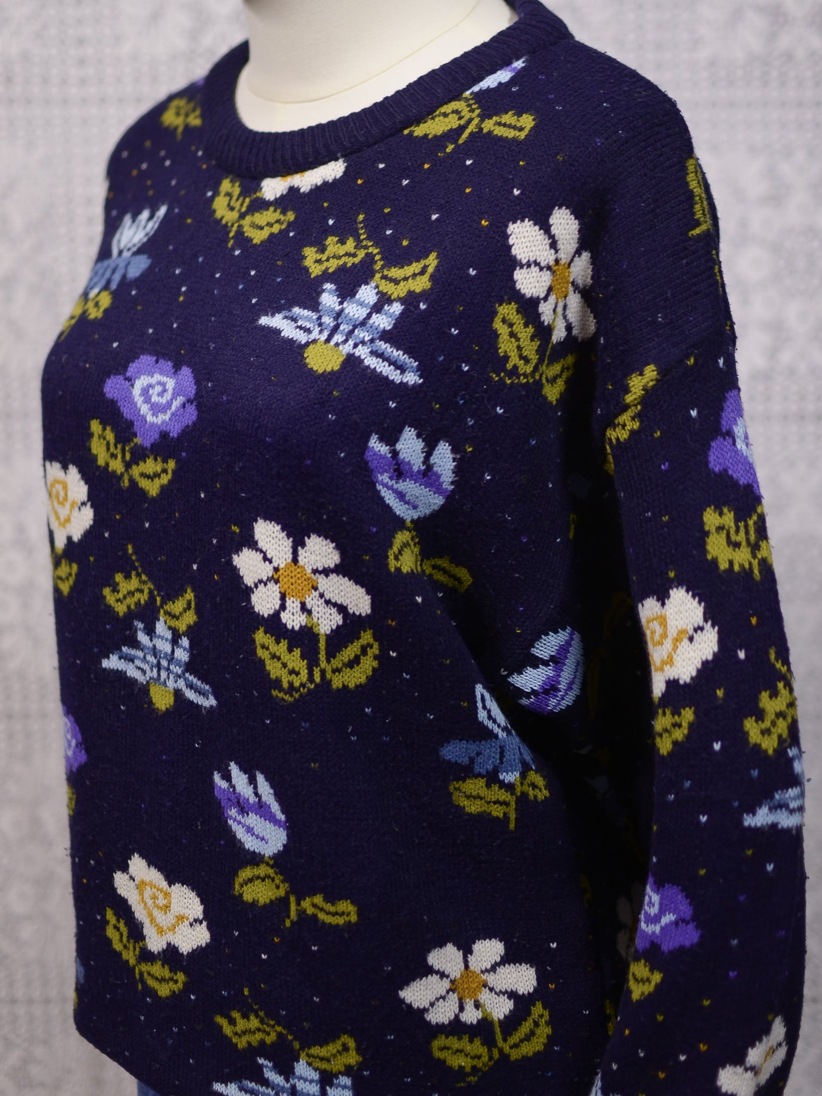 1980s navy blue, purple and white floral pattern jumper