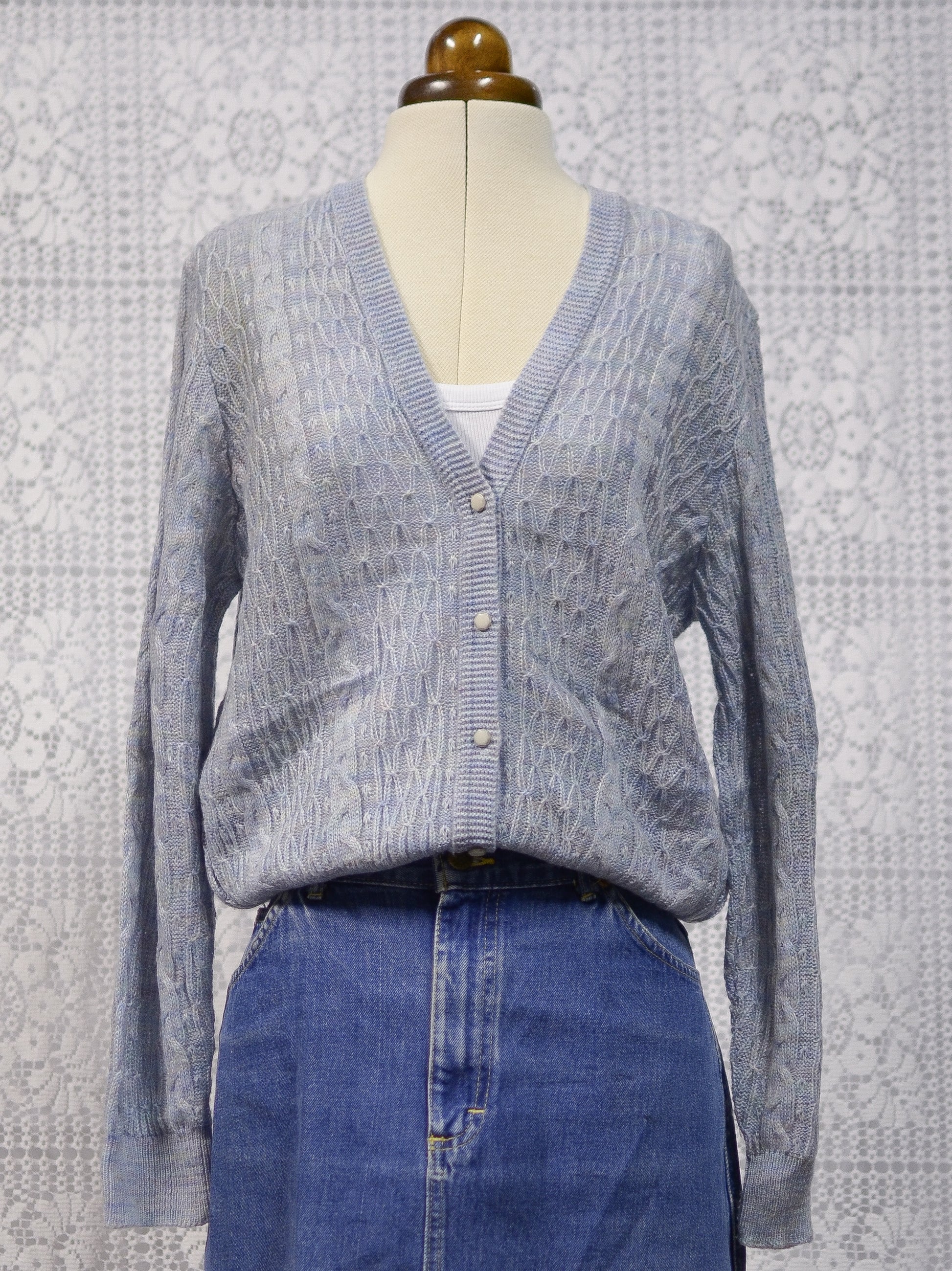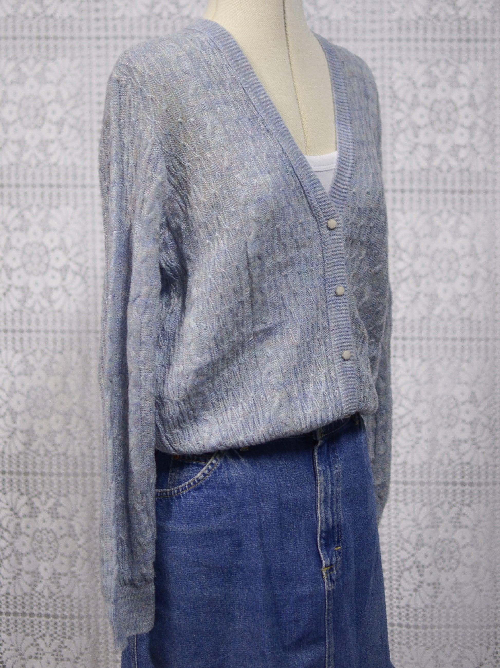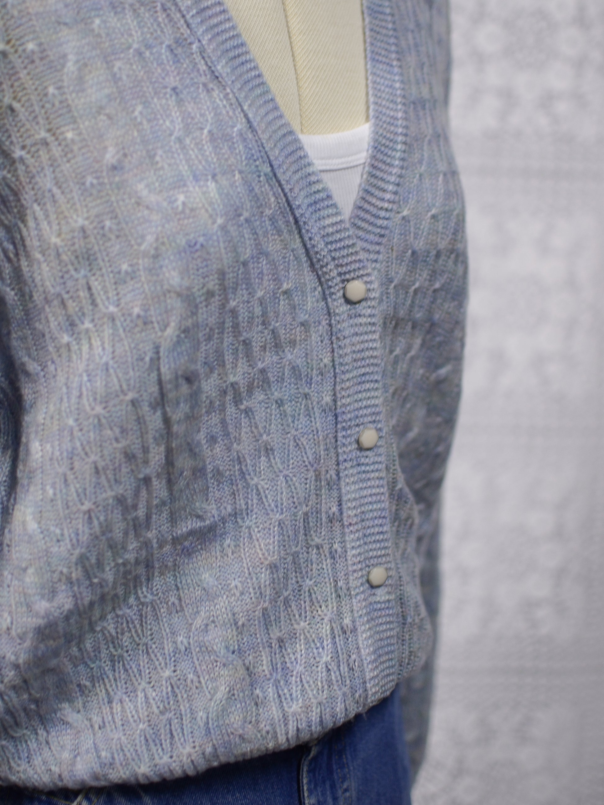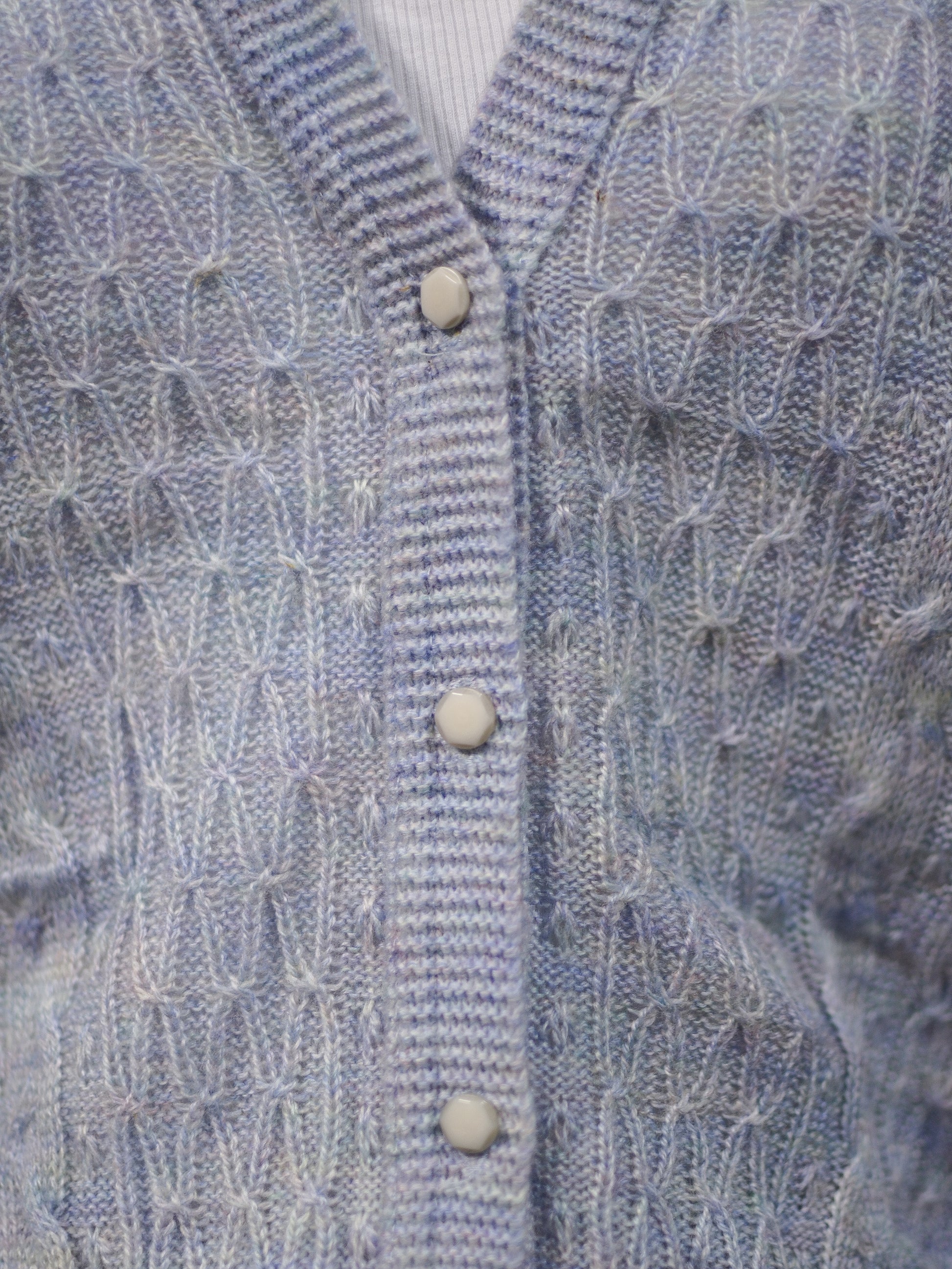 A beautiful lightweight cardigan knitted in a variegated pale blue and lilac yarn in a textured cable style. A nice little cover up for any season and very versatile.