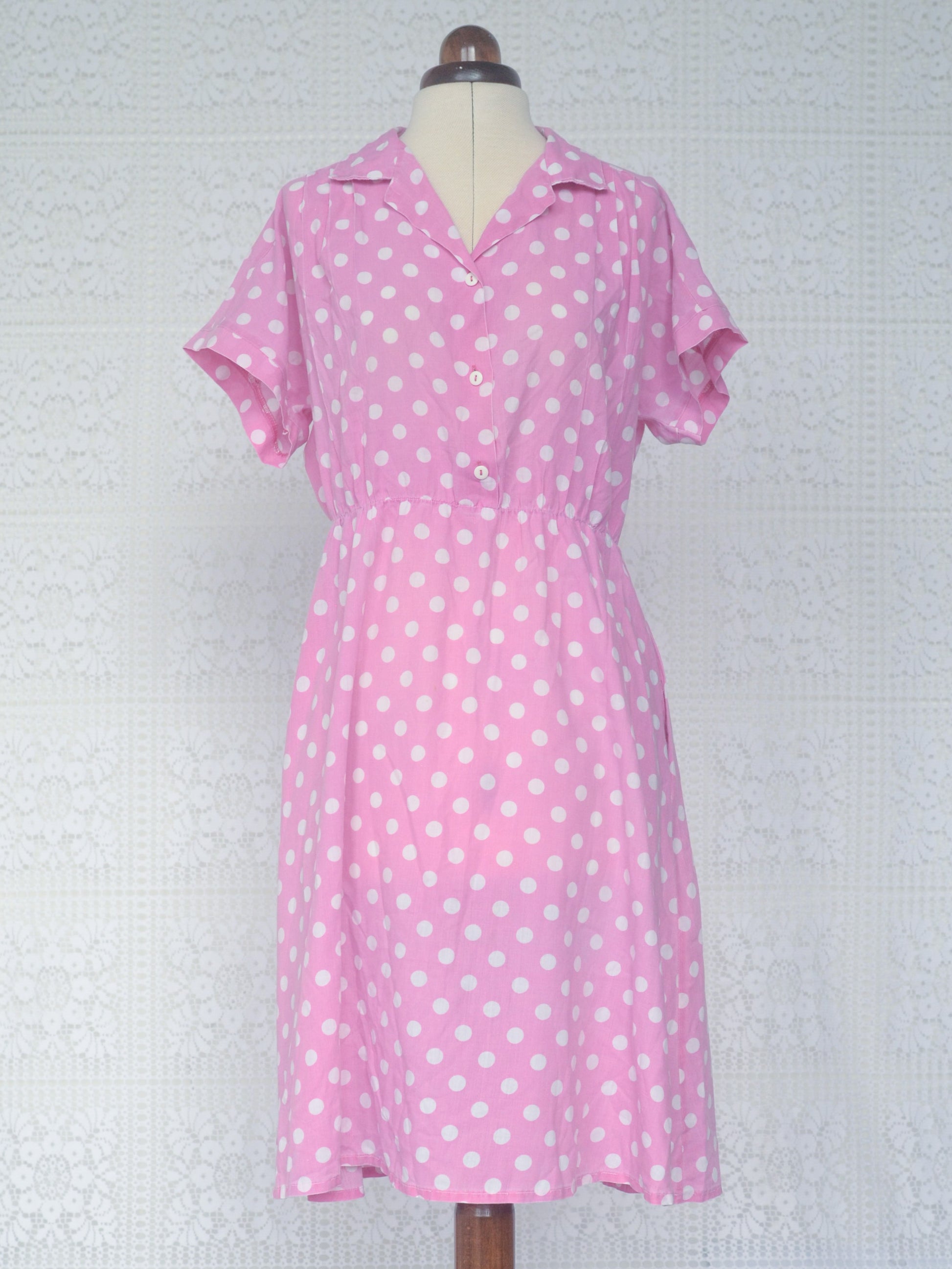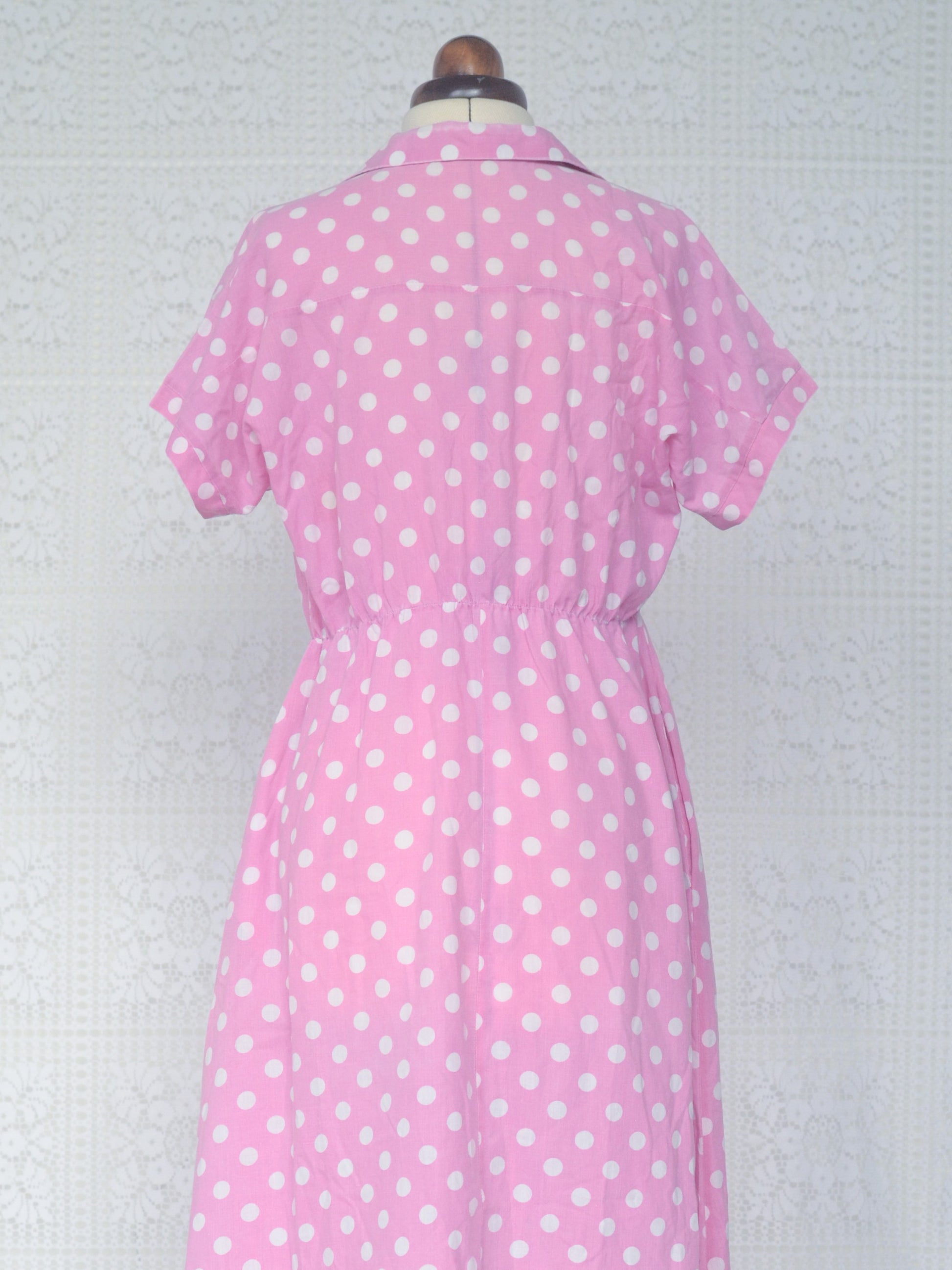 1980s style pink and white polkadot short sleeve shirt midi dress
