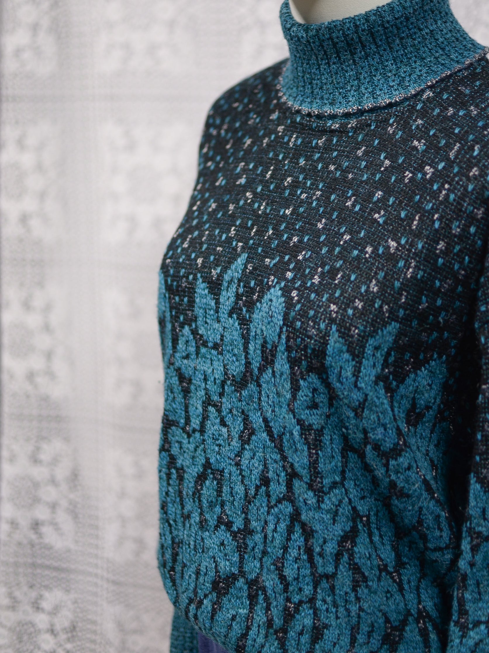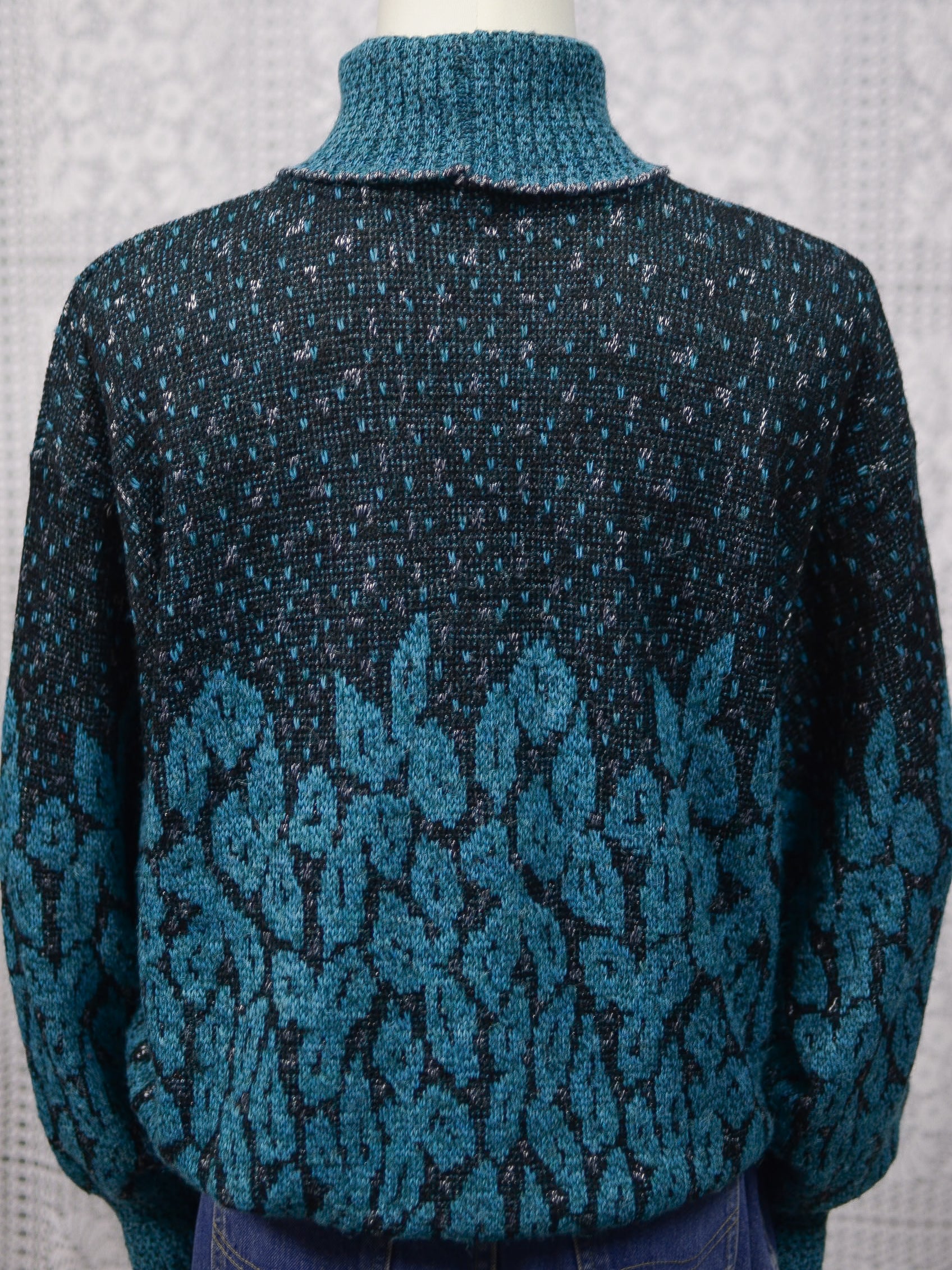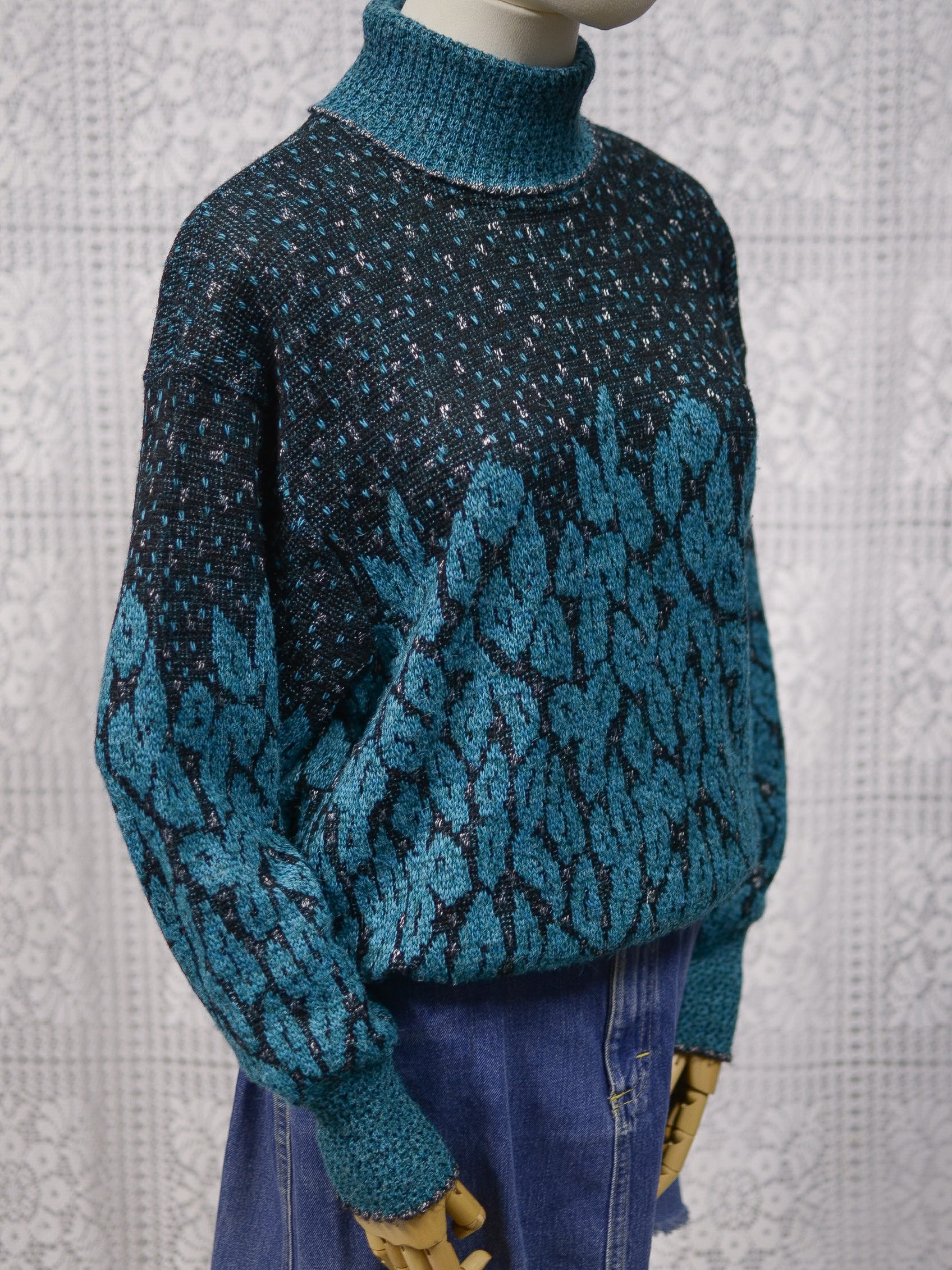 Get cosy in this 80s batwing high neck jumper from Danish vintage brand Quimo, featuring a leaf pattern in green and blue yarn and contrasting black, with sparkly silver details for an added bit of glam.