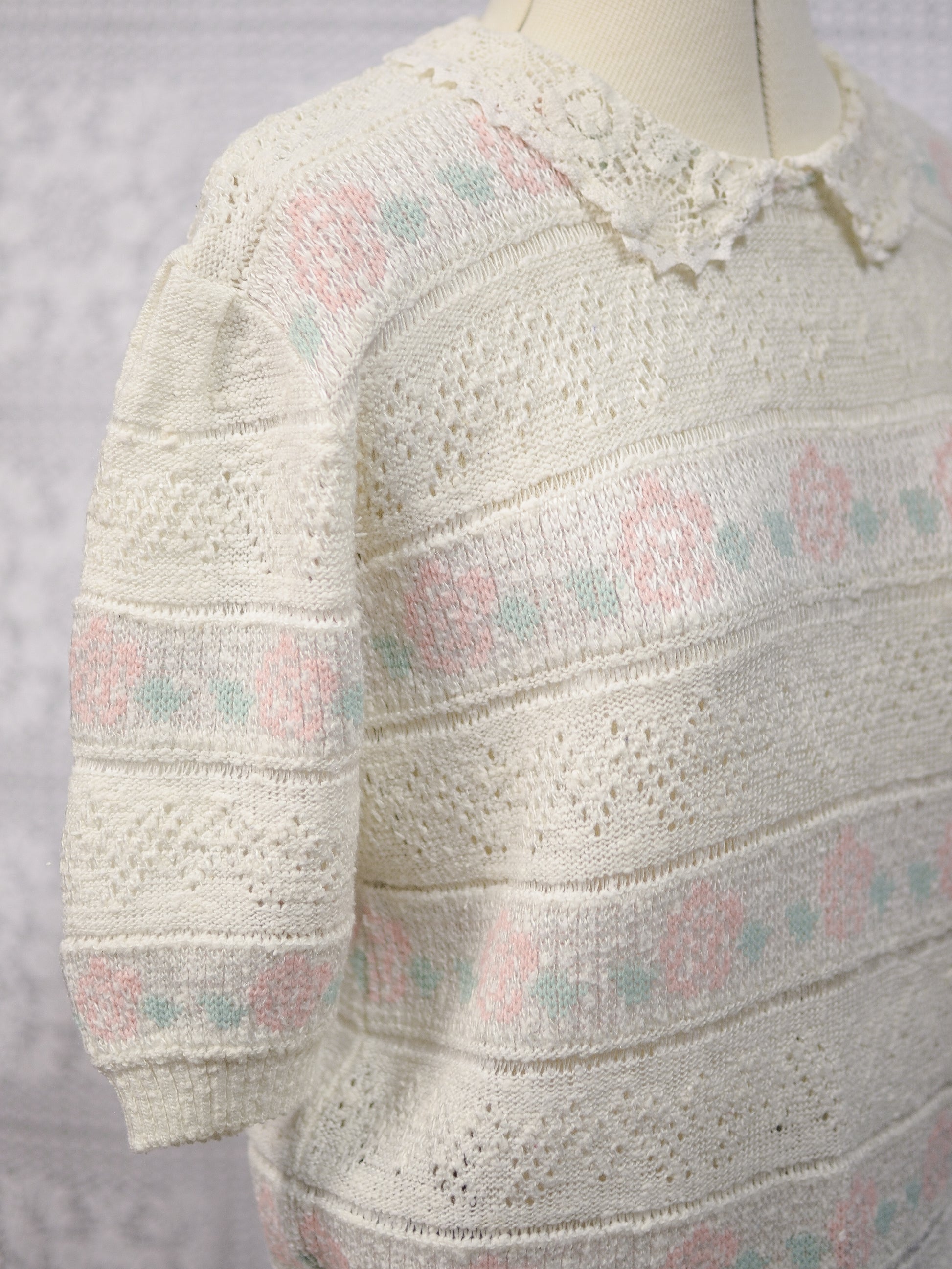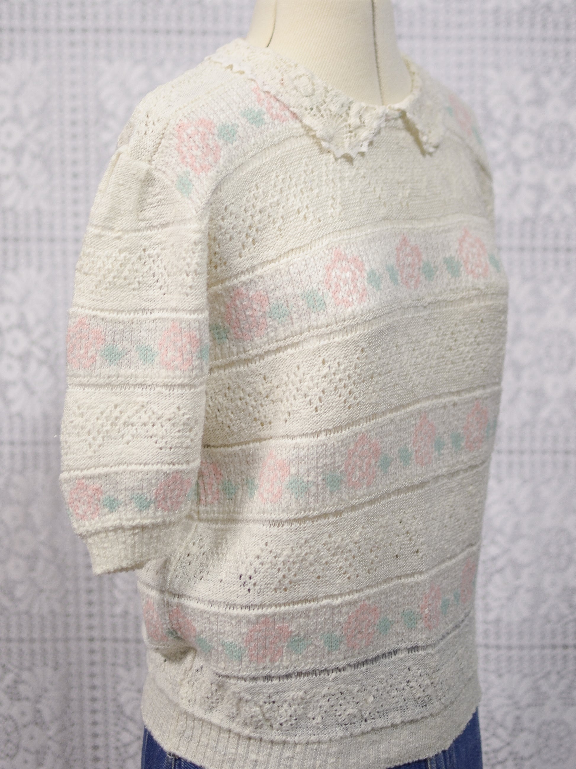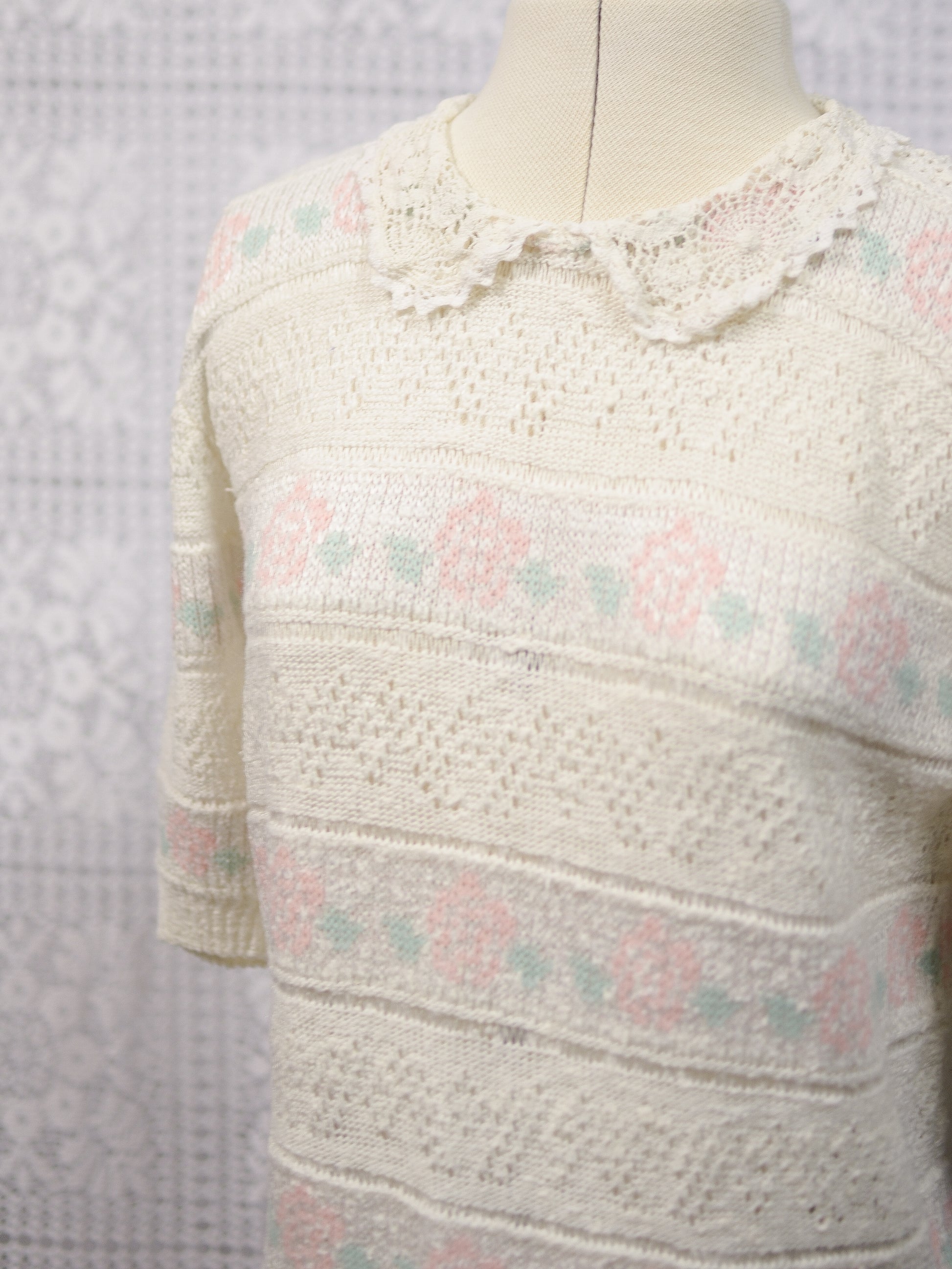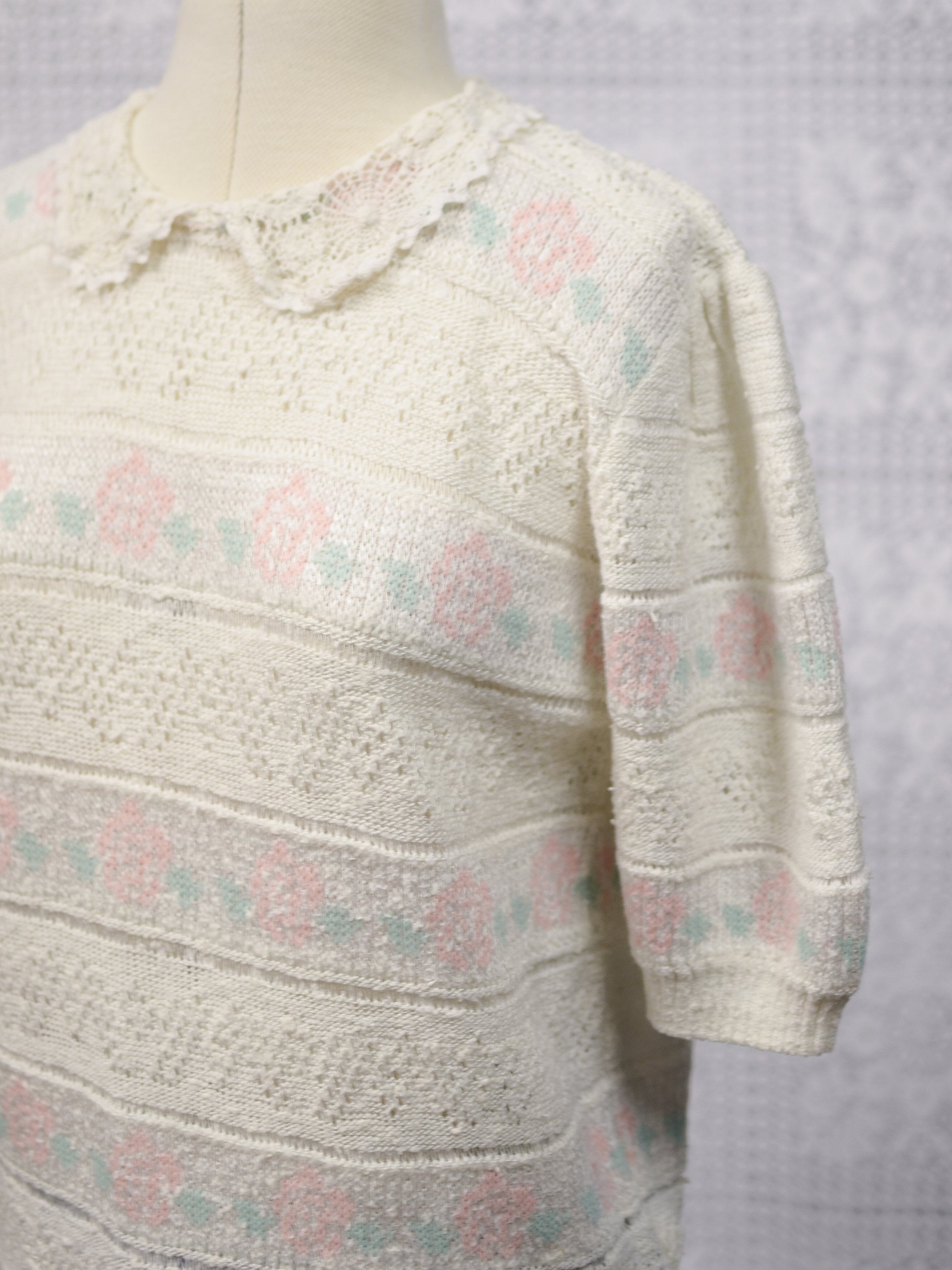 1980s white and pink rose pattern lace collar short sleeve jumper