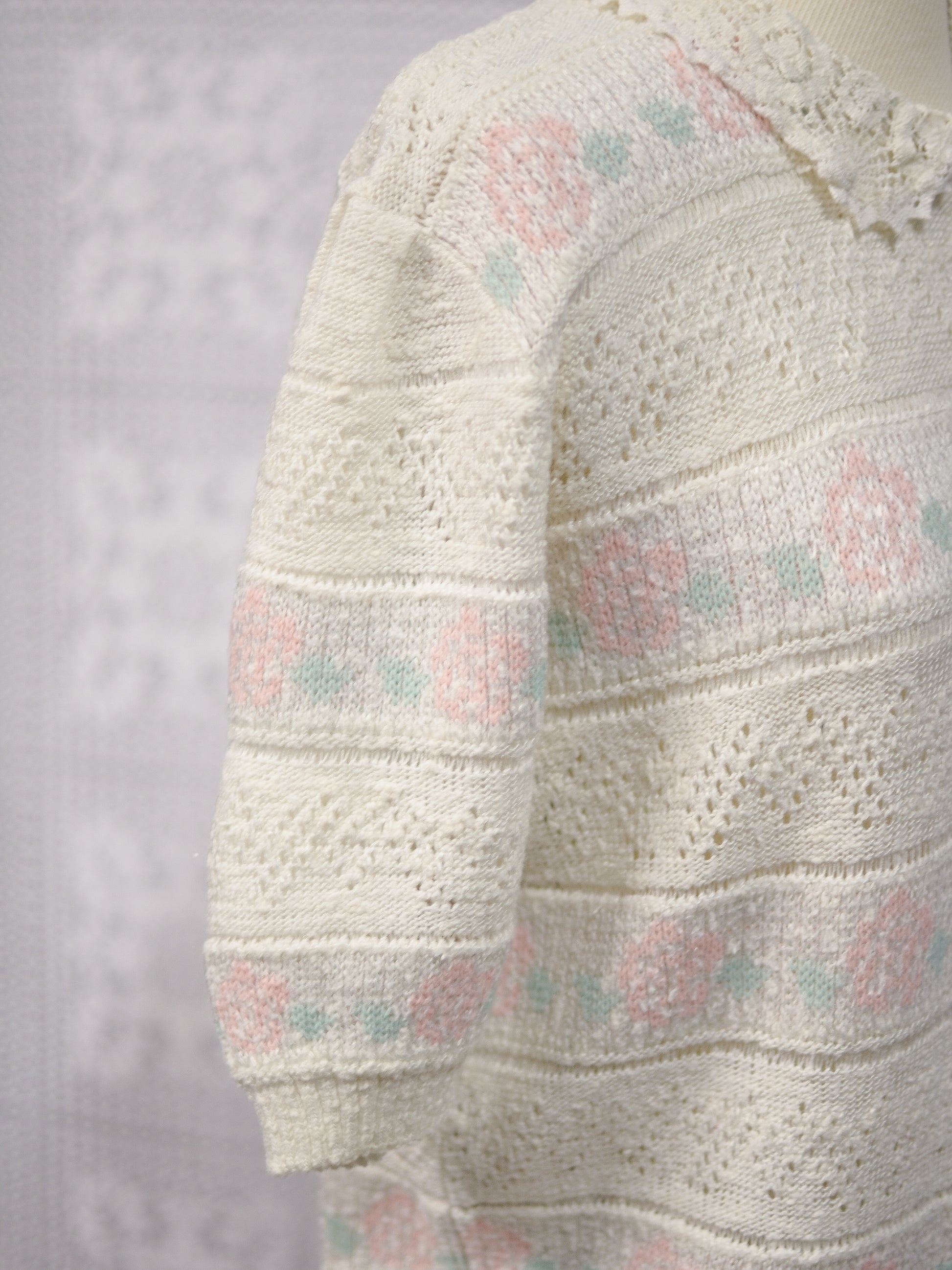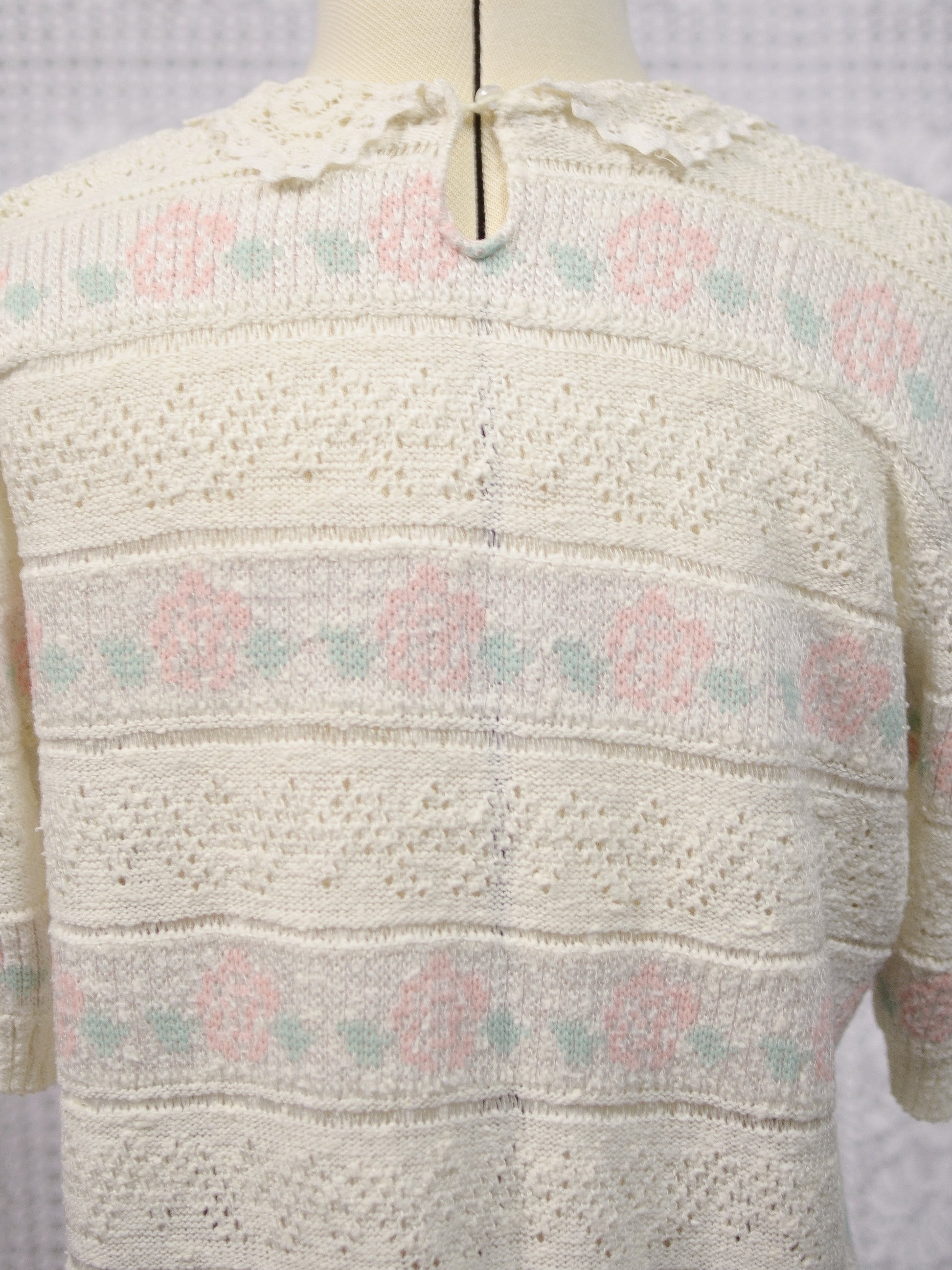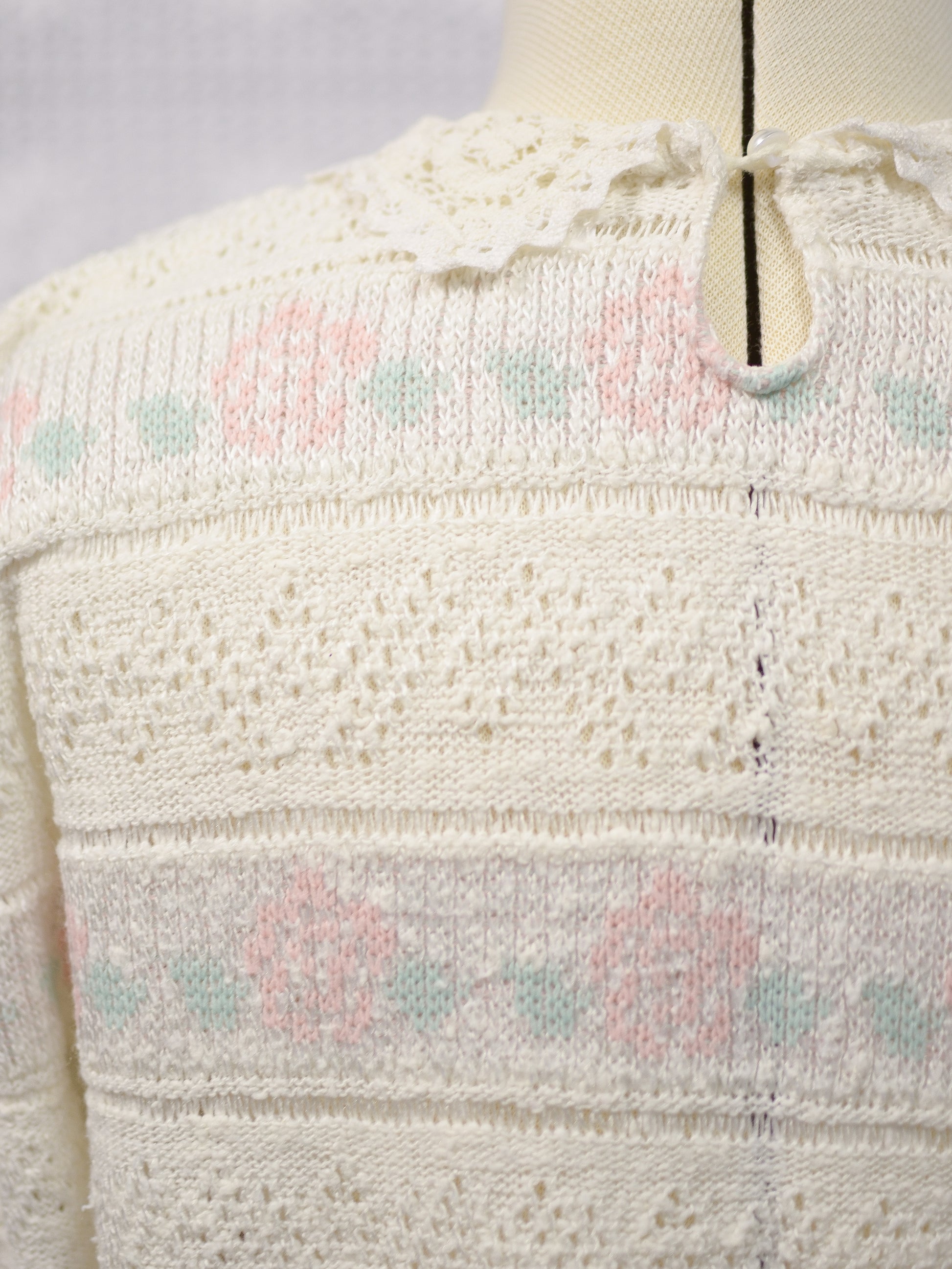 1980s white and pink rose pattern lace collar short sleeve jumper