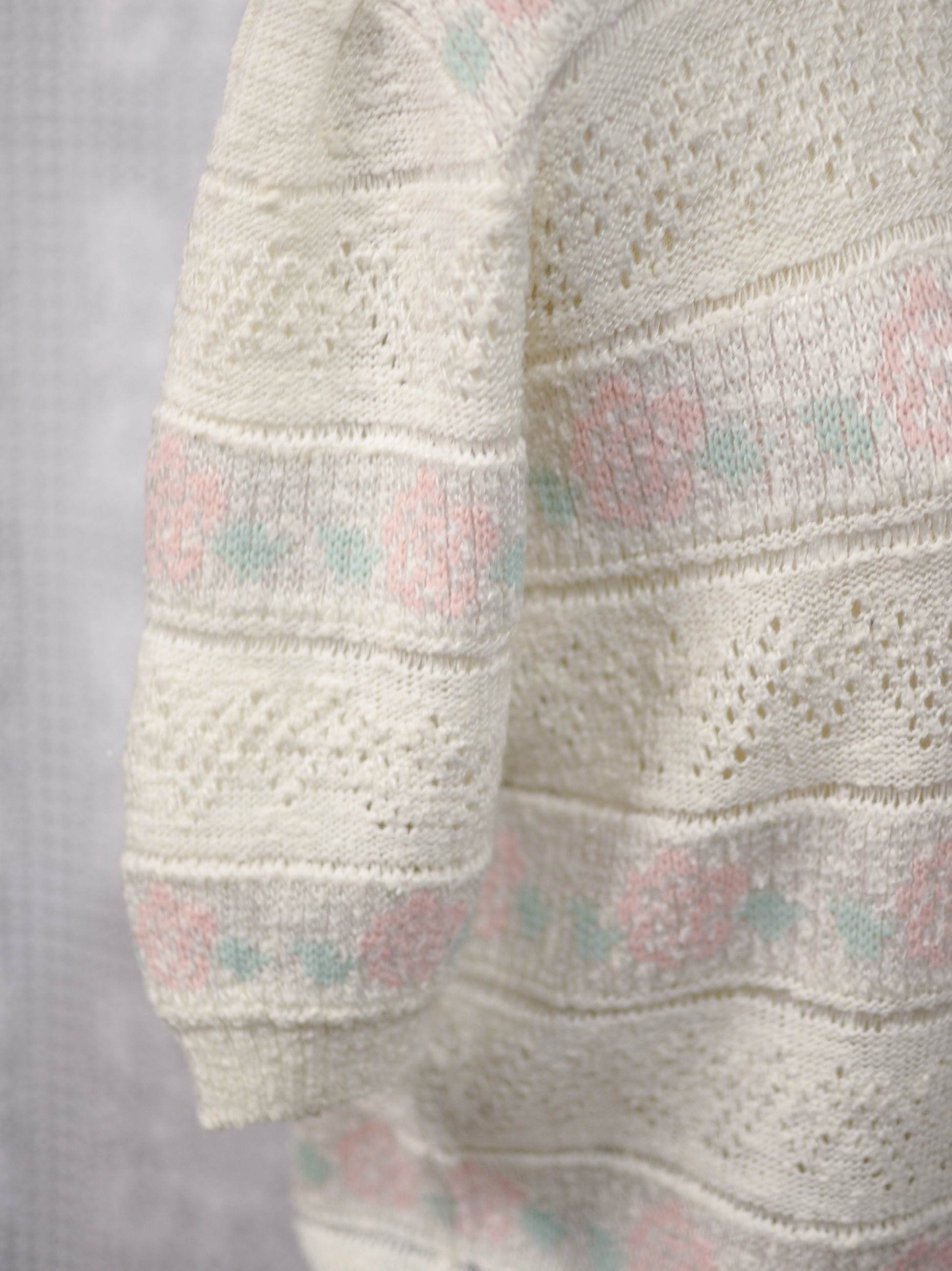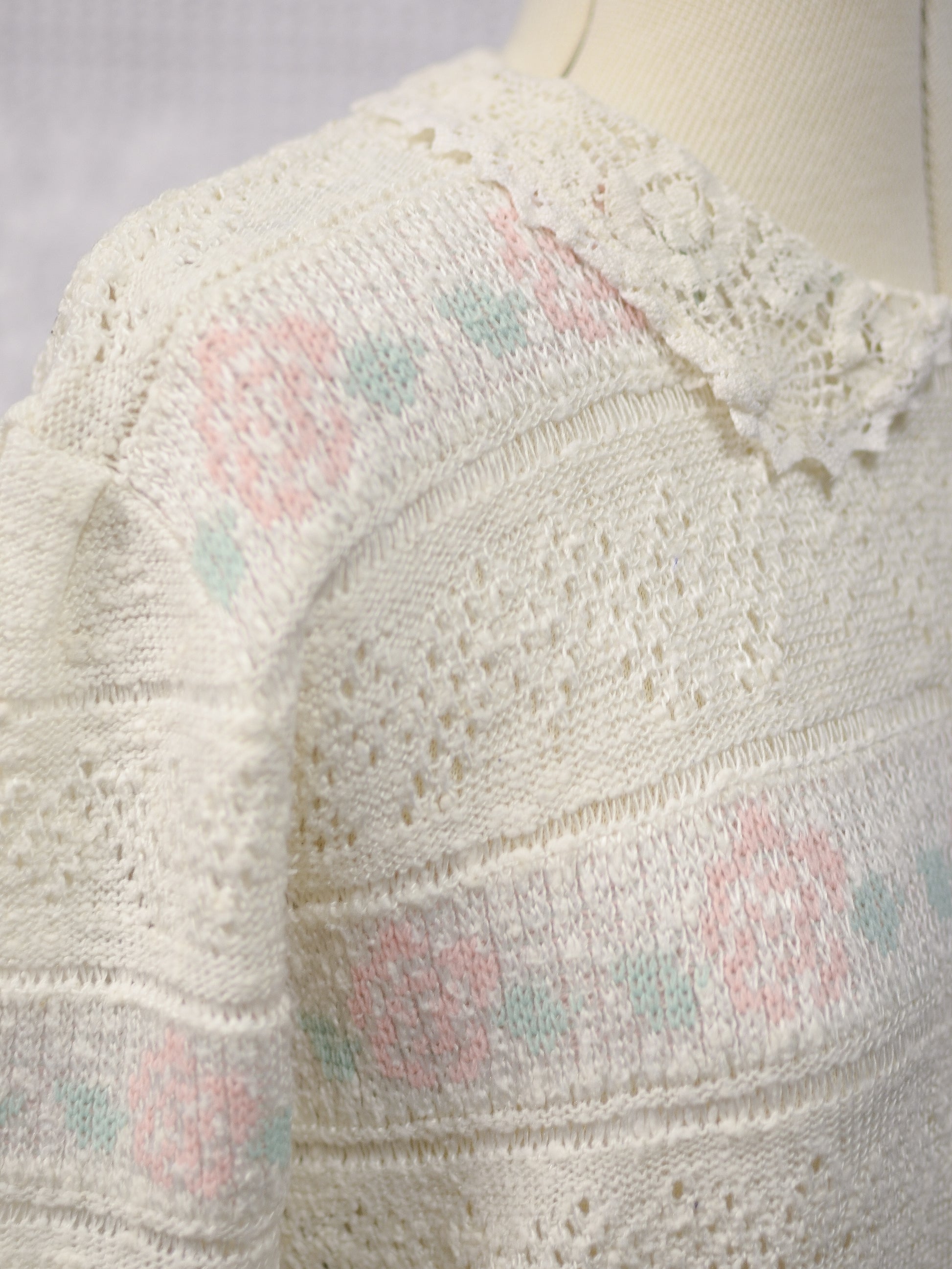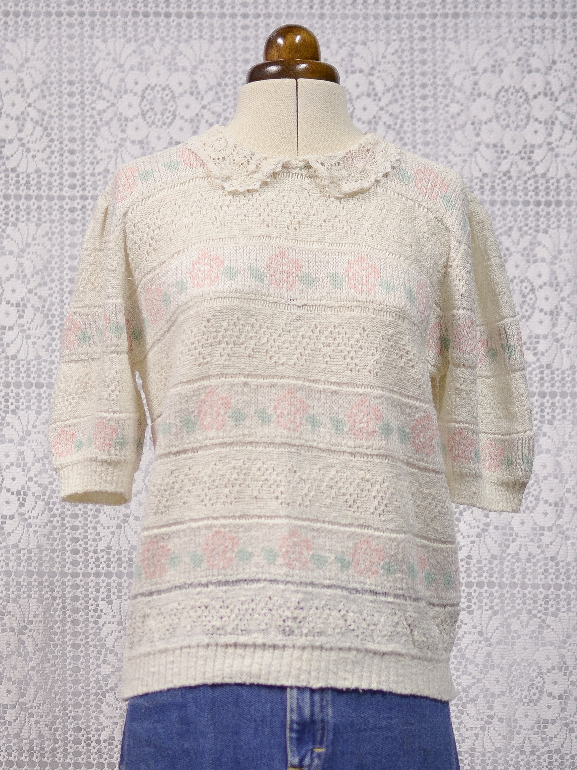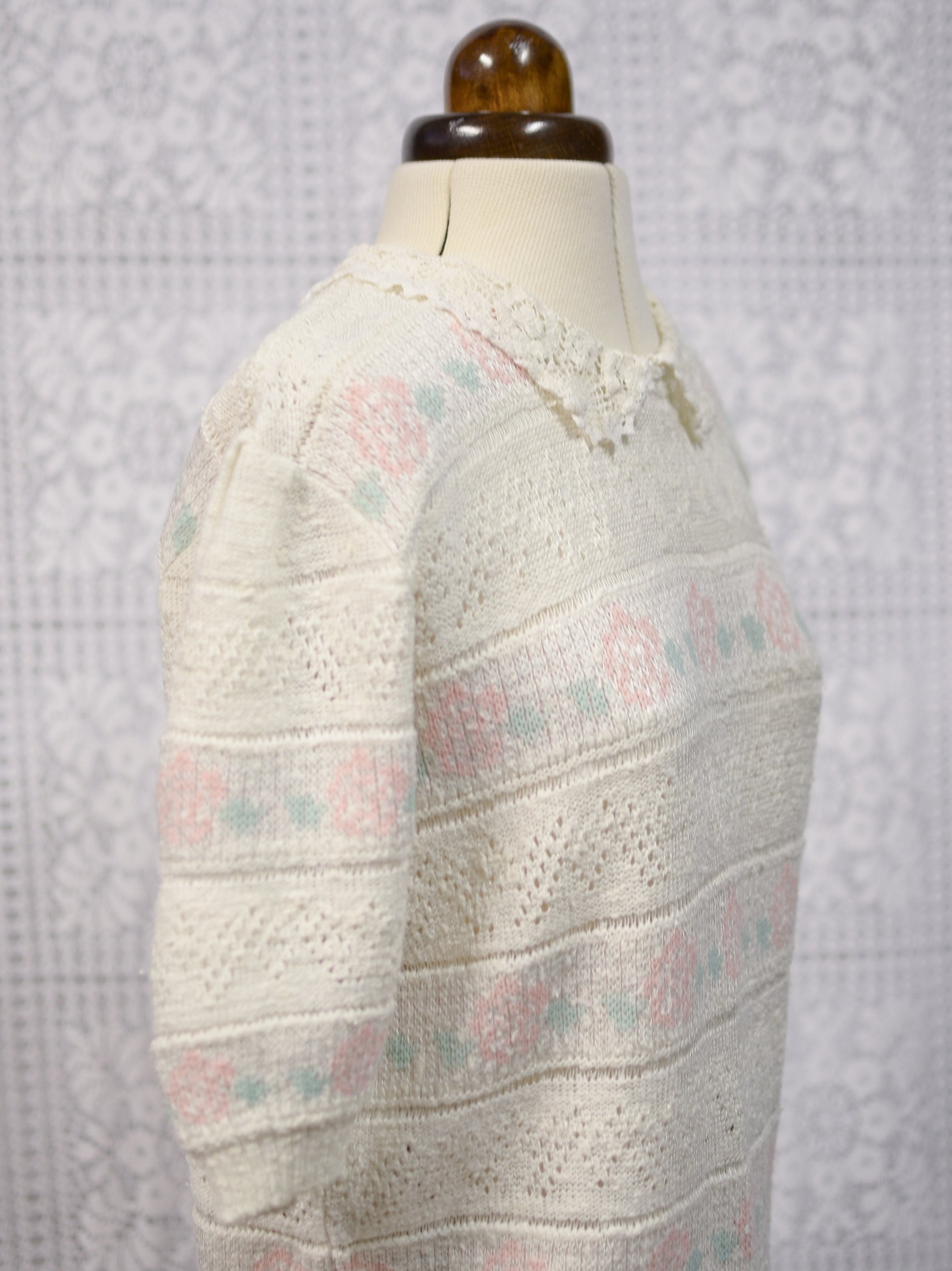 1980s white and pink rose pattern lace collar short sleeve jumper