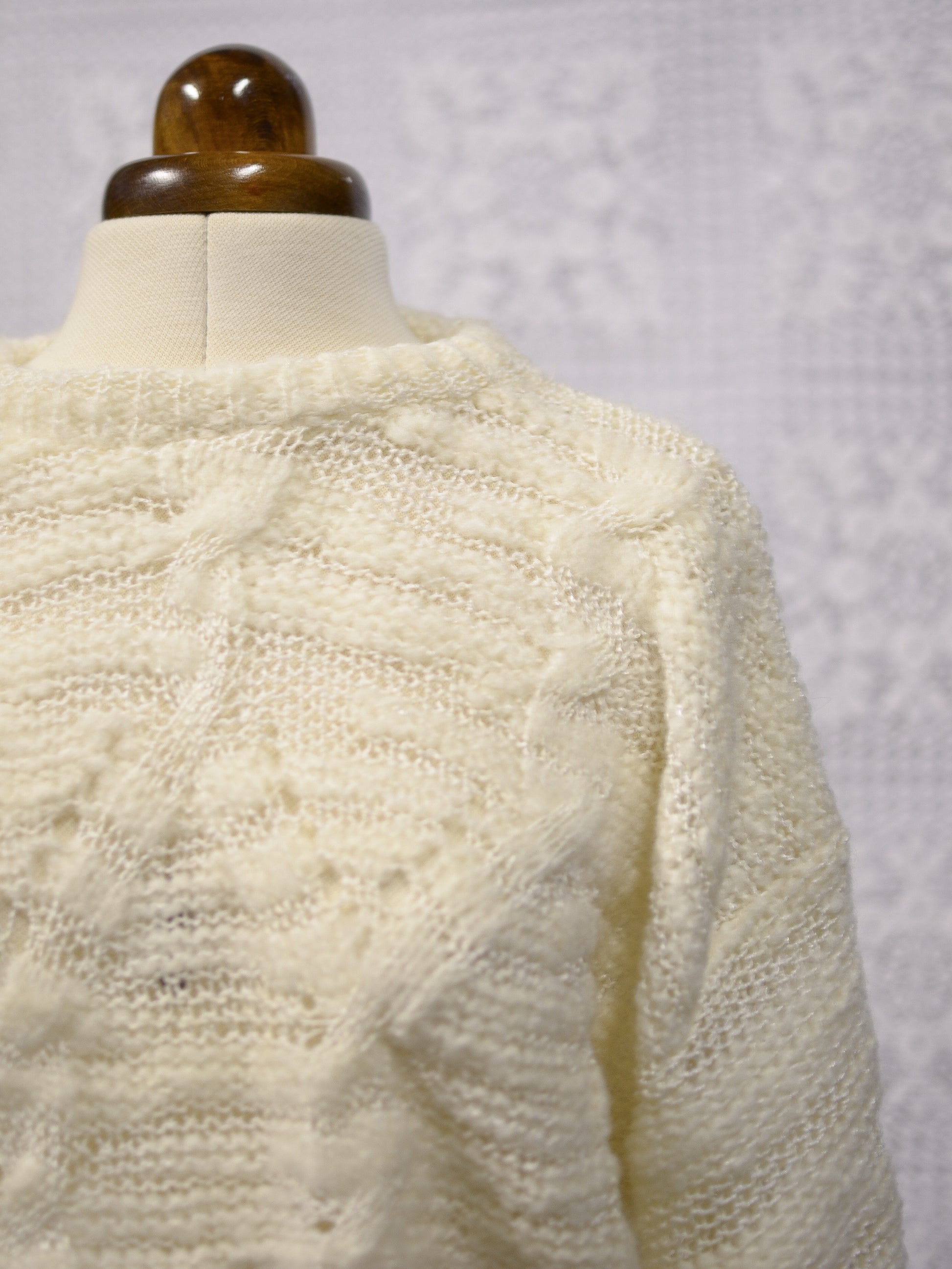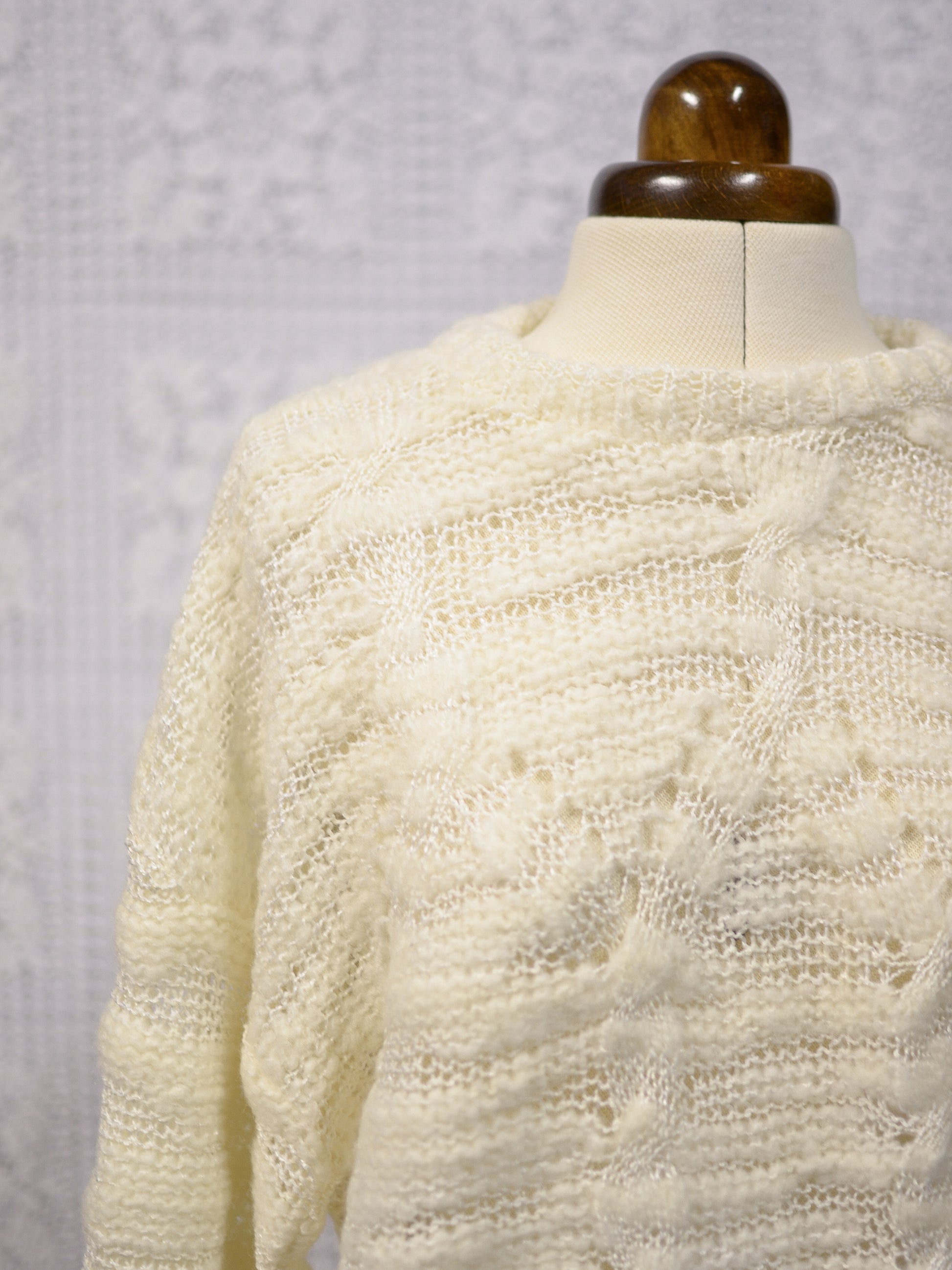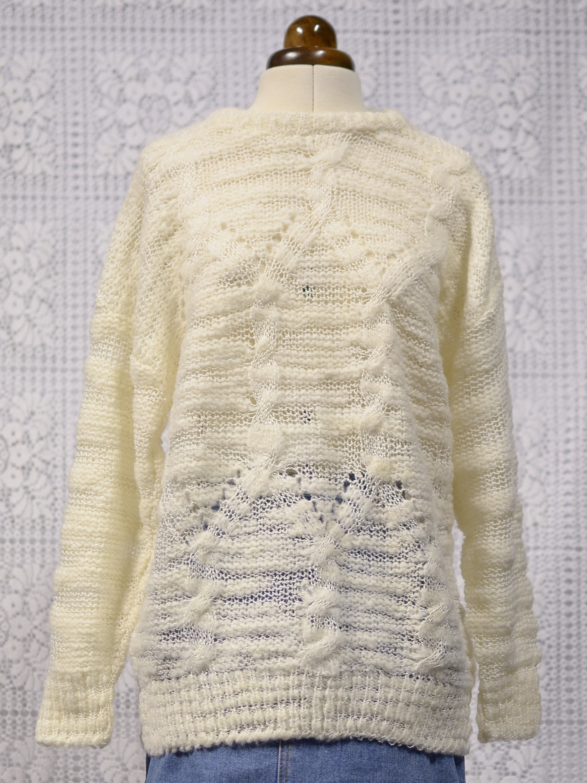 A really cosy fluffy jumper knitted in a ribbed cable/arran style. It is long line so comes down to the hips. Perfect for autumn and winter.