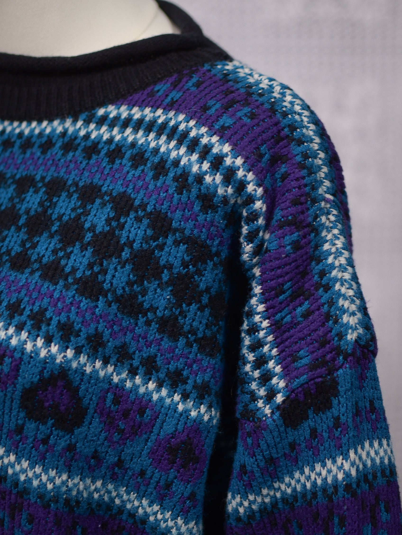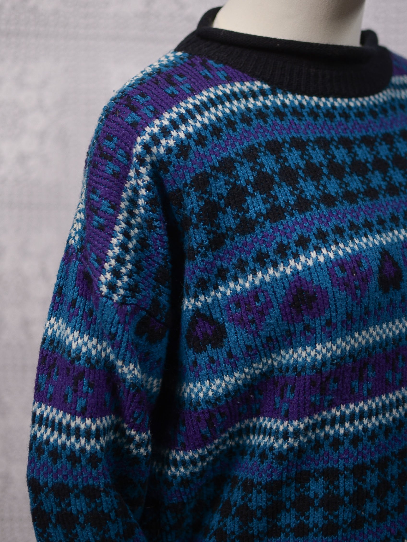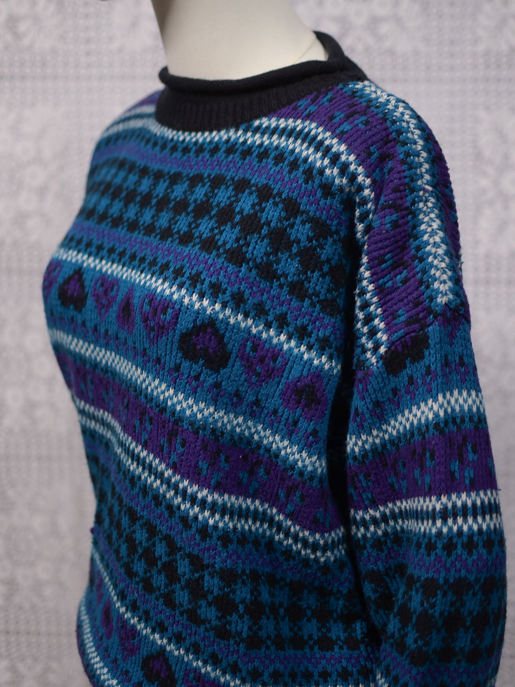 1990s Stefano black, turquoise and purple heart and stripe pattern jumper